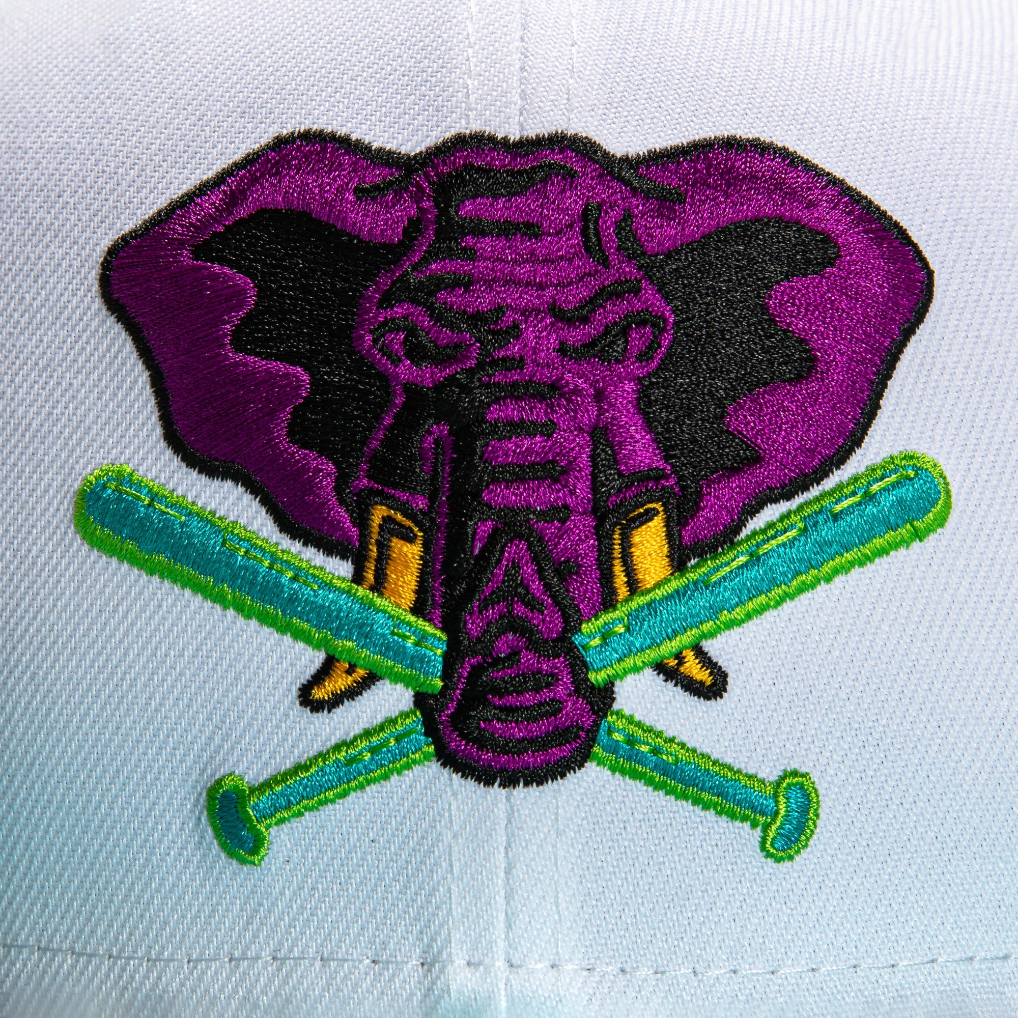 This New Era Dogtown Oakland Athletics 40th Anniversary Patch Stomper 59FIFTY Fitted Hat has a white six panel structured high crown and embroidered eyelets with a teal fabric squatchee button. The fitted cap has a teal flat bill with a lime green undervisor. The front panel features the Oakland Athletics logo embroidery and a  side patch embroidery on the right panel. The left panel of the fitted displays the New Era logo and the official MLB logo embroidery on the rear crown.