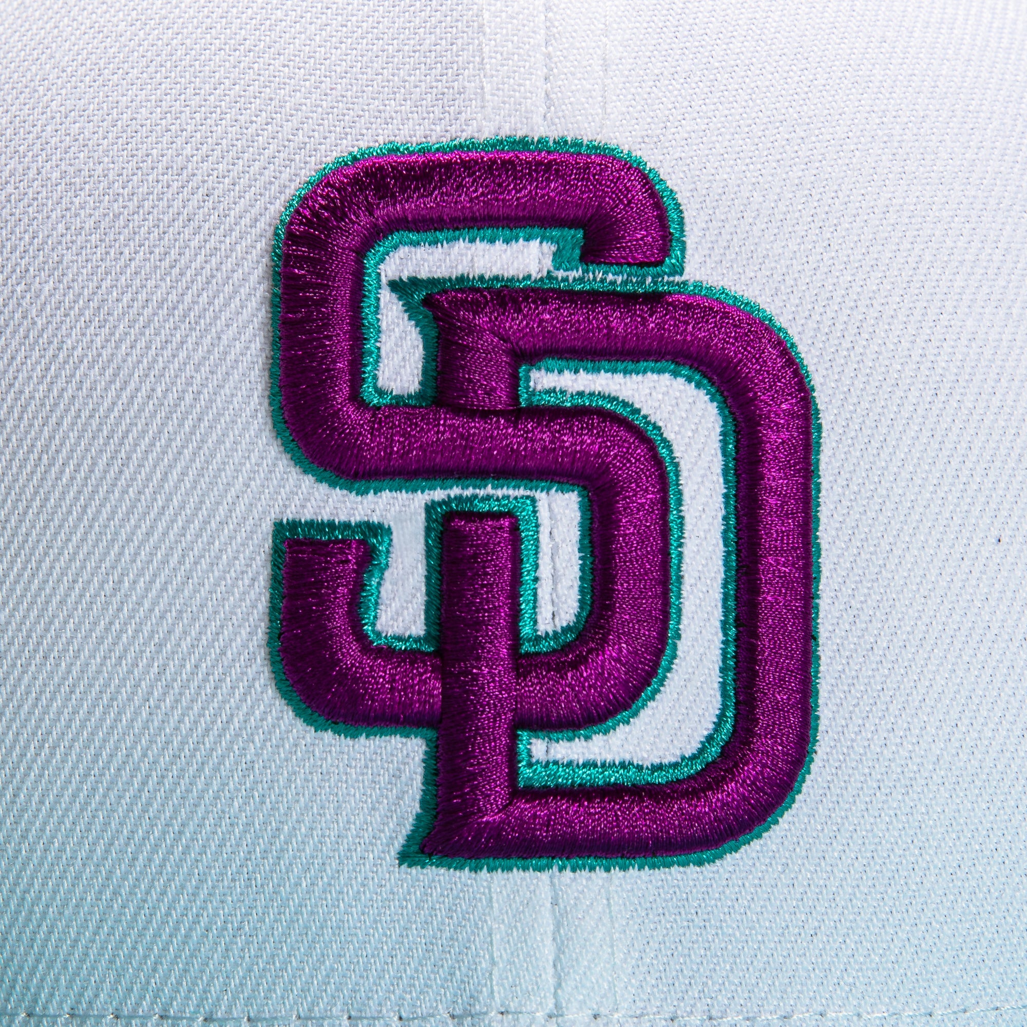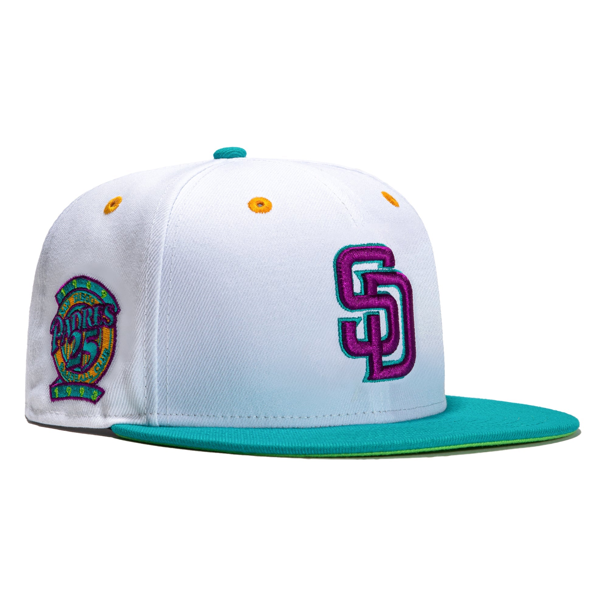 This New Era Dogtown San Diego Padres 25th Anniversary 59FIFTY Fitted Hat has a white six panel structured high crown and embroidered eyelets with a teal fabric squatchee button. The fitted cap has a teal flat bill with a lime green undervisor. The front panel features the San Diego Padres logo embroidery and a side patch embroidery on the right panel. The left panel of the fitted displays the New Era logo and the official MLB logo embroidery on the rear crown.