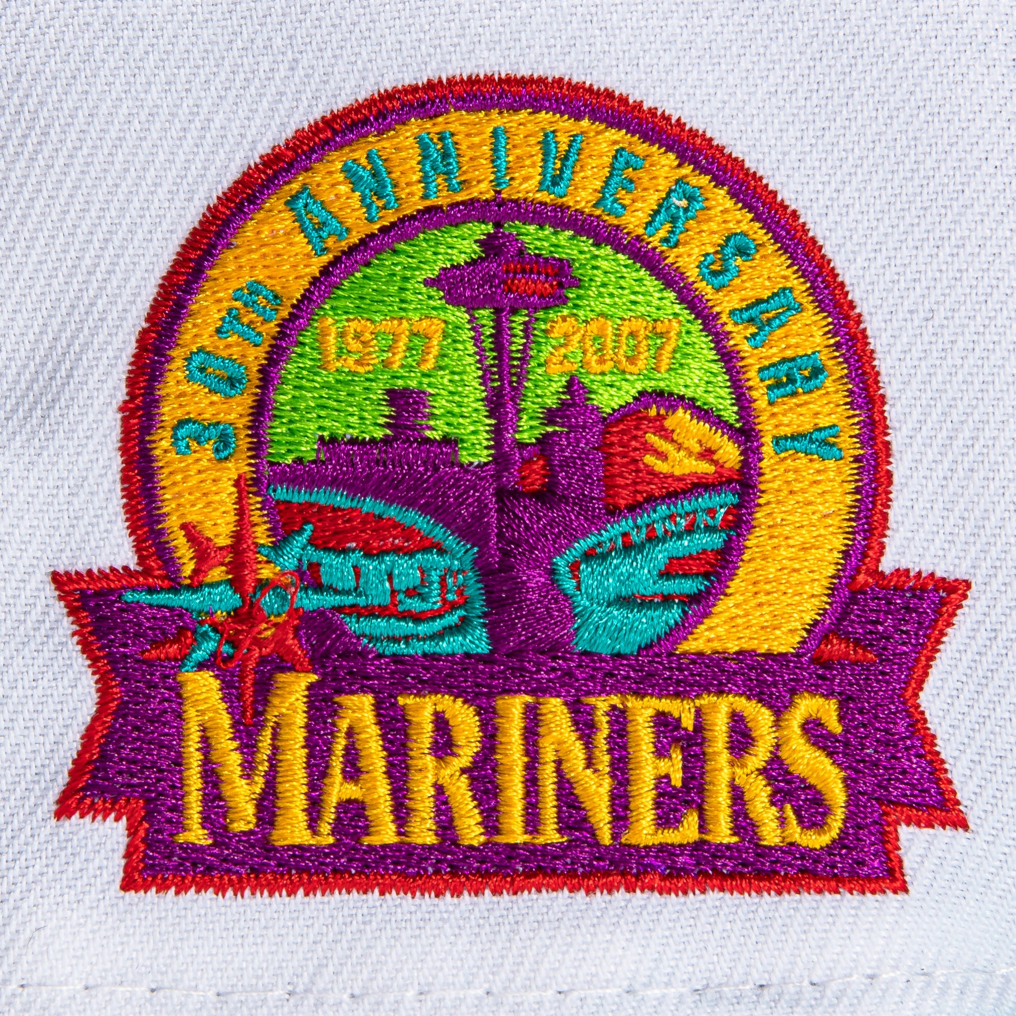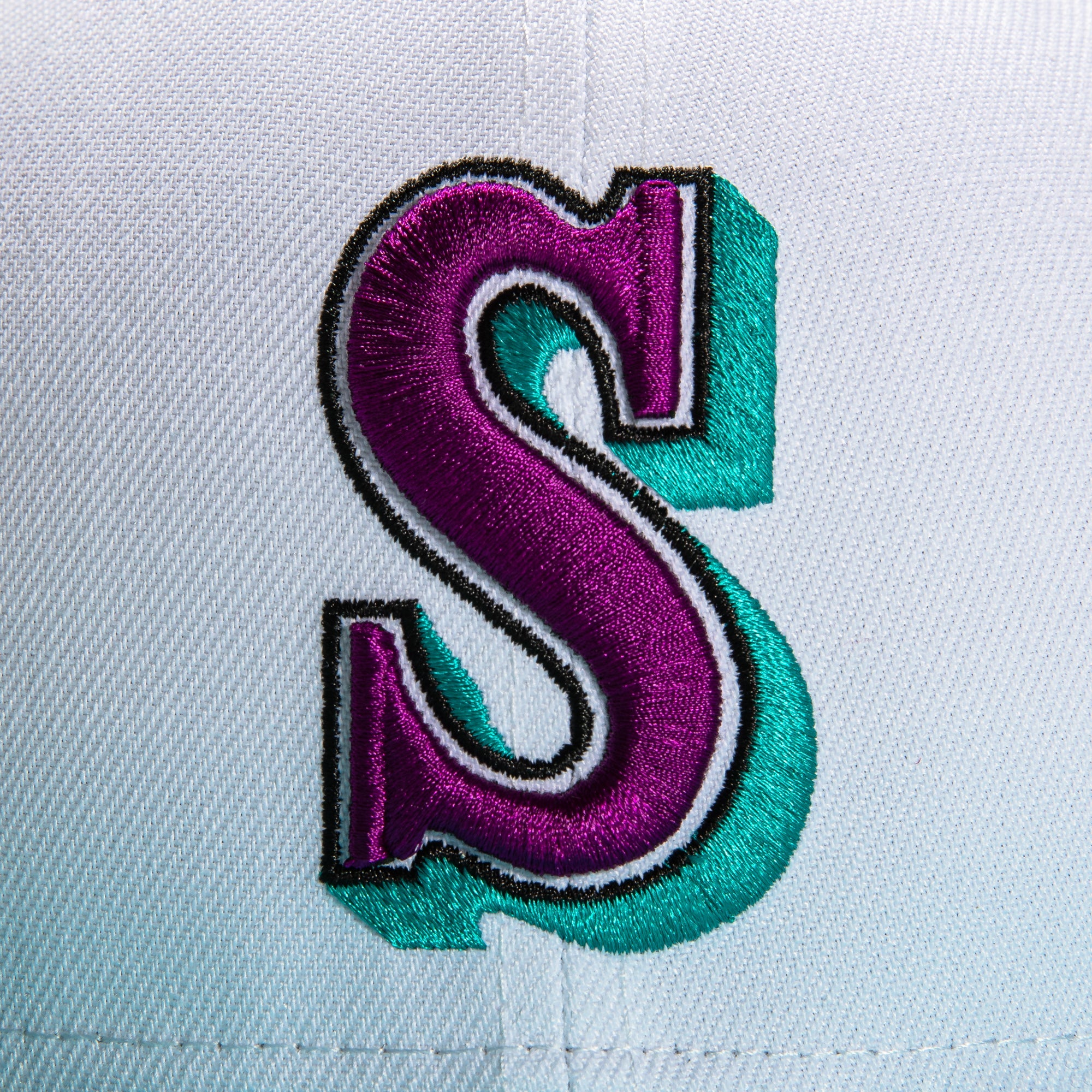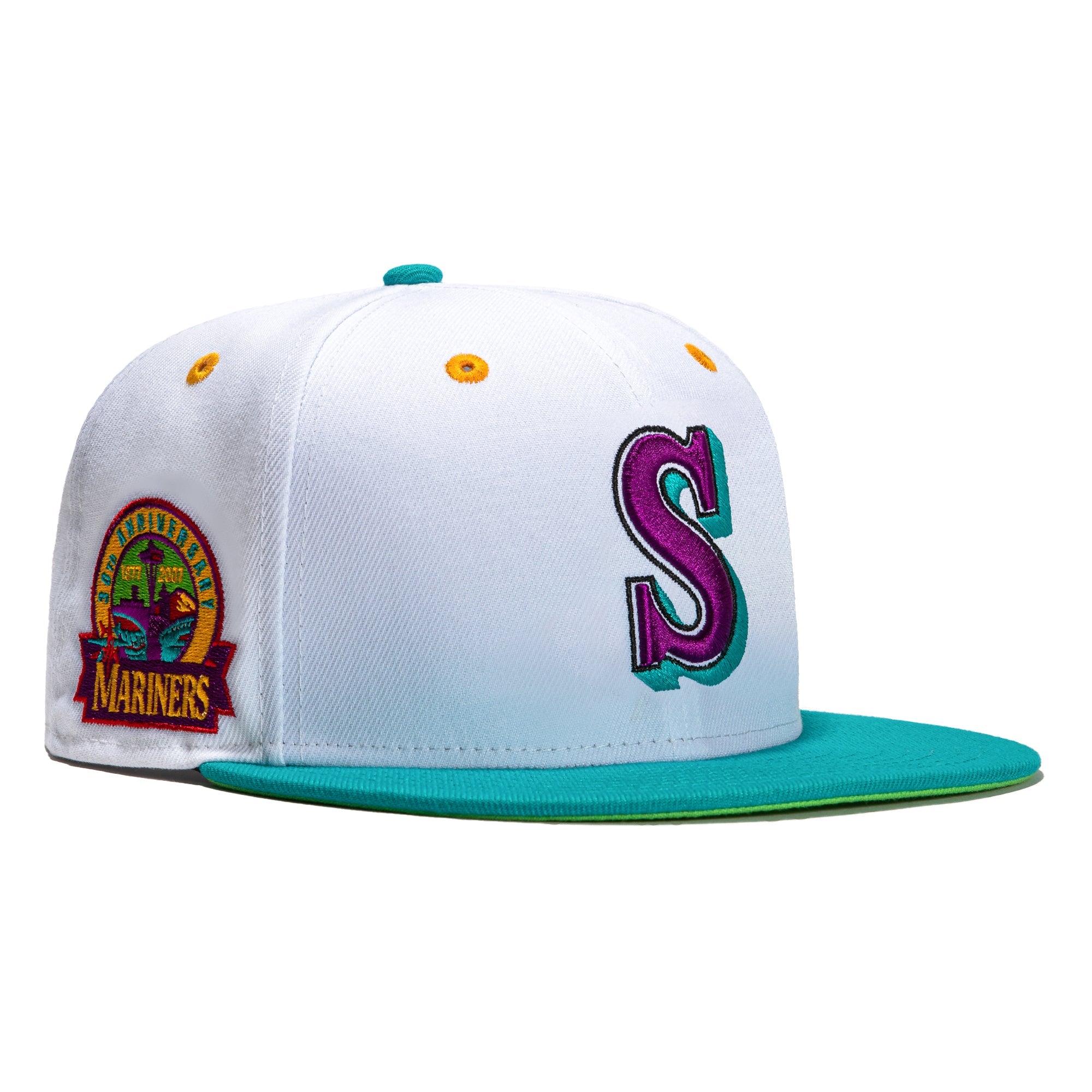 This New Era Dogtown Seattle Mariners 30th Anniversary 59FIFTY Fitted Hat has a white six panel structured high crown and embroidered eyelets with a teal fabric squatchee button. The fitted cap has a teal flat bill with a lime green undervisor. The front panel features the Seattle Mariners logo embroidery and a side patch embroidery on the right panel. The left panel of the fitted displays the New Era logo and the official MLB logo embroidery on the rear crown.