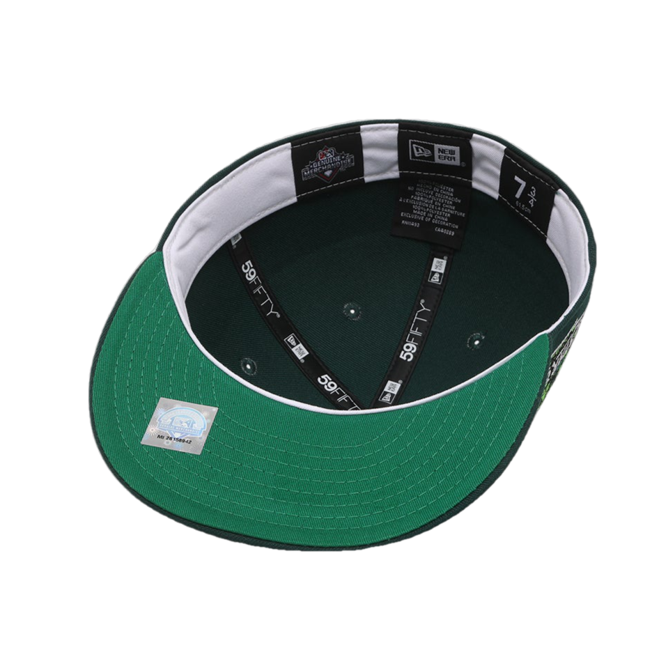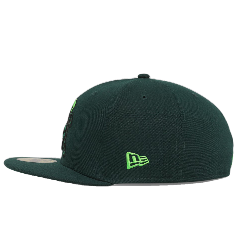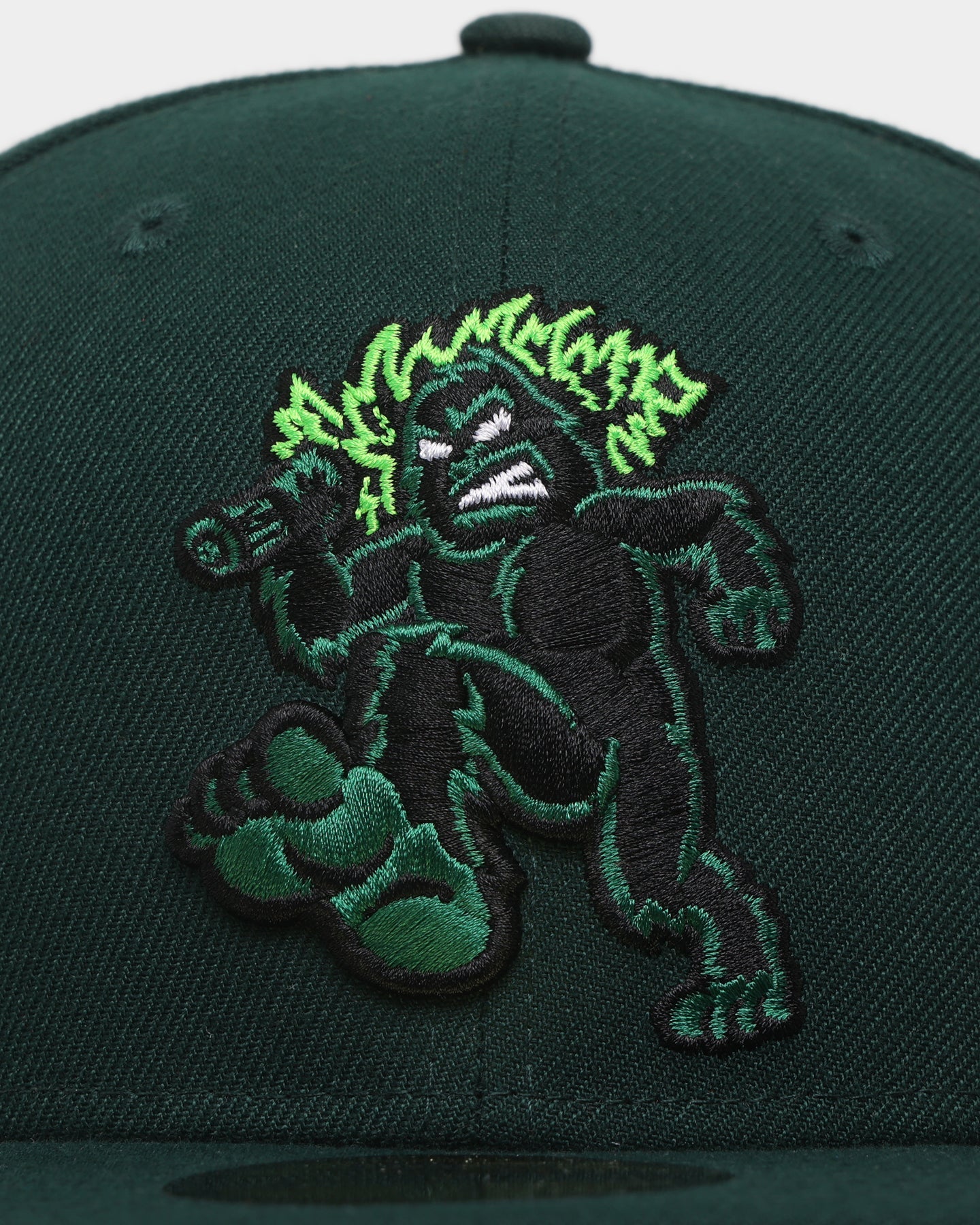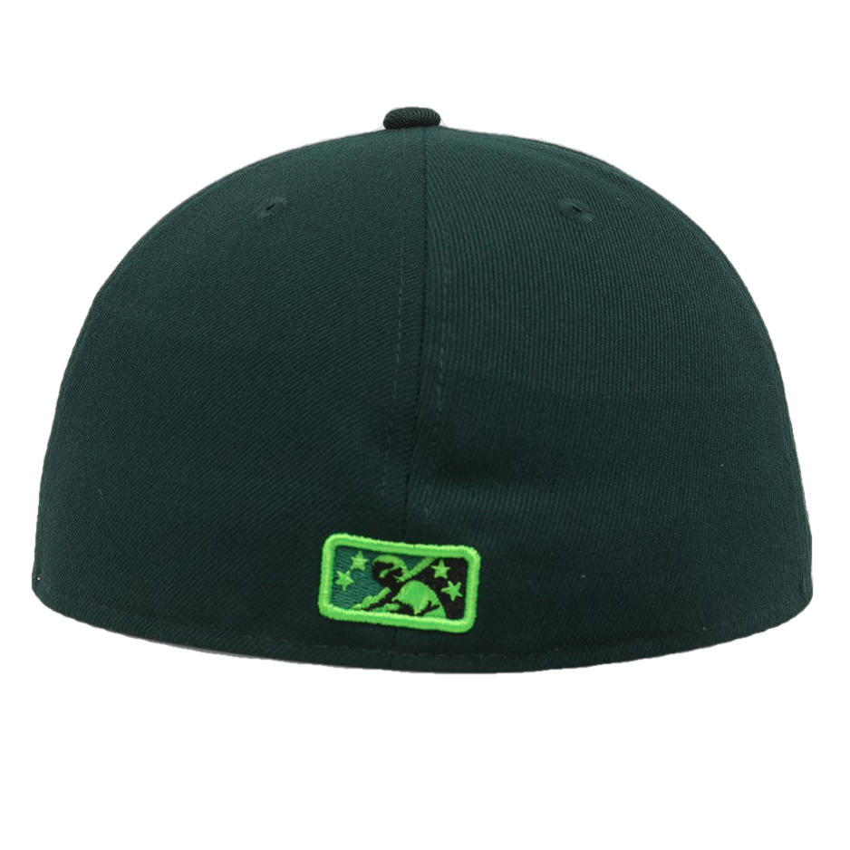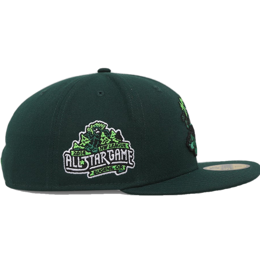 This New Era Eugene Emeralds 'Christmas Tree' Green 59FIFTY Fitted Hat was released by Culture Kings. The Christmas Tree fitted has a dark green six panel structured high crown, embroidered eyelets and fabric squatchee button. The fitted has a dark green flat visor with a kelly green undervisor. The front panel features the Eugene Emeralds logo embroidered in green stitching. The left panel of the fitted displays the New Era logo and the official MILB logo embroidery on the rear crown.