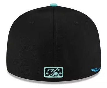 This New Era Goat 59FIFTY fitted hat was released by Hibbett. The fitted features a black six panel structured high crown and embroidered eyelets with a light blue fabric squatchee button and flat bill. The front panel features a Goat logo embroidery accompanied by graphic on the front-left and right panels. The fitted also has a serape undervisor.