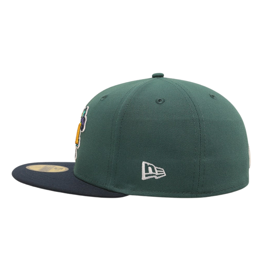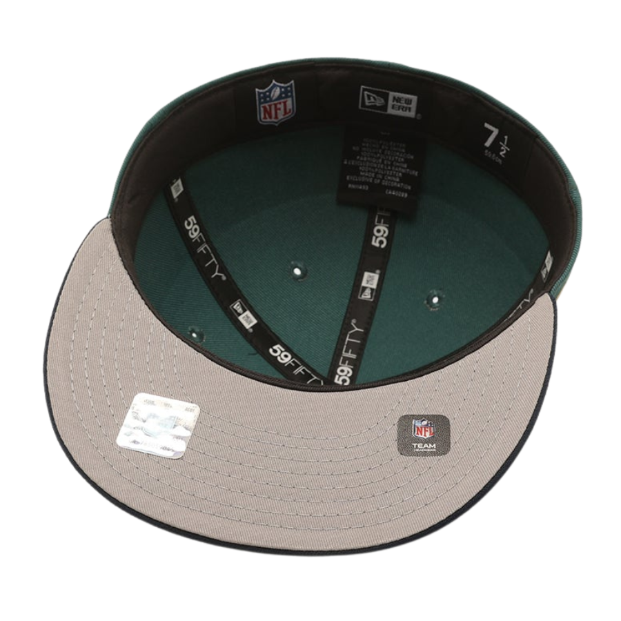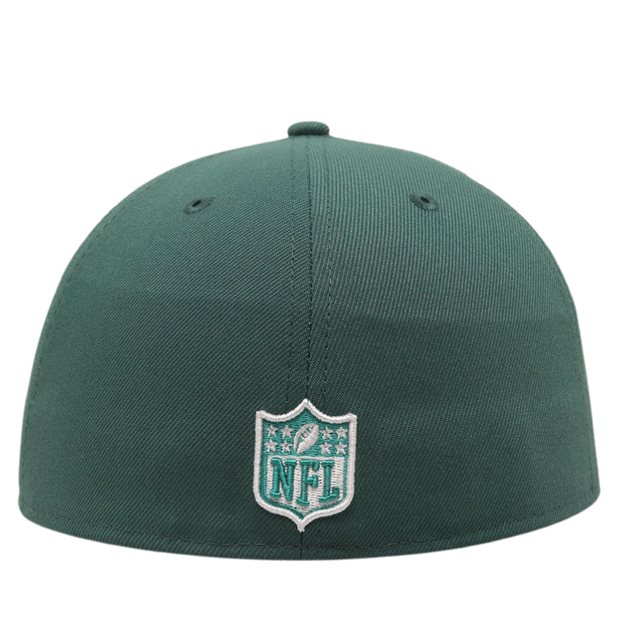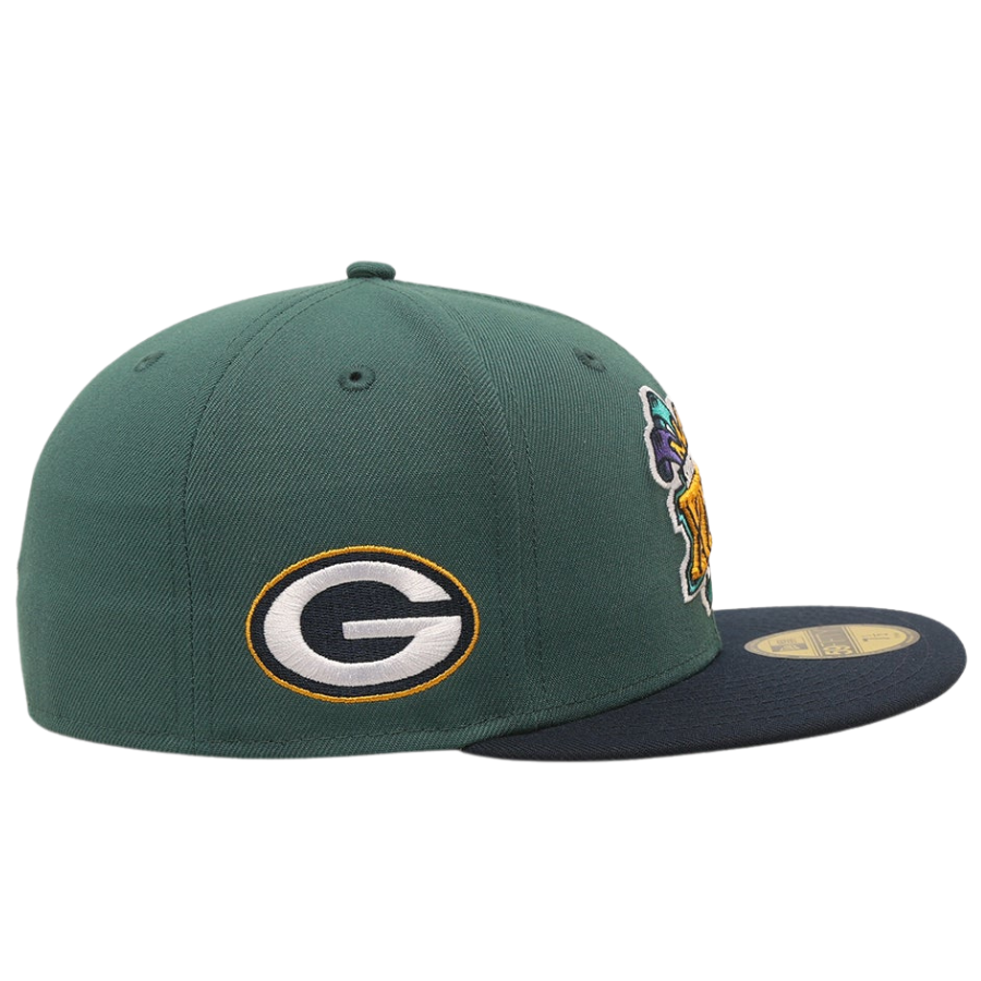 This New Era Green Bay Packers '1997 Super Bowl' Dark Green 2023 59FIFTY Fitted Hat was released by Culture Kings. The fitted has a dark green six panel structured high crown and embroidered eyelets with a dark green fabric squatchee button. The flat bill of the fitted cap is also navy blue with a gray undervisor and black sweatband. The front panel features a Super Bowl logo embroidery and the New Era "Fly Your Own Flag" logo on the left panel. The rear crown has the official NFL logo on display.