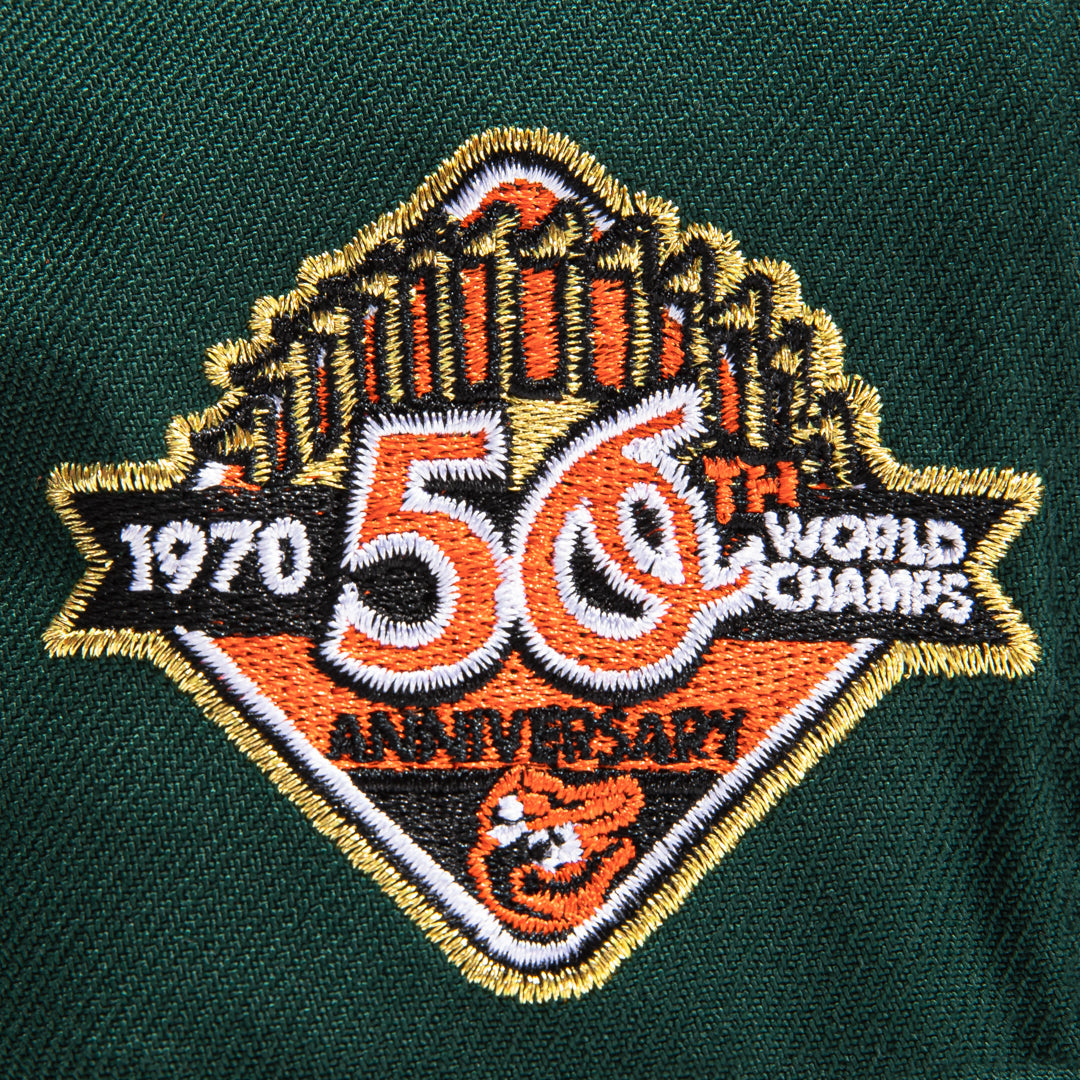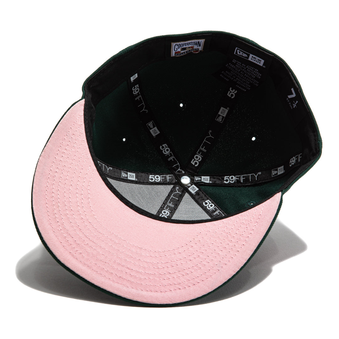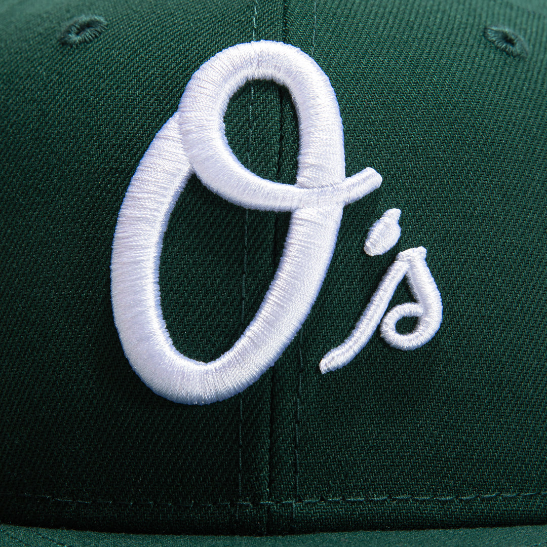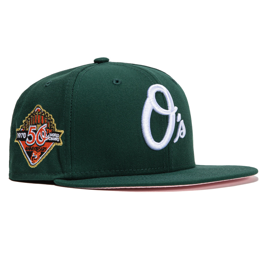 This New Era Baltimore Orioles 59FIFTY fitted hat has a dark green six panel structured high crown and embroidered eyelets with a dark green fabric squatchee button. The fitted cap has a dark green flat bill with a soft pink undervisor and black sweatband. The front panel features the Baltimore Orioles logo embroidery. The left panel of the fitted displays the New Era logo and the official MLB logo embroidery on the rear crown.