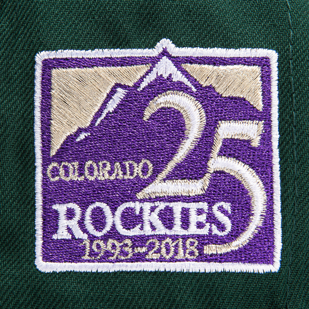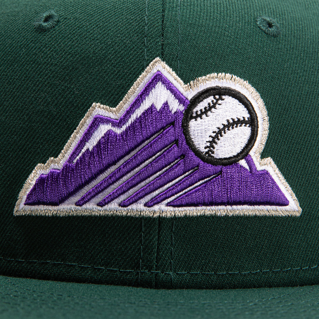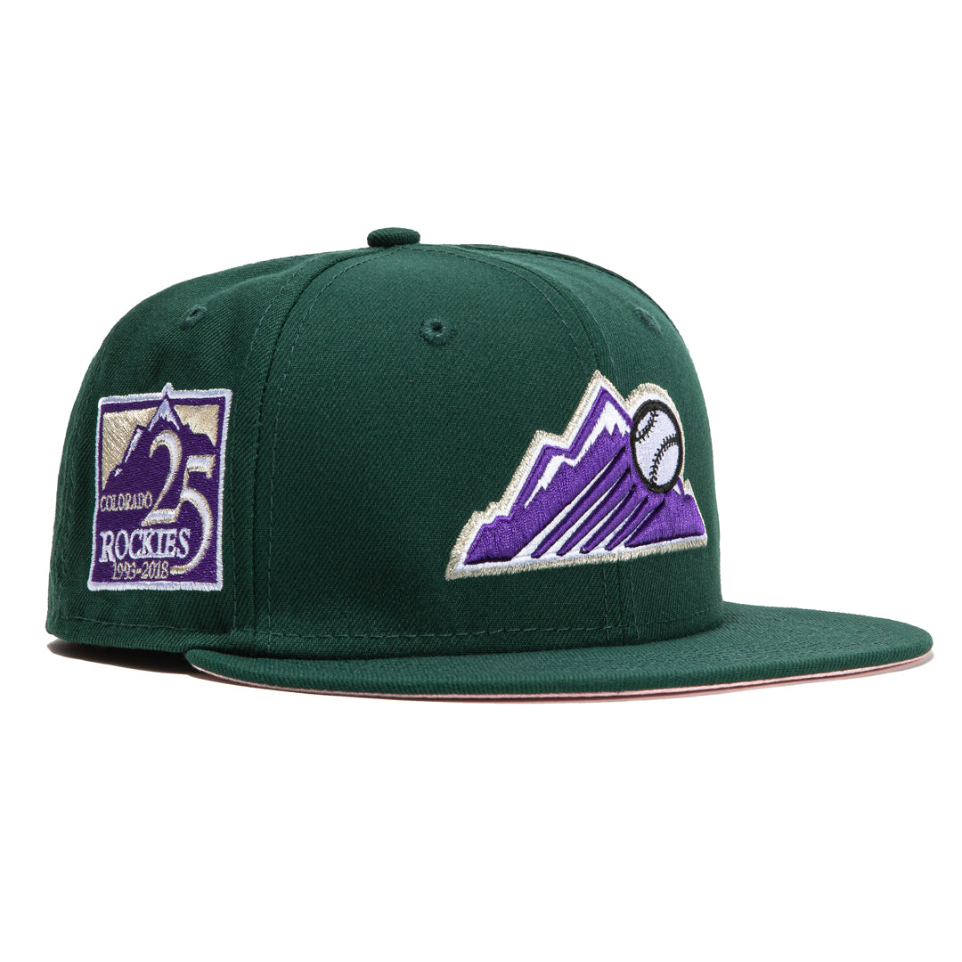 This New Era Colorado Rockies 59FIFTY fitted hat has a dark green six panel structured high crown and embroidered eyelets with a dark green fabric squatchee button. The fitted cap has a dark green flat bill with a soft pink undervisor and black sweatband. The front panel features the Colorado Rockies logo embroidery. The left panel of the fitted displays the New Era logo and the official MLB logo embroidery on the rear crown.