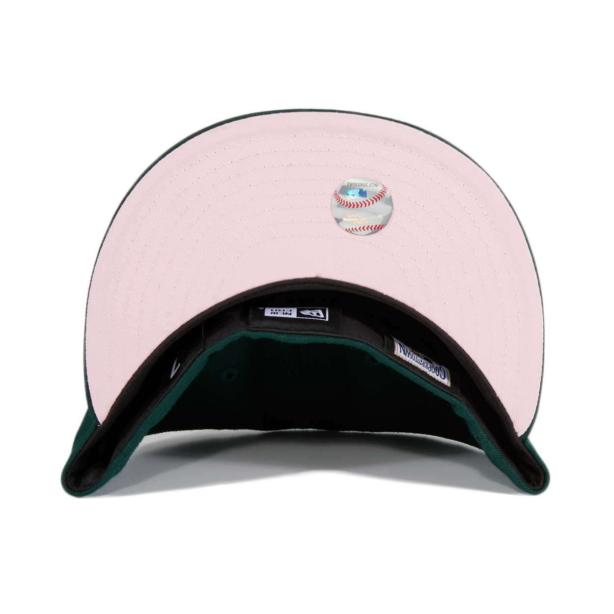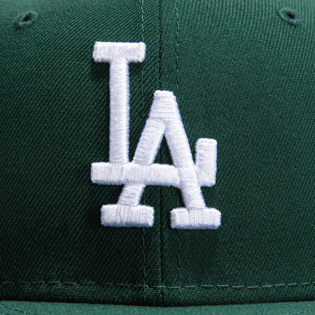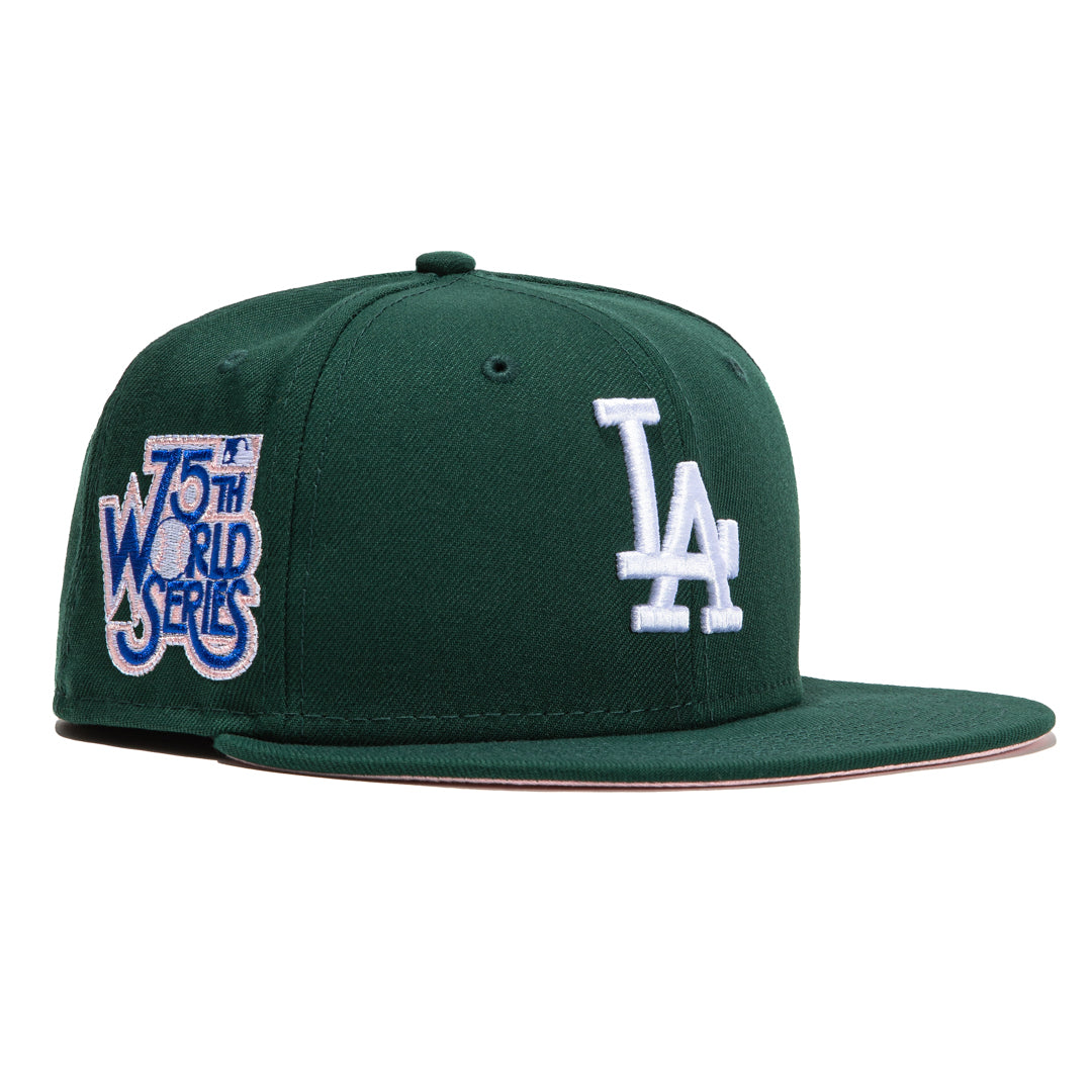 This New Era Los Angeles Dodgers 59FIFTY fitted hat has a dark green six panel structured high crown and embroidered eyelets with a dark green fabric squatchee button. The fitted cap has a dark green flat bill with a soft pink undervisor and black sweatband. The front panel features the Los Angeles Dodgers logo embroidery. The left panel of the fitted displays the New Era logo and the official MLB logo embroidery on the rear crown.
