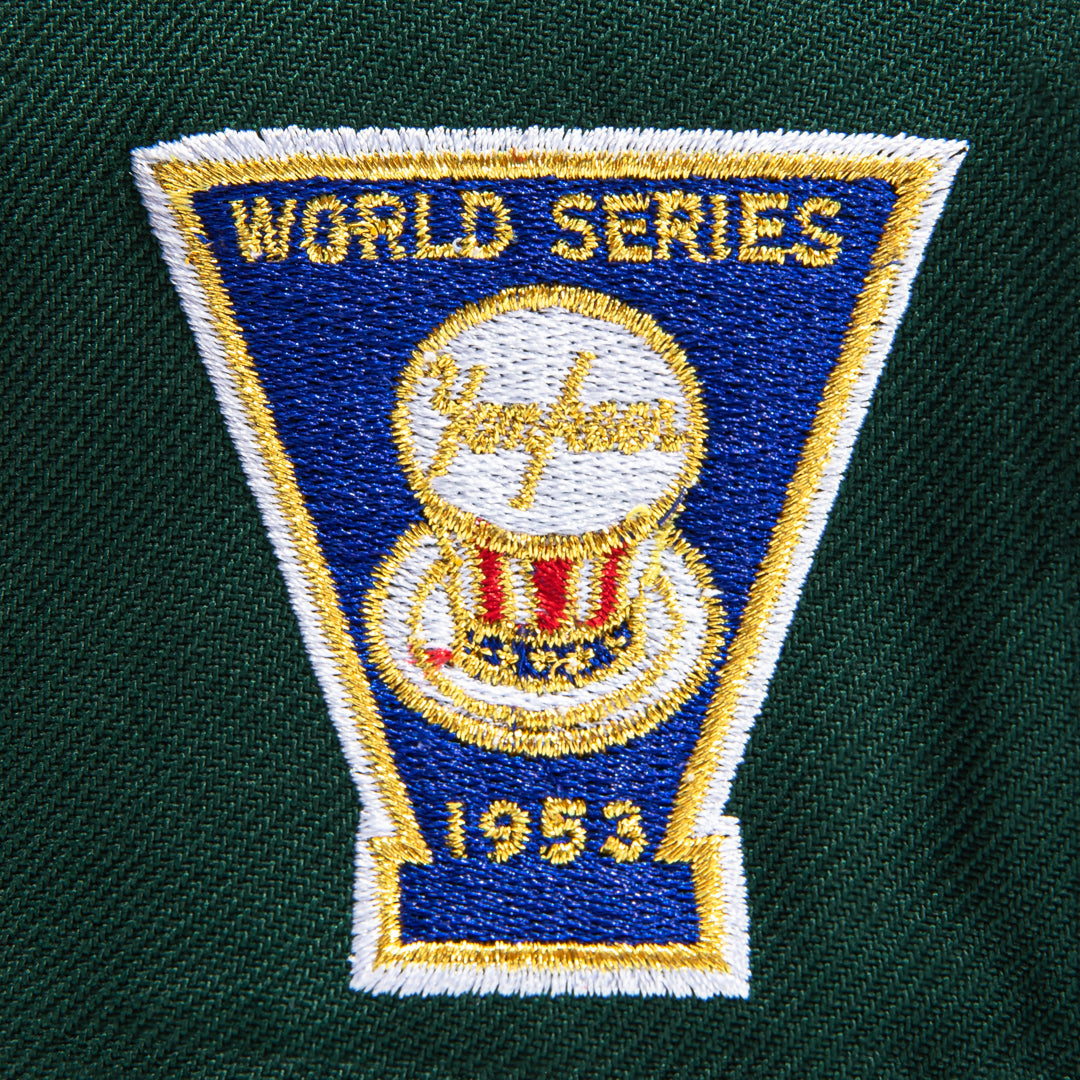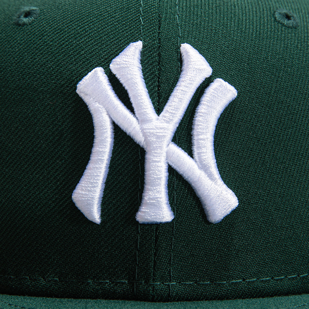 This New Era New York Yankees 59FIFTY fitted hat has a dark green six panel structured high crown and embroidered eyelets with a dark green fabric squatchee button. The fitted cap has a dark green flat bill with a soft pink undervisor and black sweatband. The front panel features the New York Yankees logo embroidery. The left panel of the fitted displays the New Era logo and the official MLB logo embroidery on the rear crown.