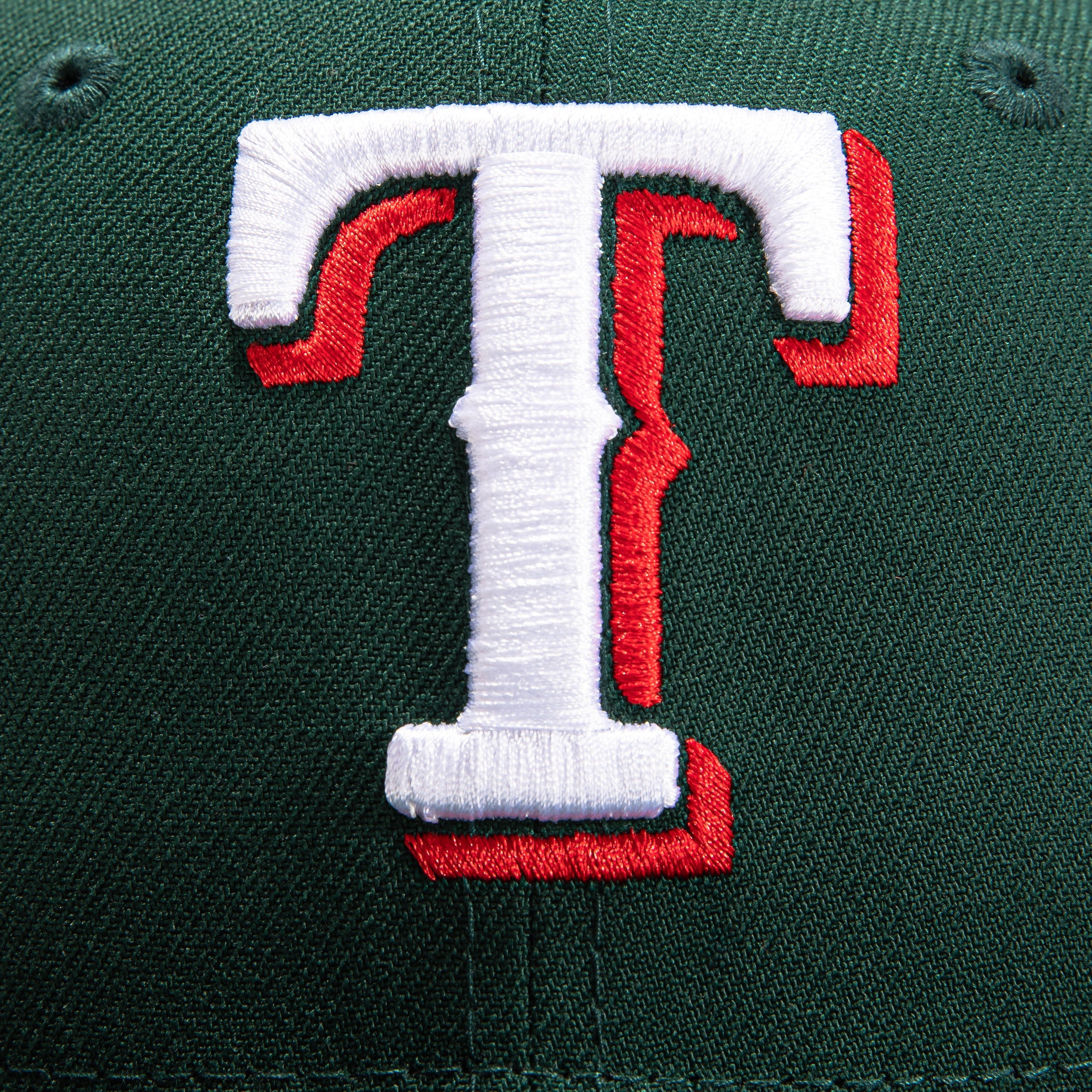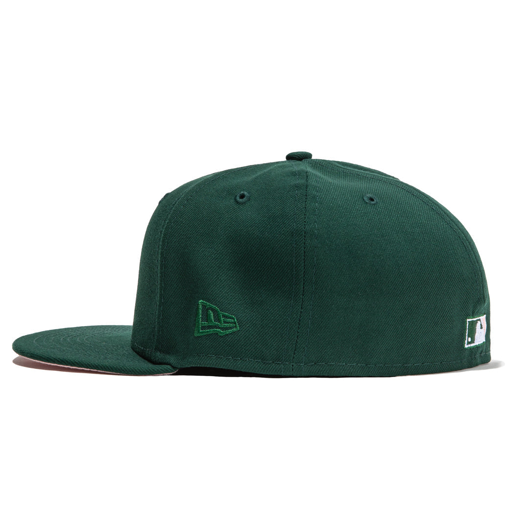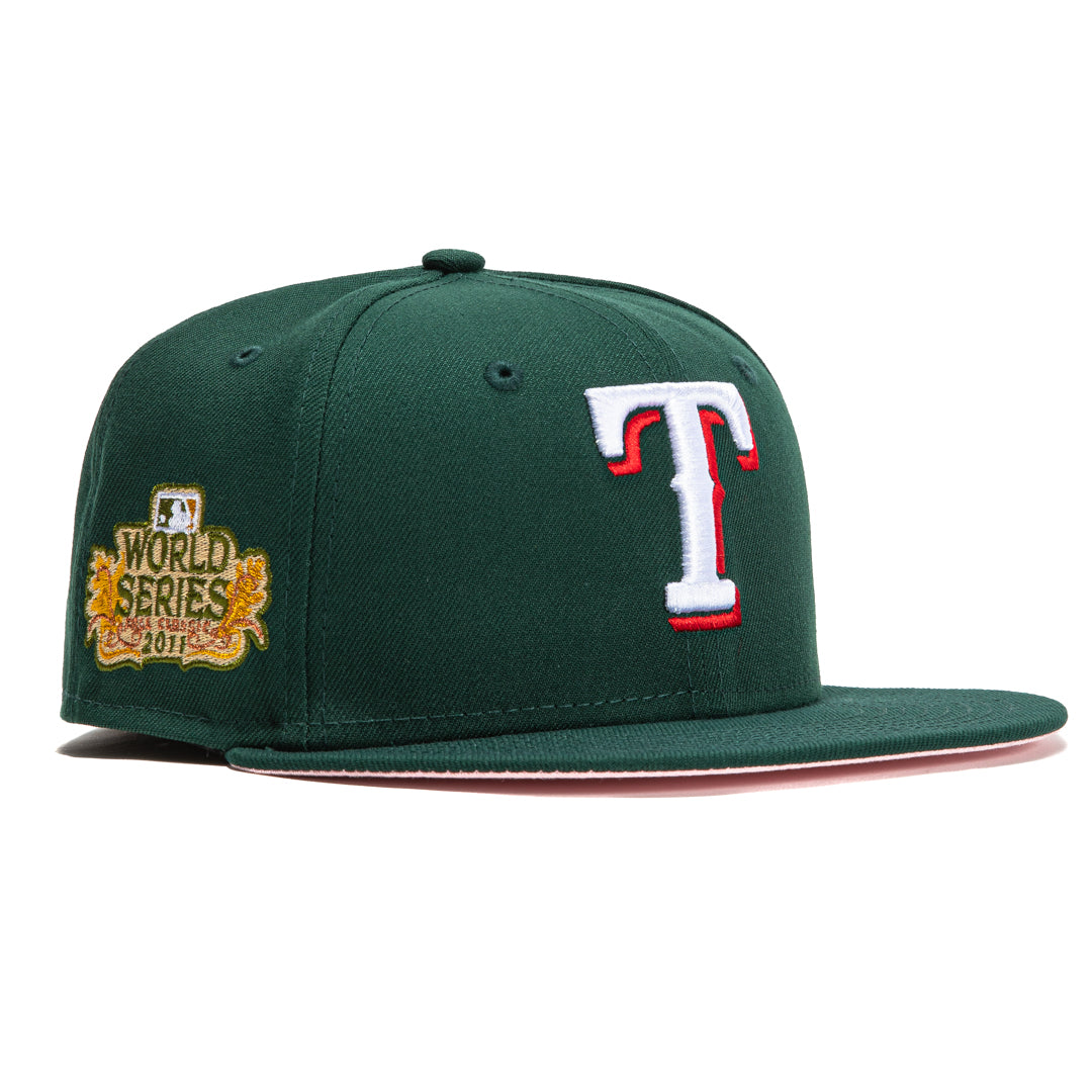 This New Era Texas Rangers 59FIFTY fitted hat has a dark green six panel structured high crown and embroidered eyelets with a dark green fabric squatchee button. The fitted cap has a dark green flat bill with a soft pink undervisor and black sweatband. The front panel features the Texas Rangers logo embroidery. The left panel of the fitted displays the New Era logo and the official MLB logo embroidery on the rear crown.