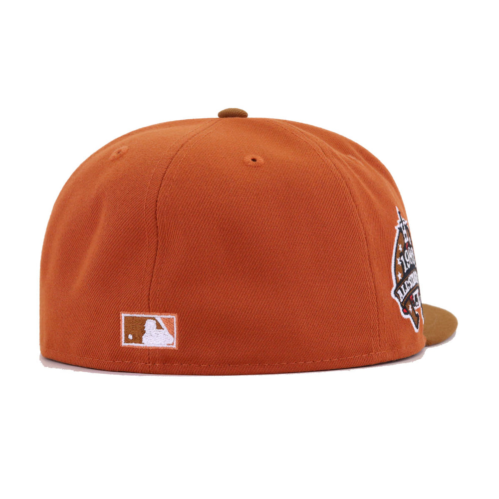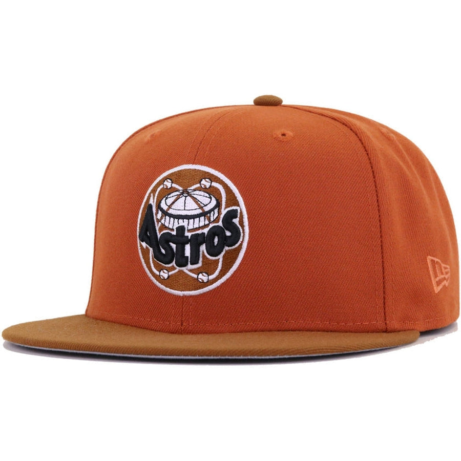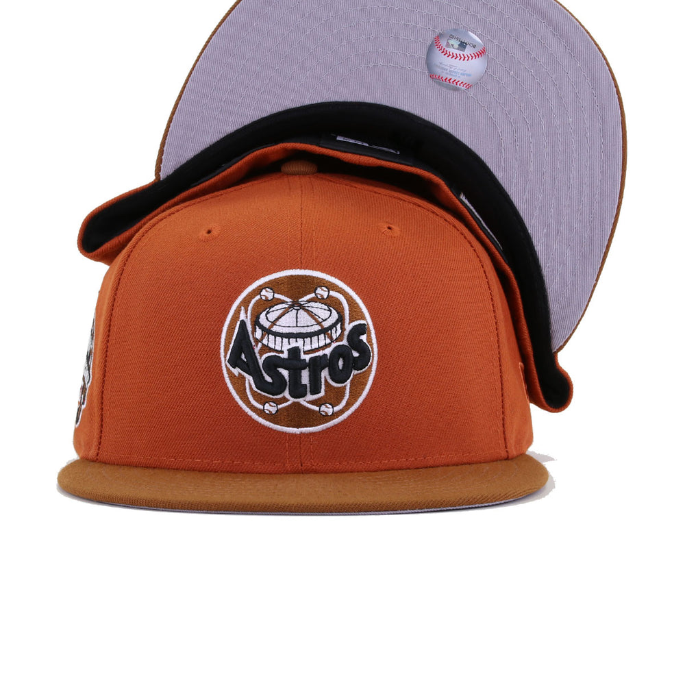 This New Era 59FIFTY Houston Astros fitted hat was released by Hat Heaven. The fitted has a rust orange six panel structured high crown and embroidered eyelets with a toasted peanut fabric squatchee button and flat bill. The fitted also has a grey bottom undervisor. The front panel features the Houston Astros logo embroidery with a 1986 ASG side patch on the right panel.