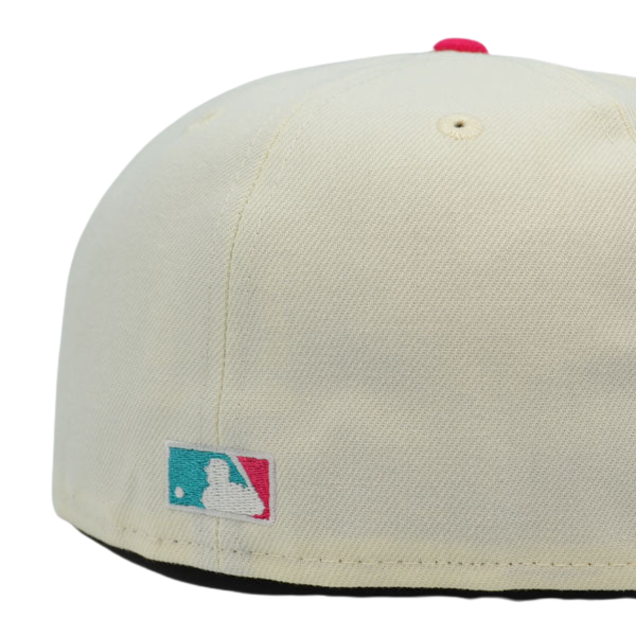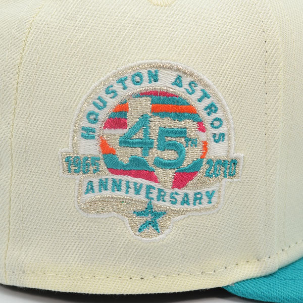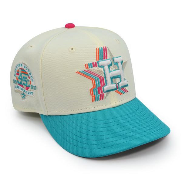 This Houston Astros fitted hat was released by Hat Dreams. The fitted has a white six panel structured high crown and embroidered eyelets with a hot pink fabric squatchee button. The fitted cap also has a teal flat bill and a grey bottom undervisor. The front panel features the Houston Astros logo embroidery a 45th Anniversary side patch on the right panel.