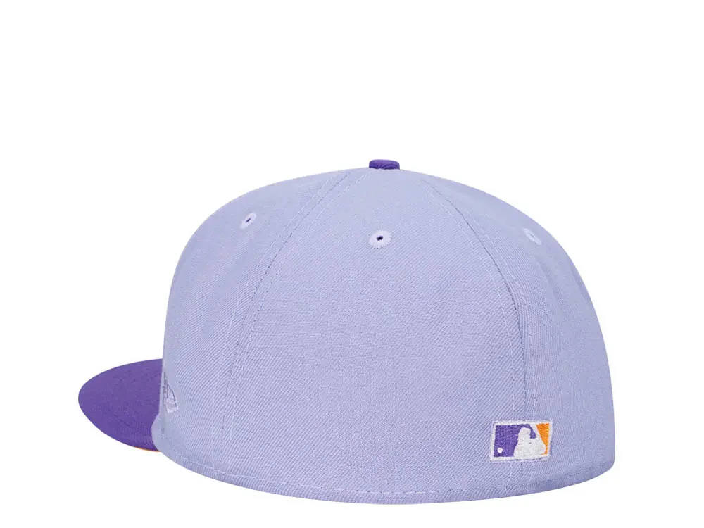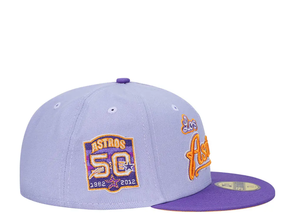 This New Era Houston Astros 50th Anniversary Purple Infusion 59FIFTY Fitted Hat has a lavender six panel structured high crown and embroidered eyelets with a grape purple fabric squatchee button. The fitted cap also has a grape purple flat bill with an orange undervisor and white sweatband. The front panel features the Houston Astros logo embroidery and a 50th Anniversary side patch embroidery on the right panel. The left panel of the fitted displays the New Era logo and the official MLB Batterman logo embroidery on the rear crown.