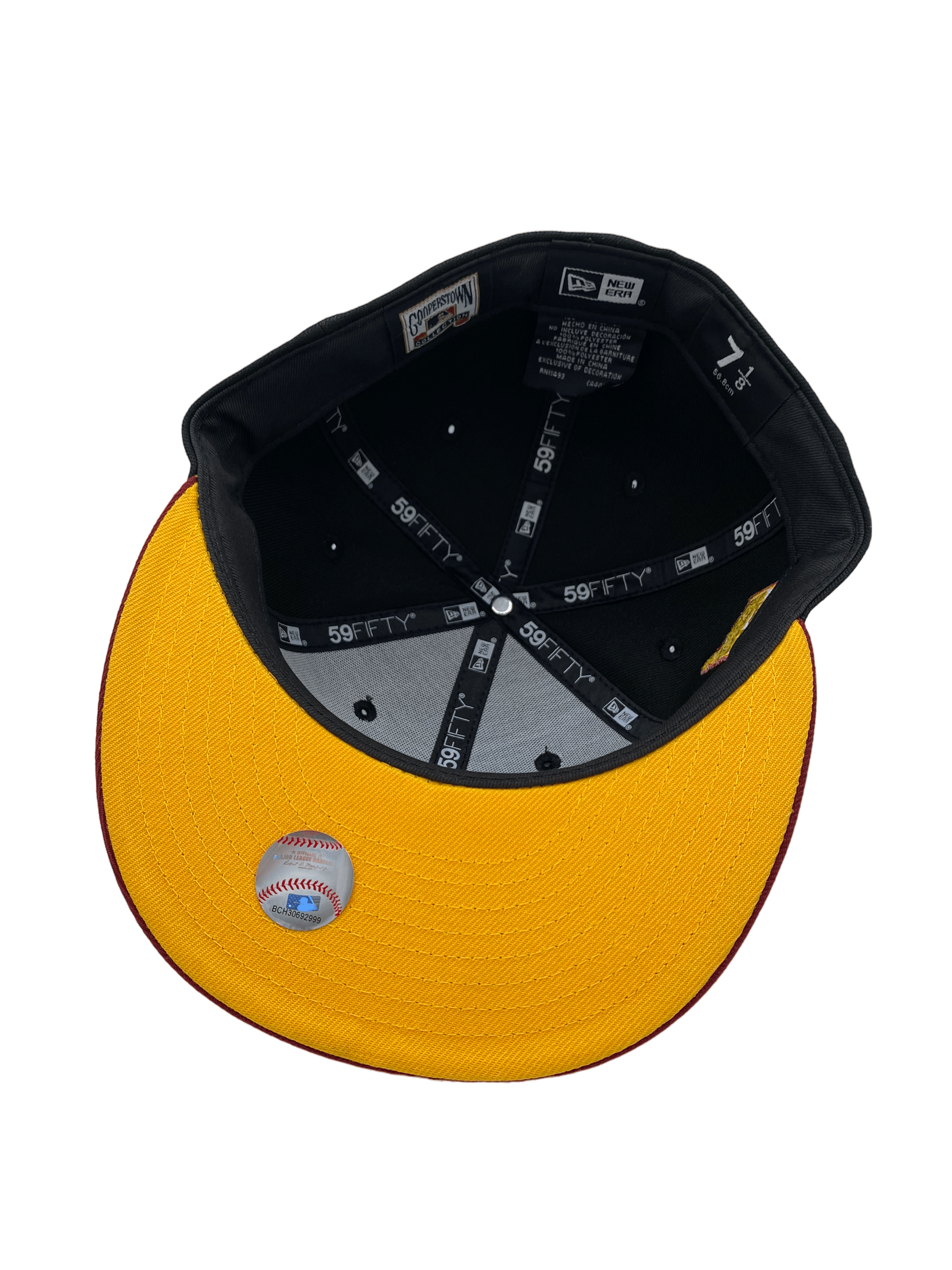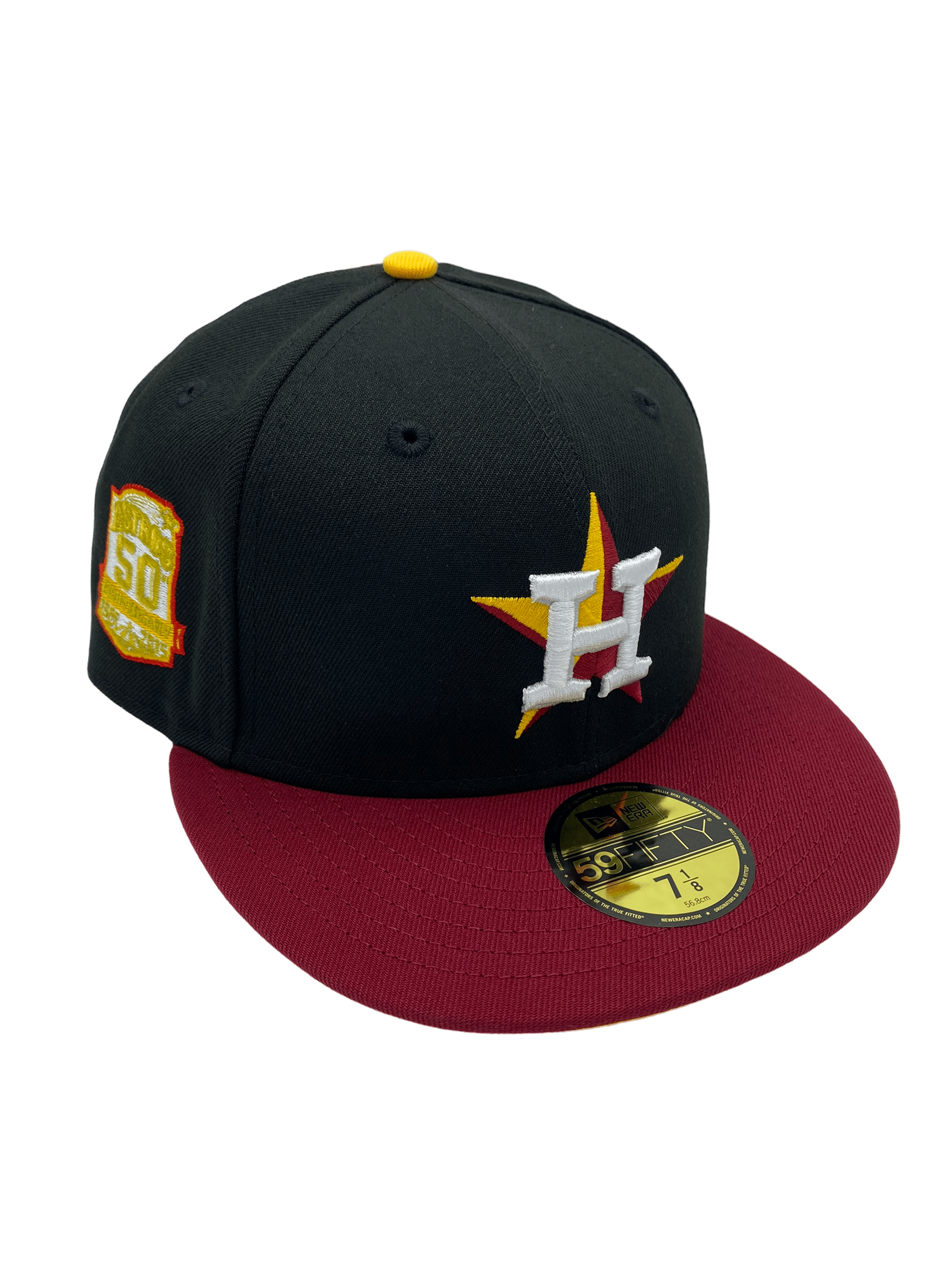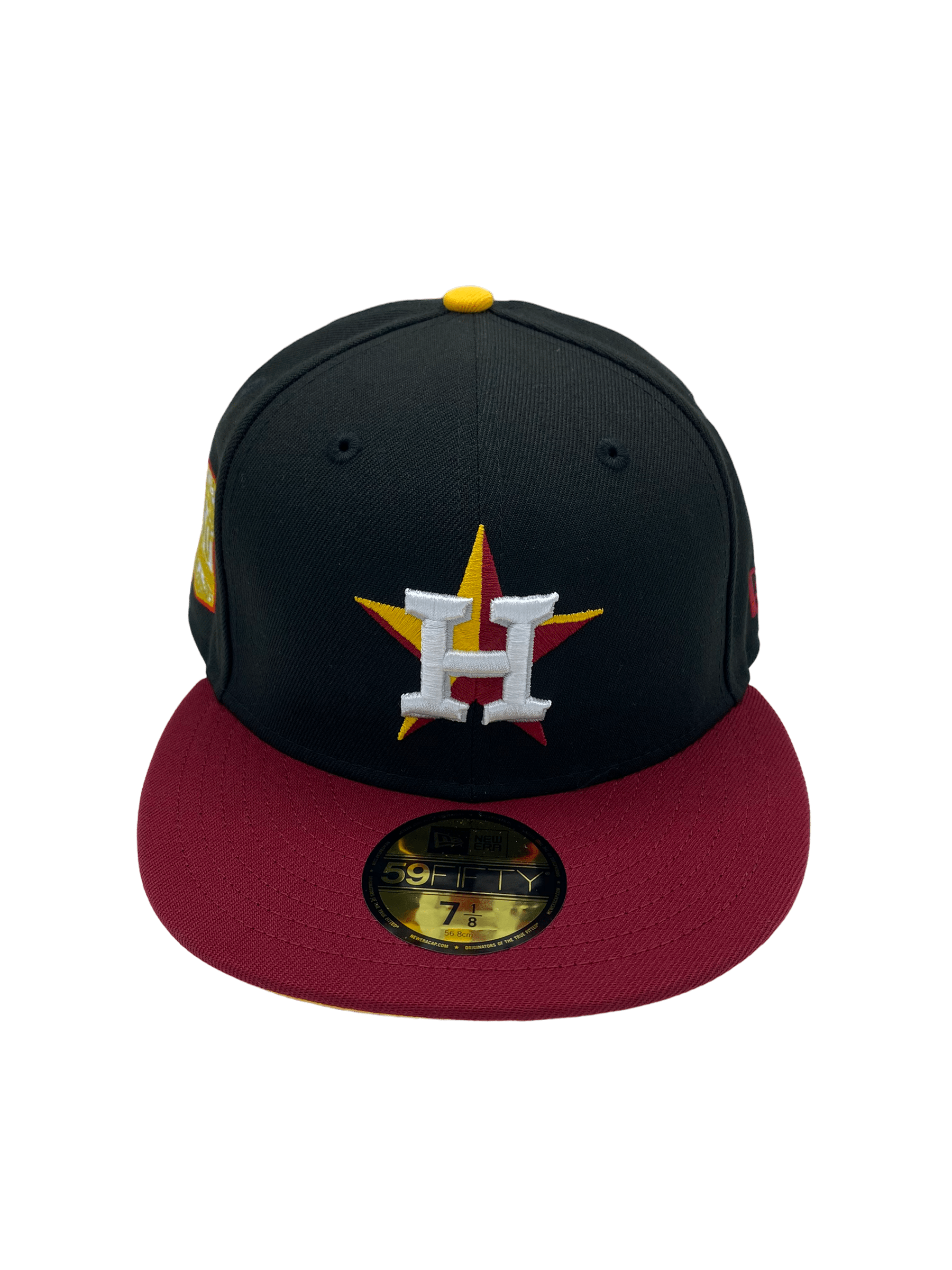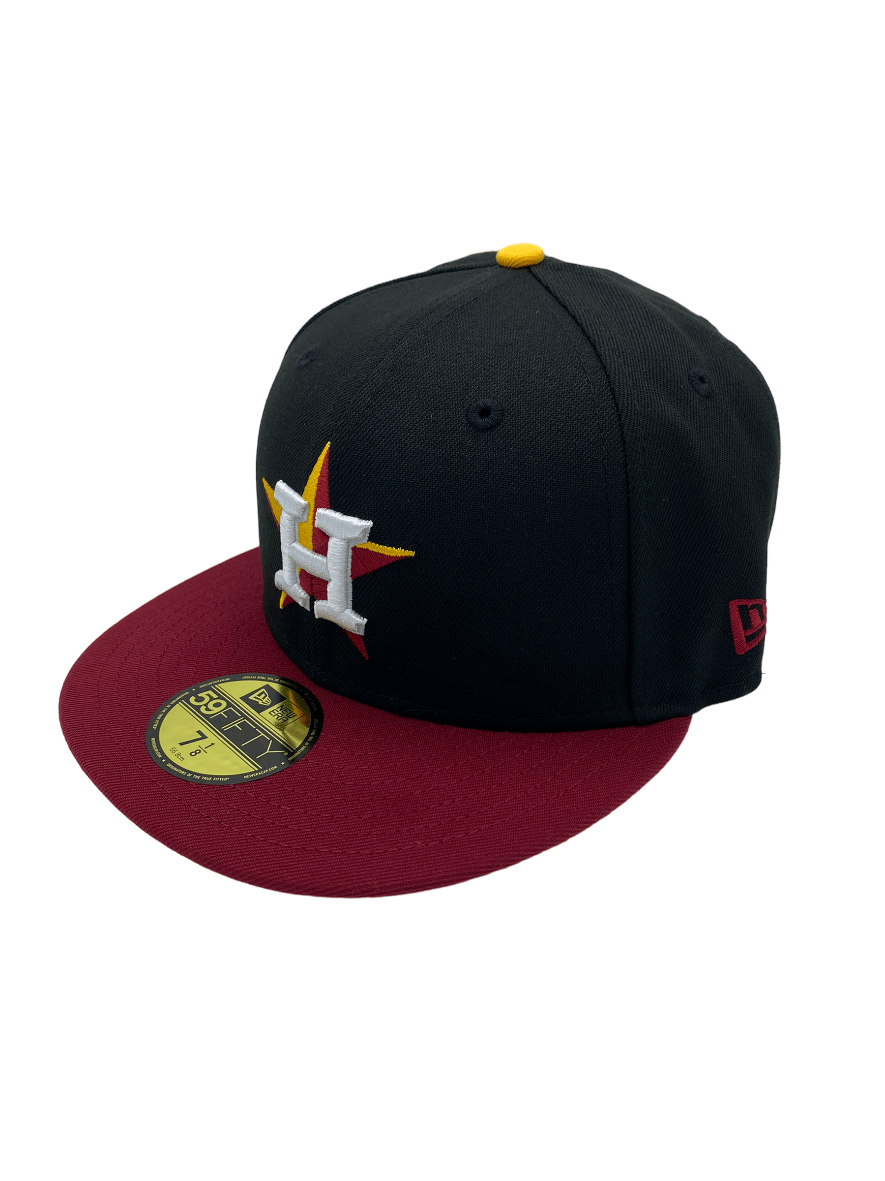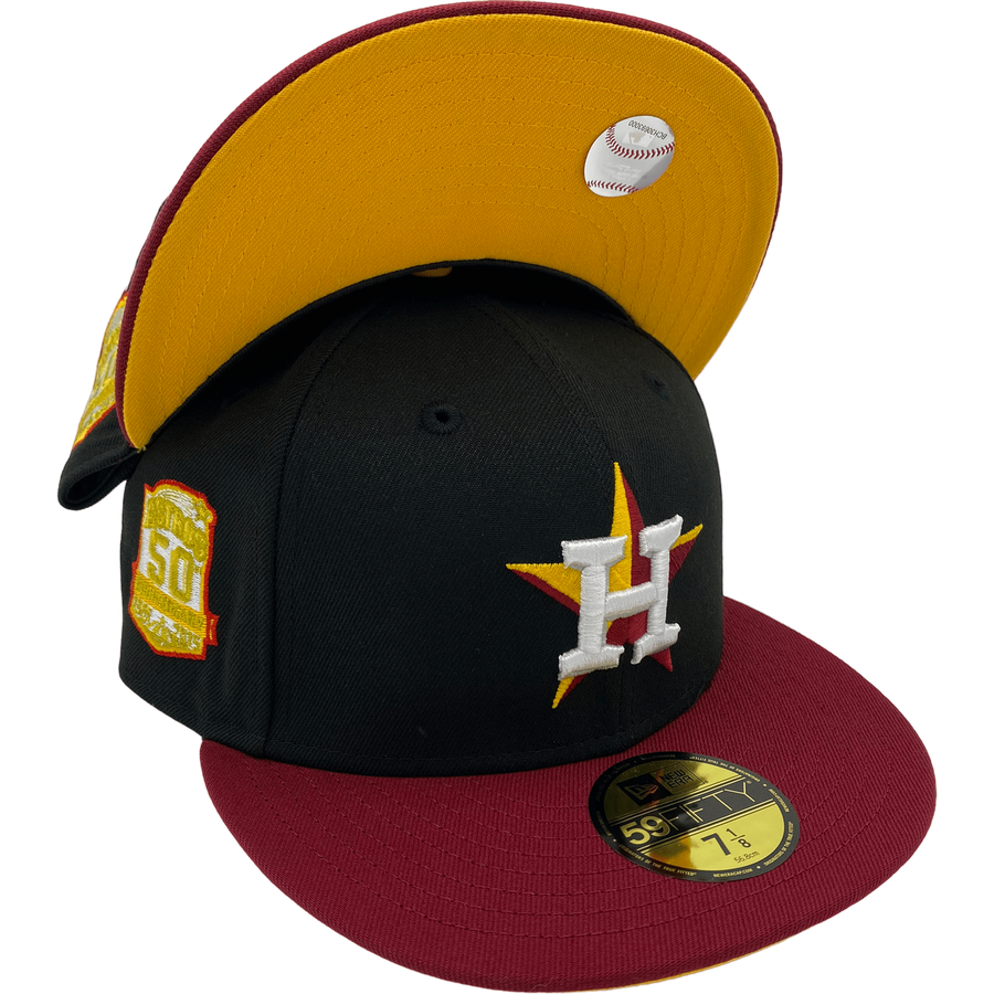 This New Era Houston Astros Black Ridin Dirty UGK 59FIFTY Fitted Hat was released by Pro Image Sports. The fitted has a black six panel structured high crown and eyelets with a gold squatchee button. The flat bill of the fitted cap is burgundy with a gold undervisor and black sweatband. The front panel features the Houston Astros logo embroidery. The left panel of the fitted displays the New Era logo and the official MLB Batterman logo on the rear-crown .
