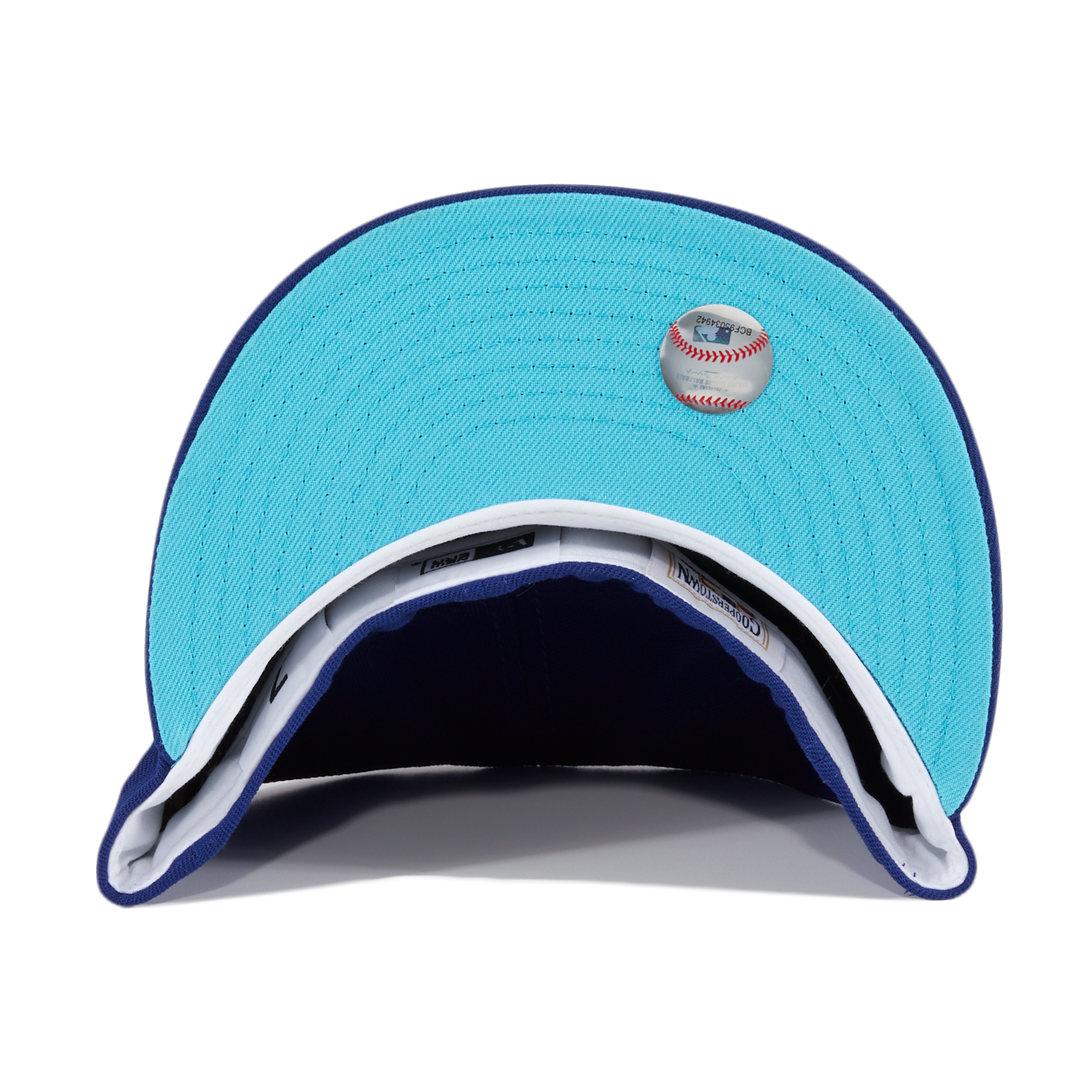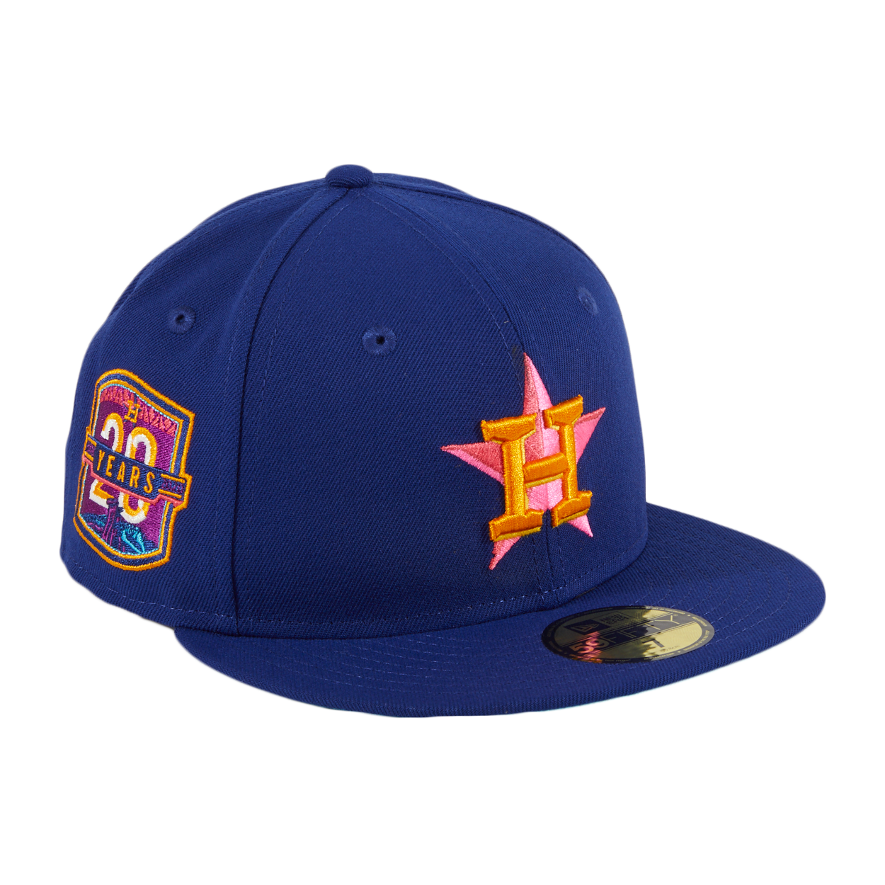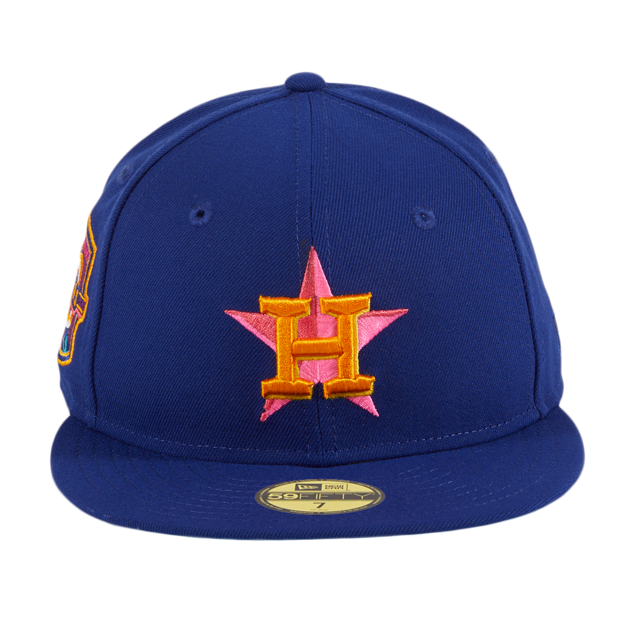 The Houston Astros Interstellar Jelly 59FIFTY fitted hat has a royal blue six panel high crown, embroidered eyelets and fabric squatchee button. The flat bill of the fitted is also royal blue with a teal undervisor. The front panel features the MLB team logo with and side patch on right panel both pink threads visible.