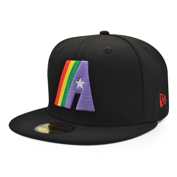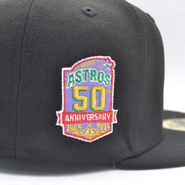 This New Era Houston Astros Prototype 59FIFTY fitted hat has a black six panel structured high crown, black embroidered eyelets and a black fabric squatchee button. The fitted cap also has a black flat bill with a green undervisor and white sweatband. The front panel features the Houston Astros logo embroidery and a 50th Anniversary side patch embroidery on the right panel. The left panel of the fitted displays the New Era logo and the official MLB logo embroidery on the rear crown.