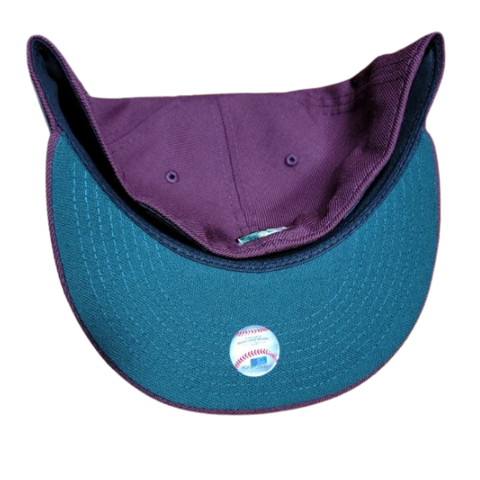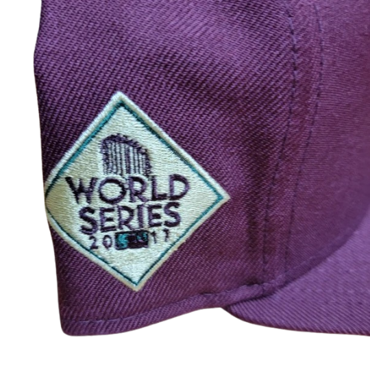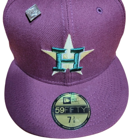 The New Era Houston Astros 2017 World Series fitted hat is a Capsule Hat exclusive that has a purple and turquoise colorway. The six panel structured high crown, embroidered eyelets and fabric squatchee button are purple. The flat bill of the fitted is also purple with a turquoise undervisor and black sweatband. The front panel features a the Astros logo embroidered in white and turquoise thread. The right panel features a 2017 World Series side patch embroidered in the same white, purple and turquoise colorway.