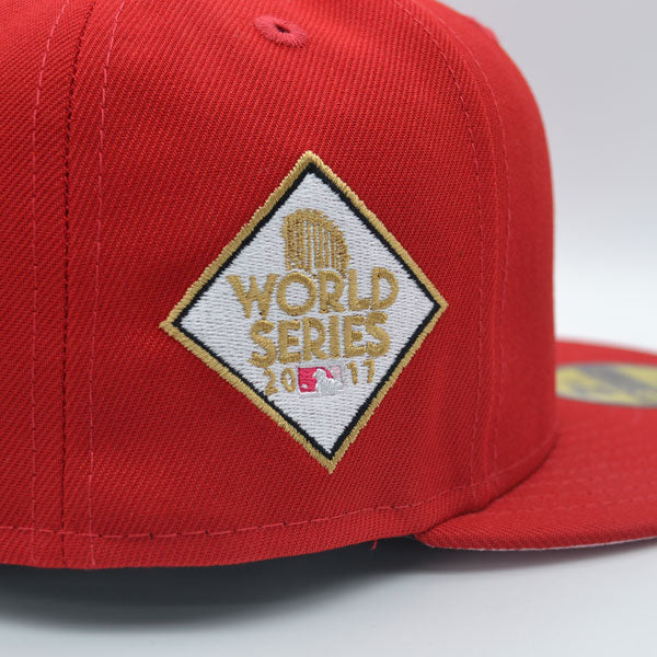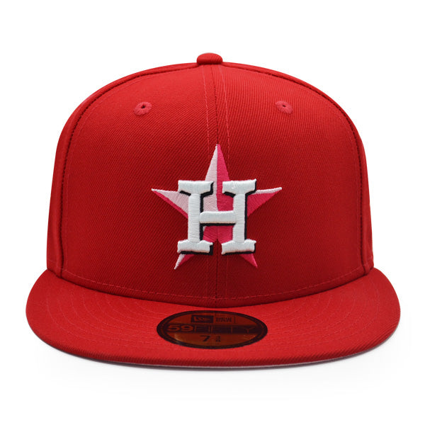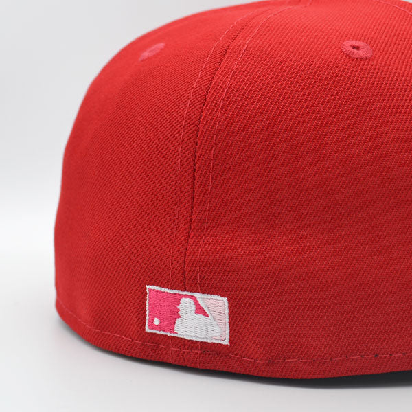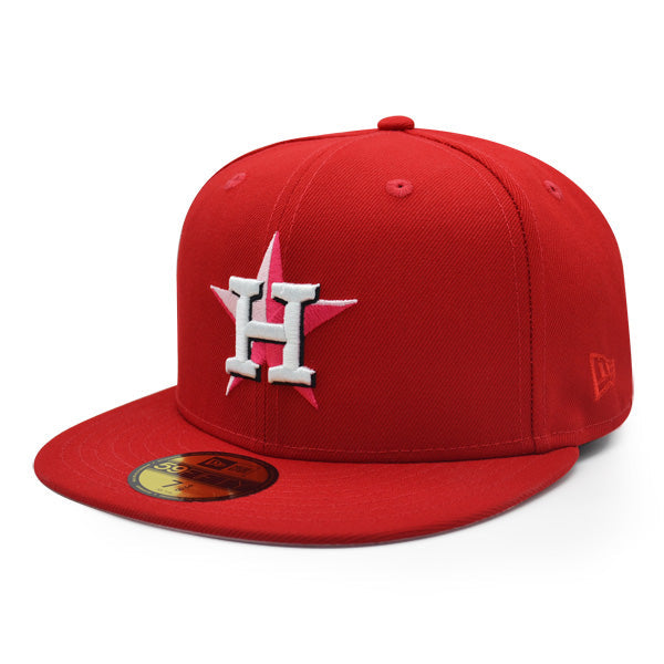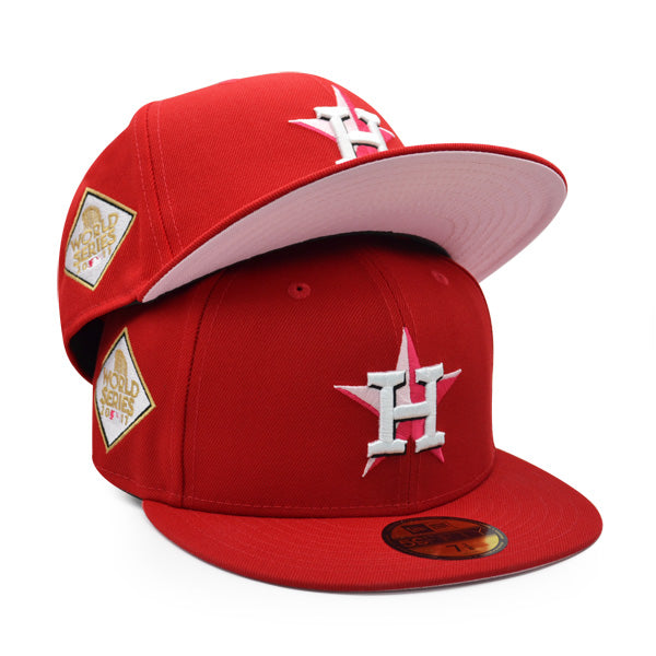 This New Era Houston Astros Red/Pink 2011 World Series 59FIFTY Fitted Hat was released by Hat Dreams. The fitted cap features a red and pink colorway. The front panel includes the Houston Astros logo embroidery. The left panel of the fitted displays the New Era logo and the official MLB insignia embroidered on the rear crown and a side patch on the right-wear side.