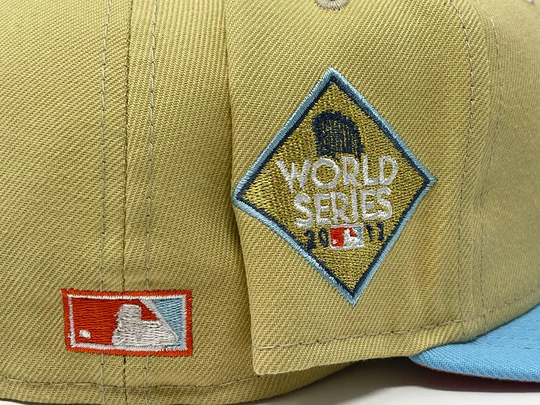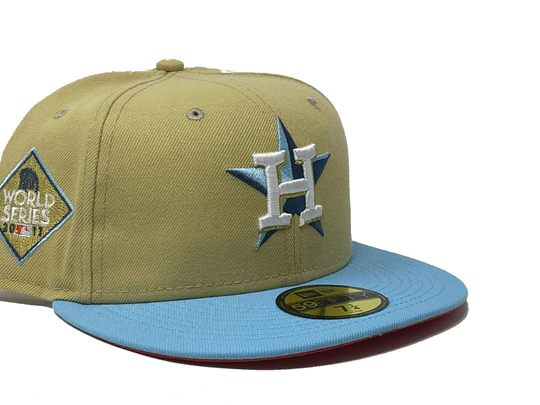 This New Era Houston Astros 59FIFTY fitted hat has a vegas gold six panel structured high crown, vegas gold embroidered eyelets and a vegas gold fabric squatchee button. The fitted cap also has a sky blue flat bill with a orange undervisor and white sweatband. The front panel features the Houston Astros logo embroidery and a side patch embroidery on the right panel. The left panel of the fitted displays the New Era logo and the rear crown features the official MLB logo embroidery.