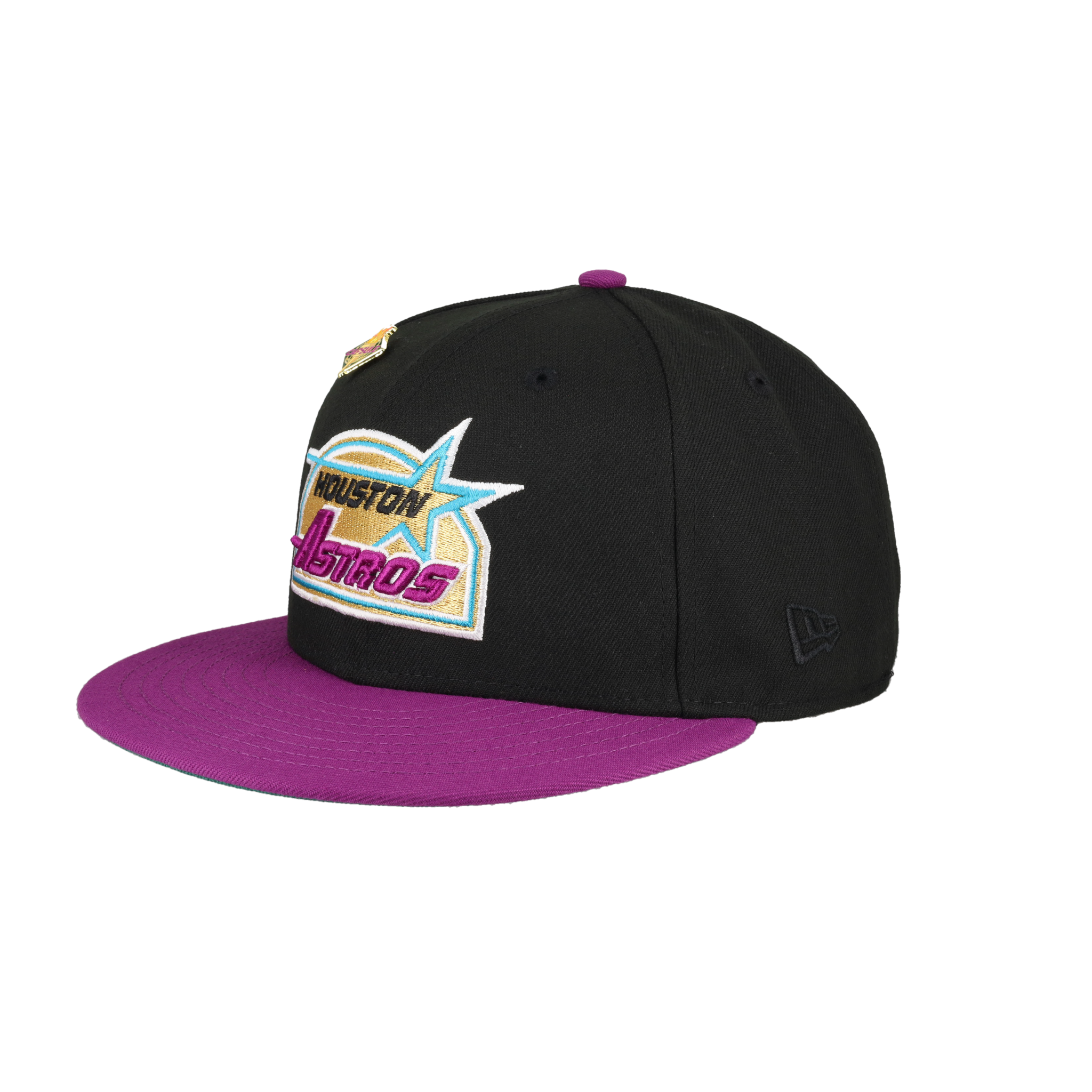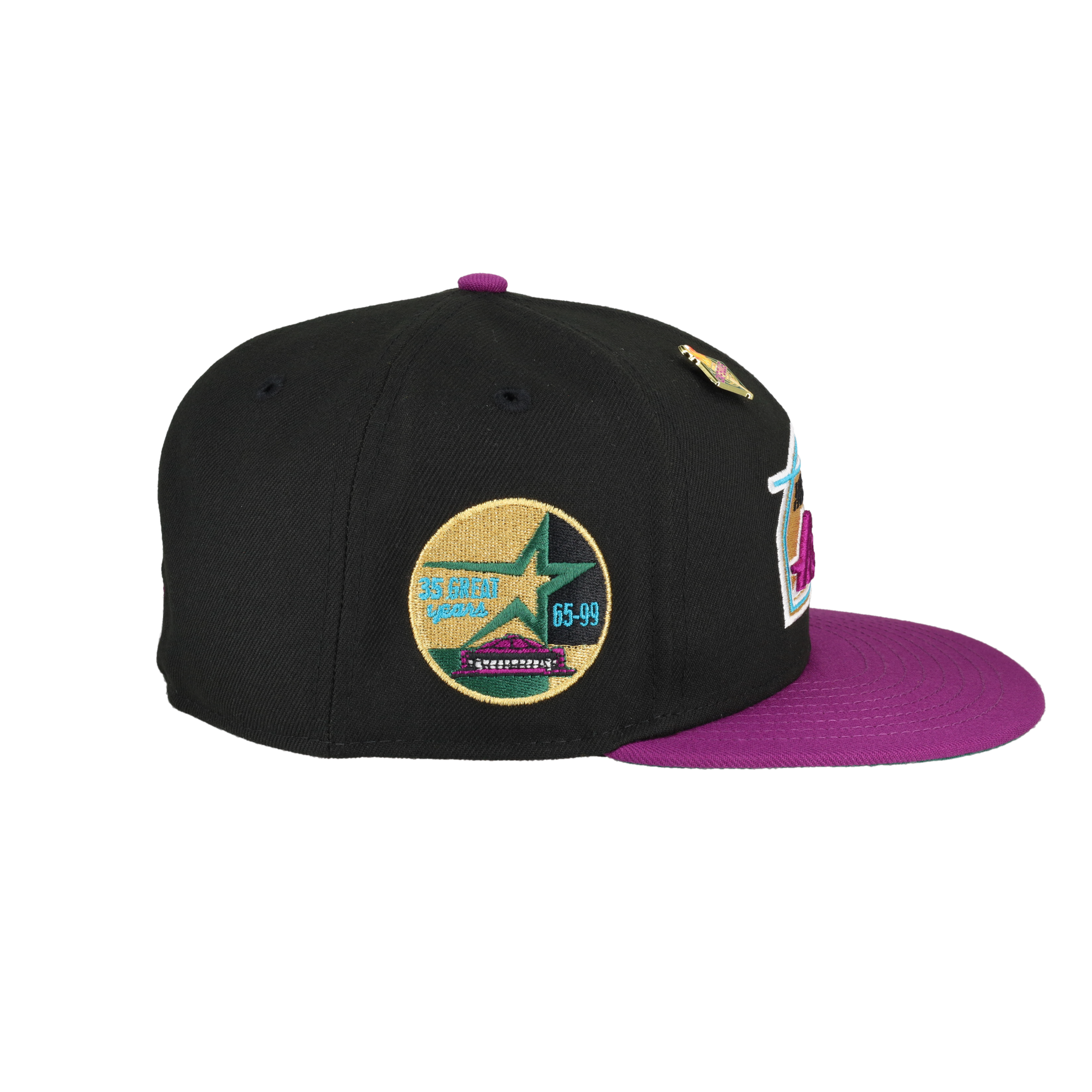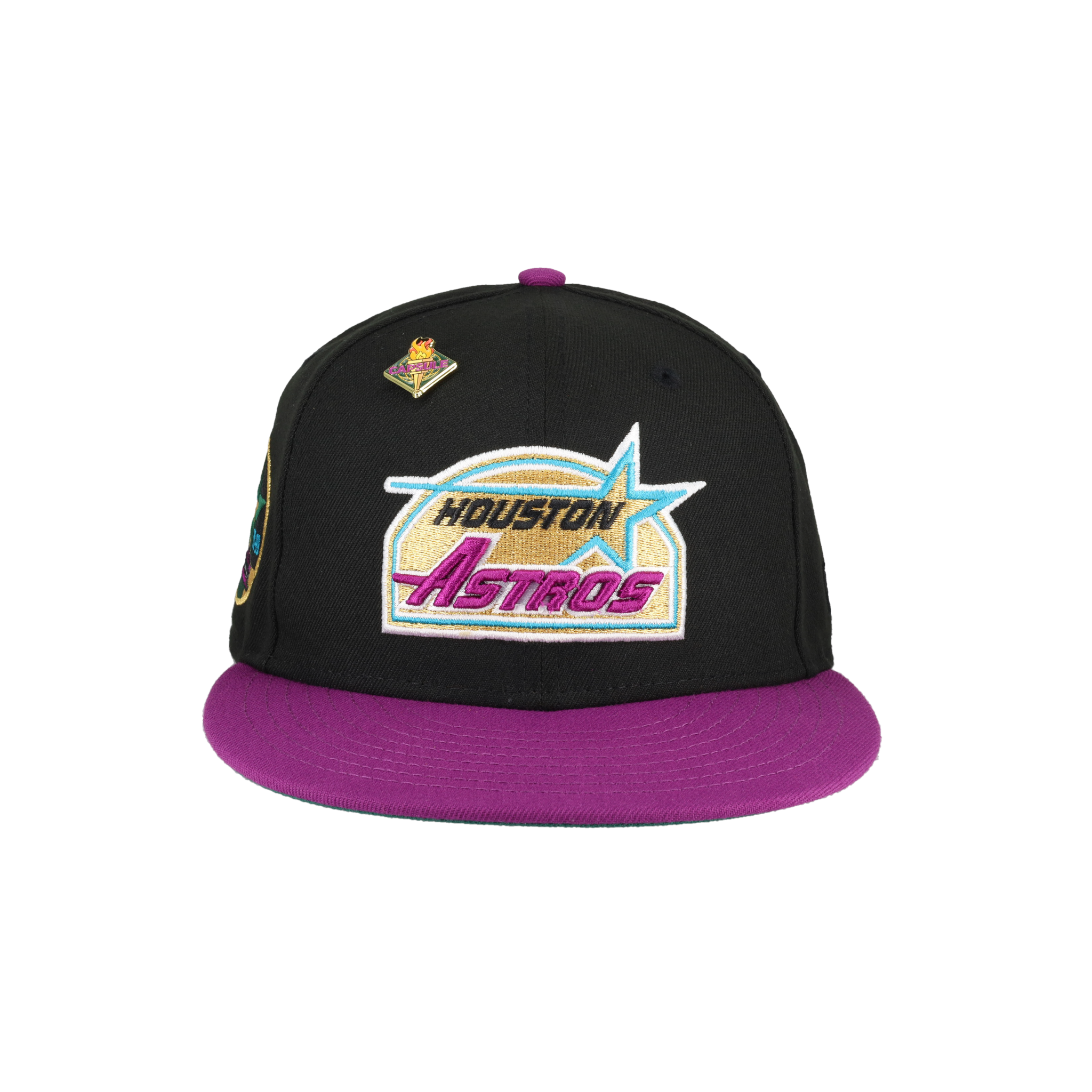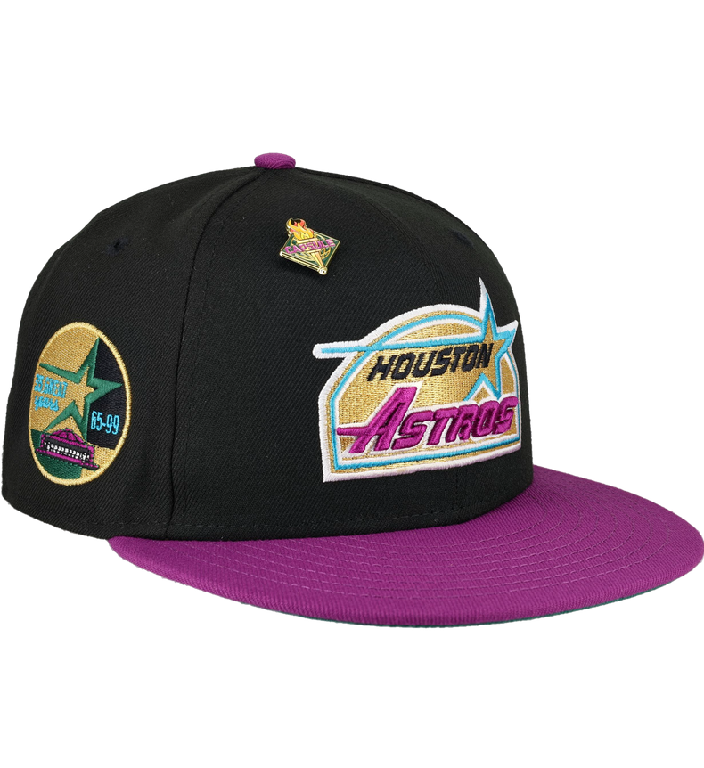 This New Era Houston Astros Torch Collection 35 Great Years 59FIFTY Fitted Hat was released by Capsule. The fitted has a black six panel structured high crown and embroidered eyelets with a grape purple fabric squatchee button. The flat bill of the fitted cap is also grape purple with a green bottom undervisor with a white sweatband. The front panel features the Houston Astros logo embroidery with a side patch on the right panel in a black, purple and white colorway. The left panel of the fitted displays the New Era logo and the official MLB Batterman on the rear-crown .