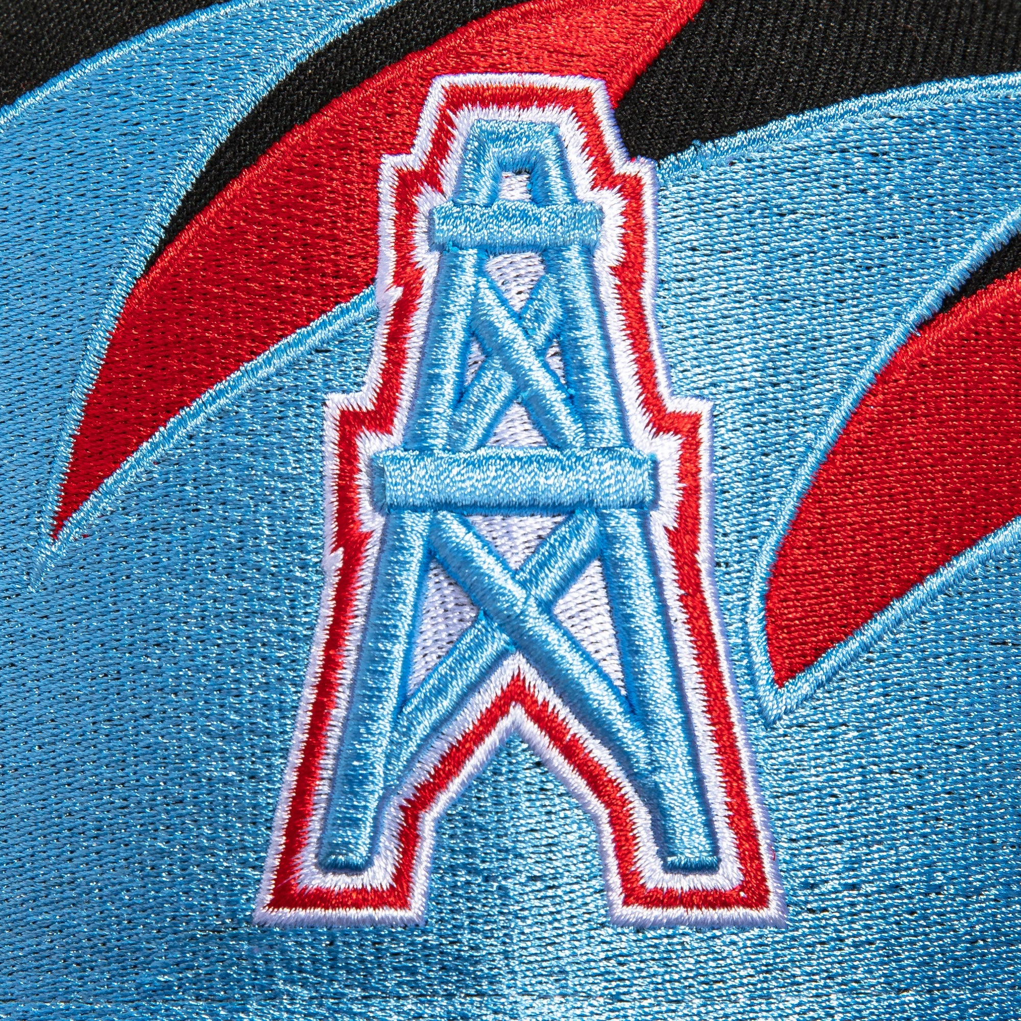 This New Era Houston Oilers SharkTooth 1990 Pro Bowl 59FIFTY Fitted Hat was released by Hat Club. The fitted has a black six panel structured high crown, fabric squatchee button and brim with a grey undervisor. The front panel features a shark tooth pattern with the Houston Oilers logo embroidery. The left panel includes the New Era logo embroidery and the official NFL shield on the rear crown.
