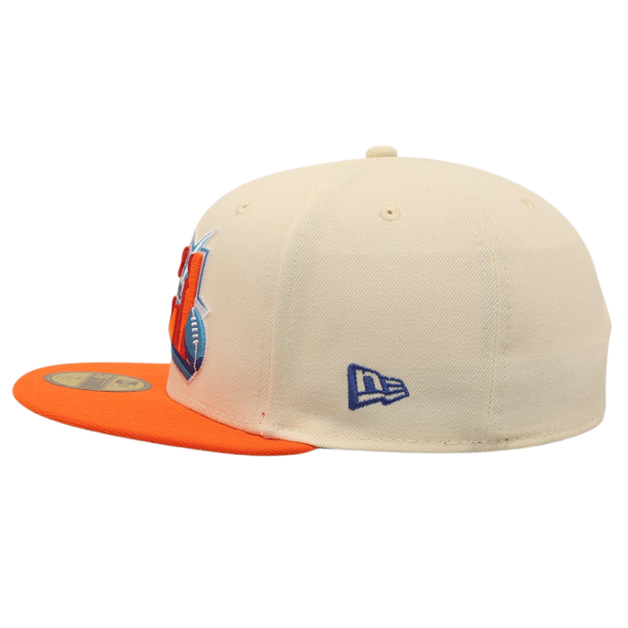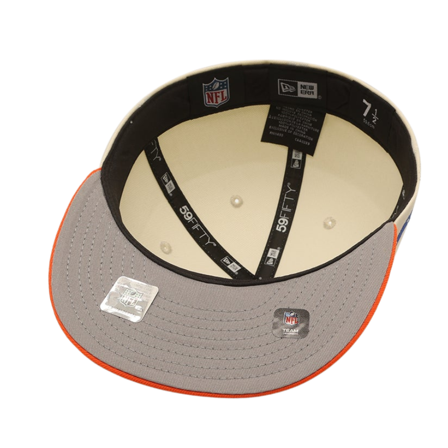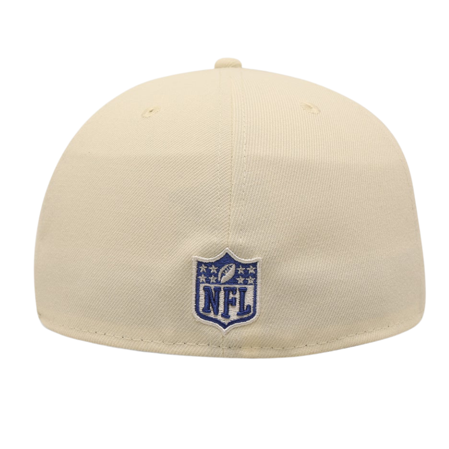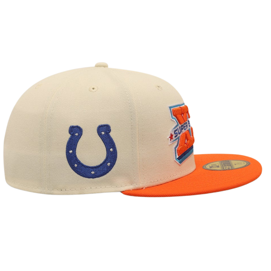 This New Era Indianapolis Colts '2007 Super Bowl' Chrome White 2023 59FIFTY Fitted Hat was released by Culture Kings. The fitted has a chrome six panel structured high crown and embroidered eyelets with a chrome fabric squatchee button. The flat bill of the fitted cap is also orange with a gray undervisor and black sweatband. The front panel features a Super Bowl logo embroidery and the New Era "Fly Your Own Flag" logo on the left panel. The rear crown has the official NFL logo on display.