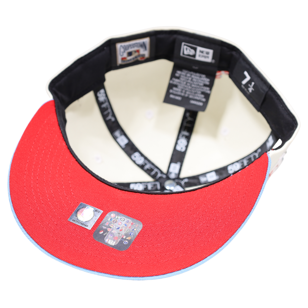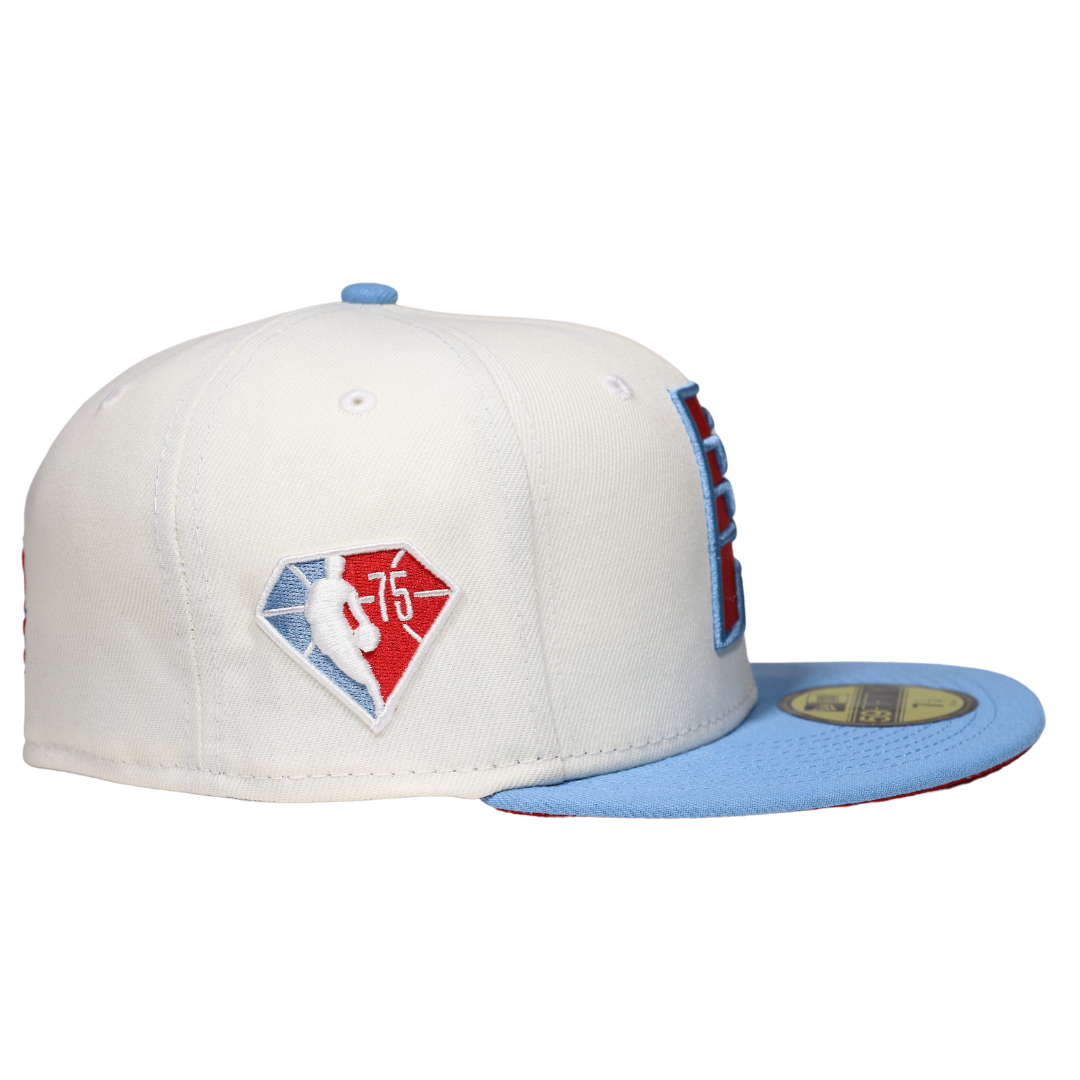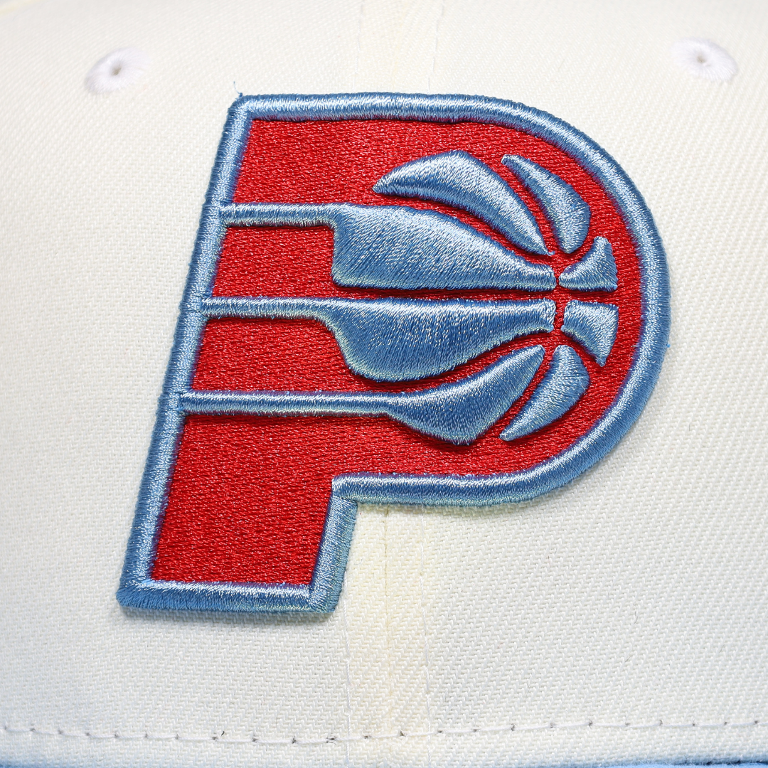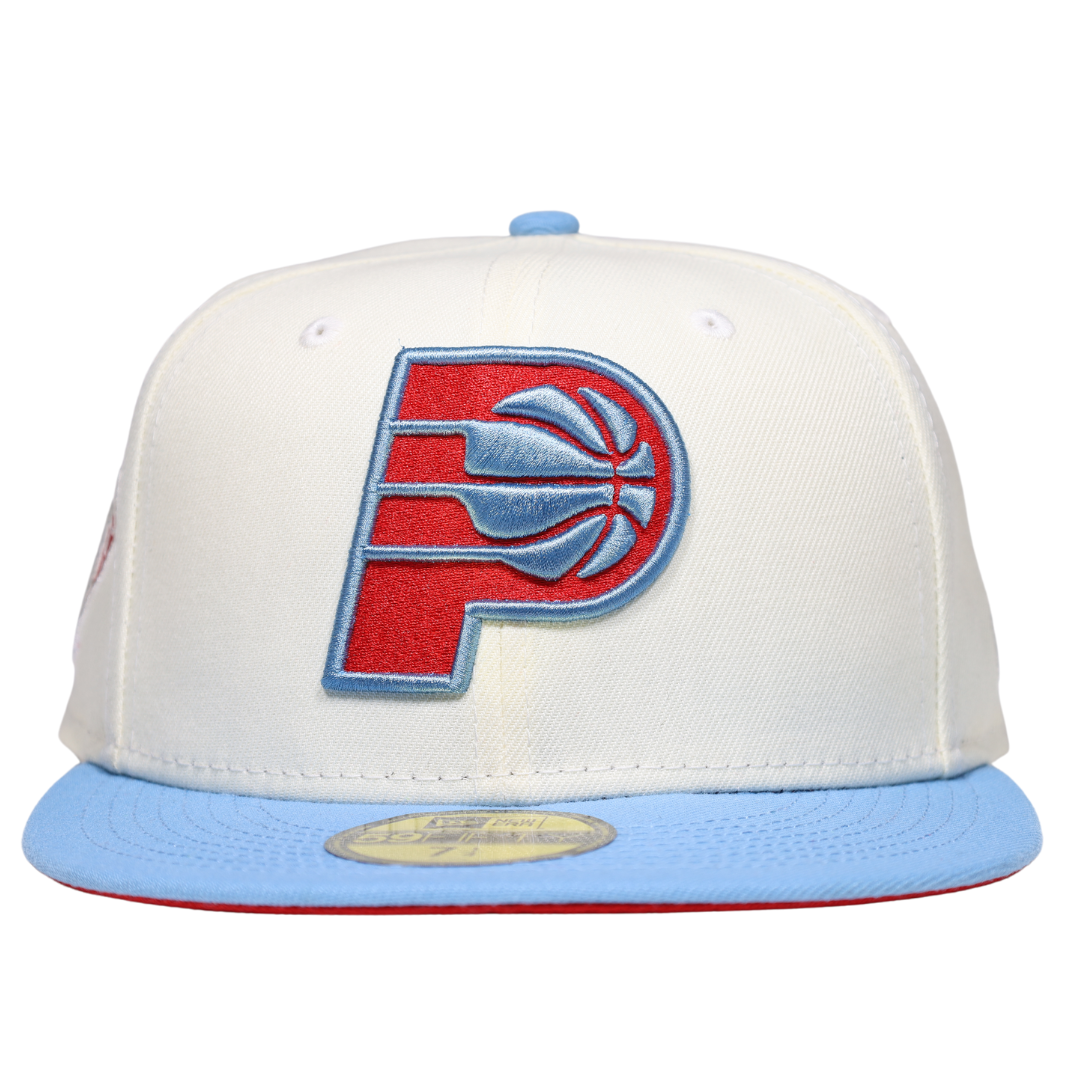 This New Era Indiana Pacers Nba 75Th Anniversary 59FIFTY Fitted Hat has a six panel structured high crown and embroidered eyelets with a fabric squatchee button. The fitted cap has a flat bill with a sweatband. The front panel features the Indiana Pacers logo embroidery.