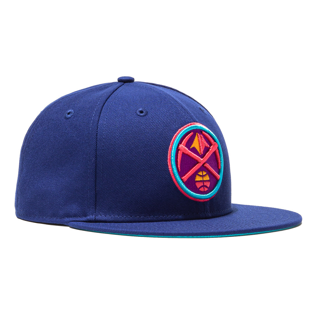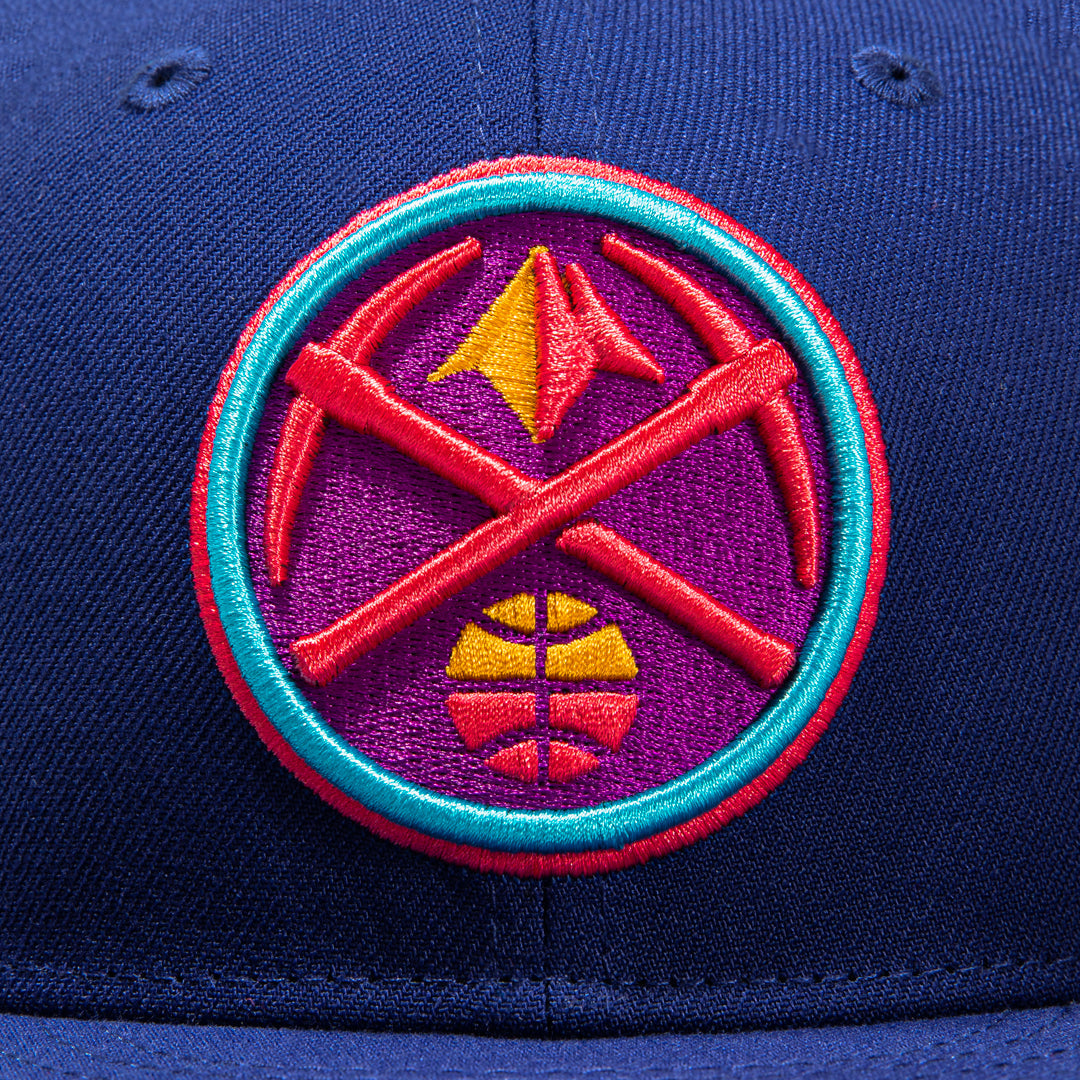 This New Era Interstellar Jelly Denver Nuggets 59FIFTY Fitted Hat is a Hat Club Exclusive. It has a royal blue six panel structured high crown and embroidered eyelets with a royal blue fabric squatchee button. The fitted cap has a royal blue flat bill with a teal undervisor and white sweatband. The front panel features the Denver Nuggets logo embroidery. The left panel of the fitted displays the New Era logo and the official NBA logo embroidery on the rear crown.