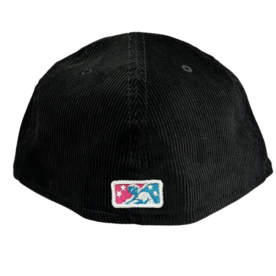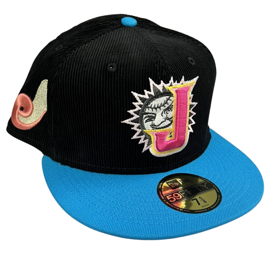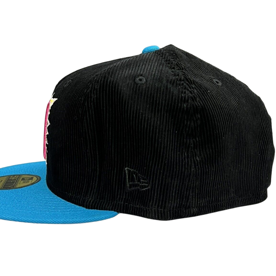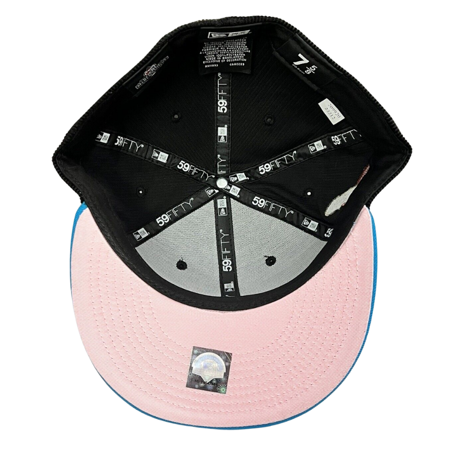 This New Era New Era Jacksonville Suns 59FIFTY fitted hat is a My Fitteds exclusive. The fitted features a black corduroy six panel structured high crown and eyelets with a blue fabric squatchee button and flat bill. The undervisor of the fitted is soft pink with a black sweatband. The front panel features the Jacksonville Suns logo embroidery and a side patch embroidered on the right panel.