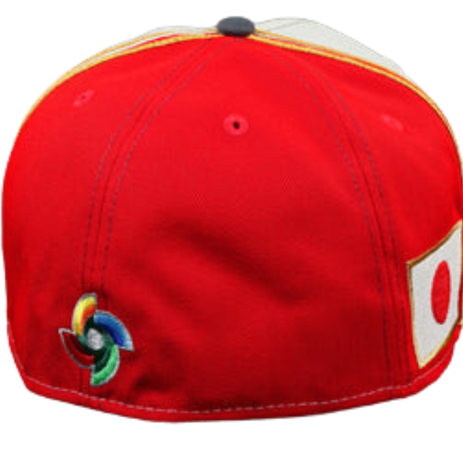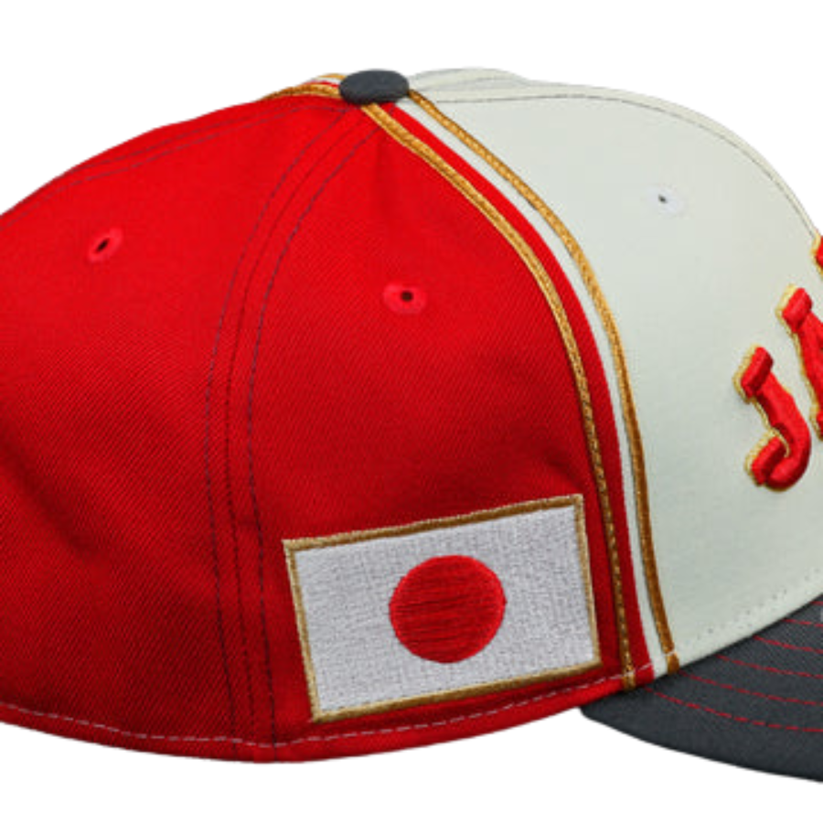 This Japan World Baseball Classic fitted hat was released by My Fitteds. The fitted has an off-white and red six panel structured high crown and embroidered eyelets with a graphite fabric squatchee button. The fitted cap also has a graphite flat bill with a green undervisor. The front panel features the Japan script logo embroidery and a Japan symbol side patch on the right panel. The left panel of the fitted displays the New Era logo and the official World Baseball Classic logo embroidery on the rear crown.