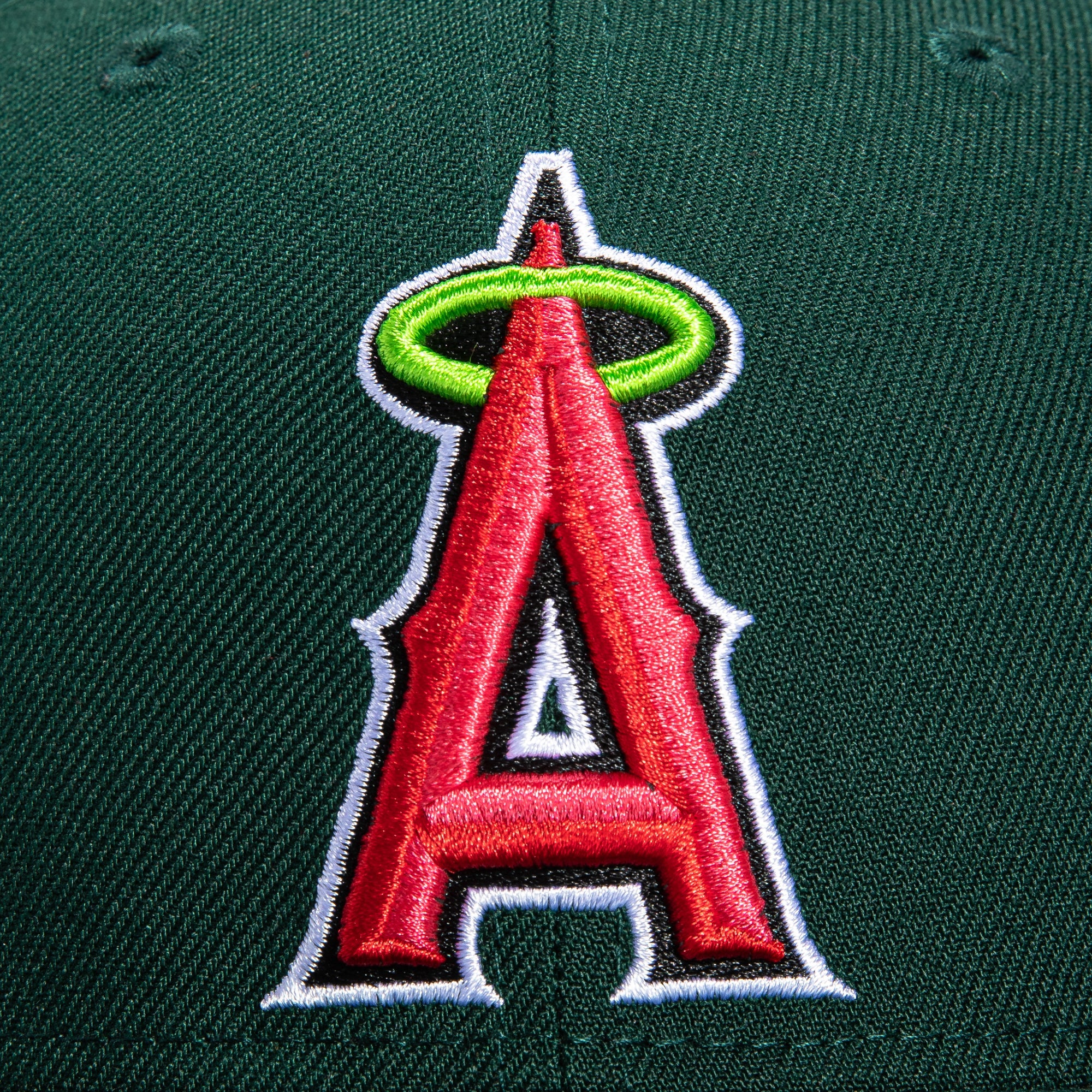 This New Era Los Angeles Angels 2002 World Series 'Watermelon' 59FIFTY Fitted Hat was originally released by Hat Club. The fitted has a dark green six panel structured high crown, embroidered eyelets and fabric squatchee button. The flat bill of the fitted cap is also dark green with a red bottom undervisor. The front panel features the Los Angeles Angels logo embroidery and a side patch embroidered on the right panel. The left panel of the fitted displays the New Era logo and the official MLB insignia embroidered on the rear crown. The fitted hat colorway is inspired by the colors of a watermelon.