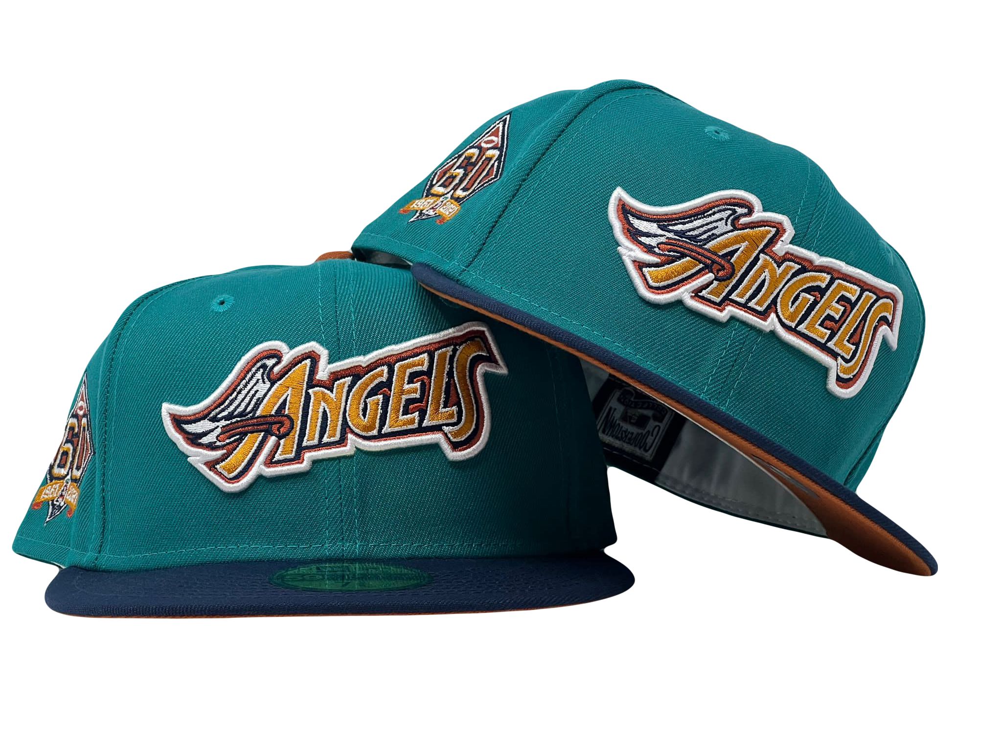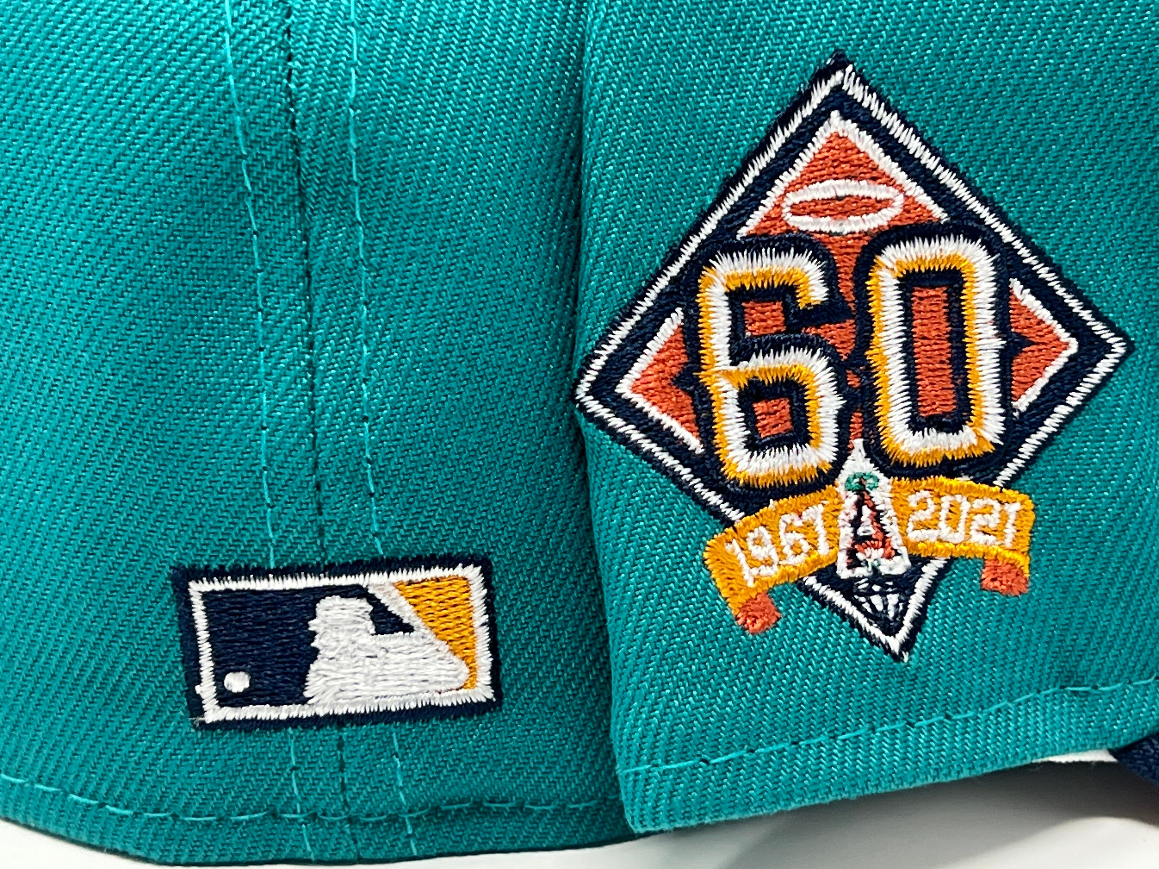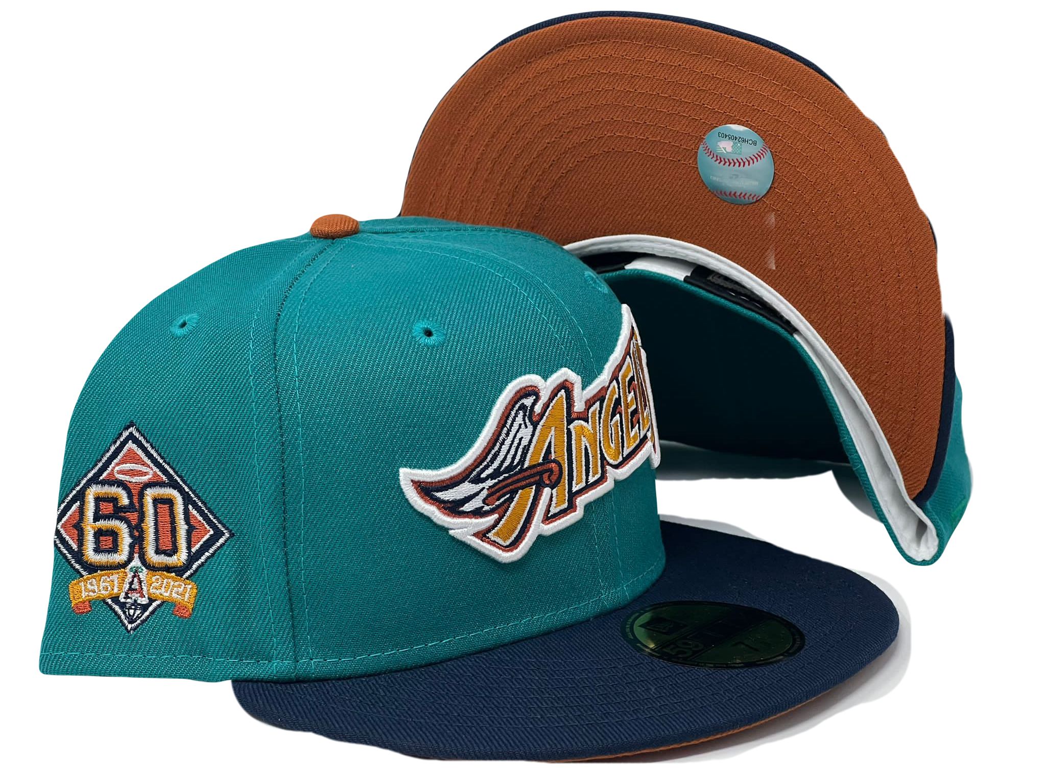This New Era Los Angeles Angels 60th Anniversary "Galaxy Part 2" Rust Orange UV 59FIFTY Fitted Hat was released by Sports World 165. The fitted has a turquoise six panel structured high crown and embroidered eyelets with a rust orange fabric squatchee button. The flat bill of the fitted cap is also navy with a rust orange undervisor and white sweatband. The front panel features the Los Angeles Angels logo embroidery and _ side patch on the right panel. The New Era "Fly Your Own Flag" logo is embroidered on the left panel and the rear crown has the official MLB logo on display.