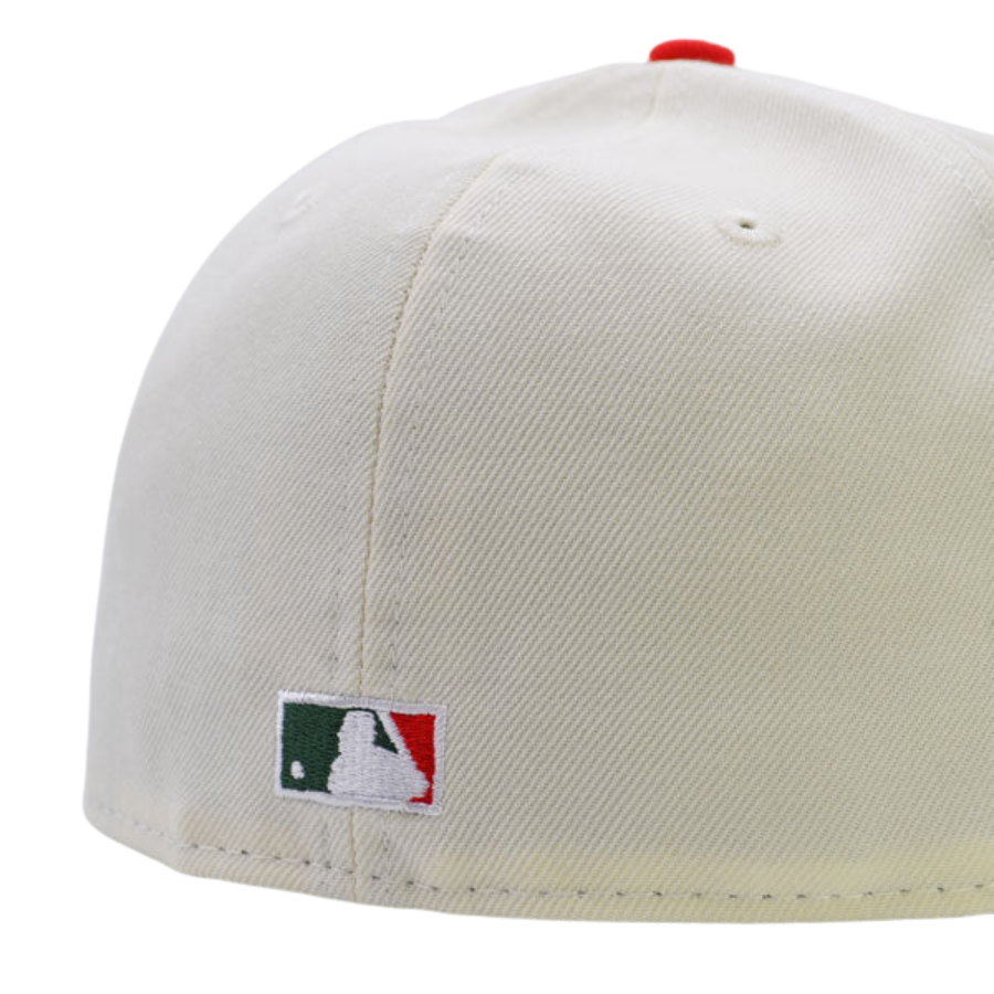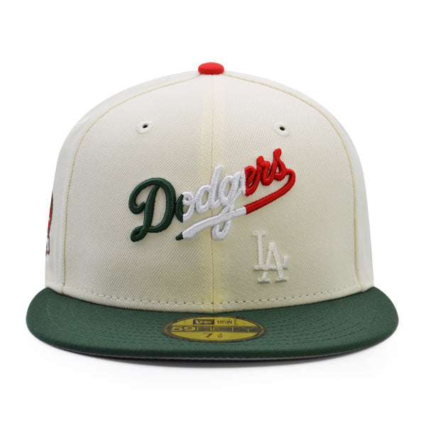 This New Era Los Angeles Dodgers 60th Anniversary Chrome/Mountain Green 59FIFTY Fitted Hat was released by Hat Dreams. The fitted has a chrome six panel structured high crown and embroidered eyelets with a red fabric squatchee button. The fitted cap also has a mountain green flat bill with a gray undervisor. The front panel features the LA Dodgers logo embroidery and a 60th Anniversary side patch embroidery on the right panel. The left panel of the fitted displays the New Era logo and the official MLB Batterman logo embroidery on the rear crown.