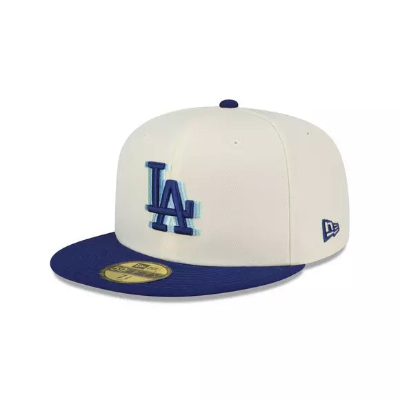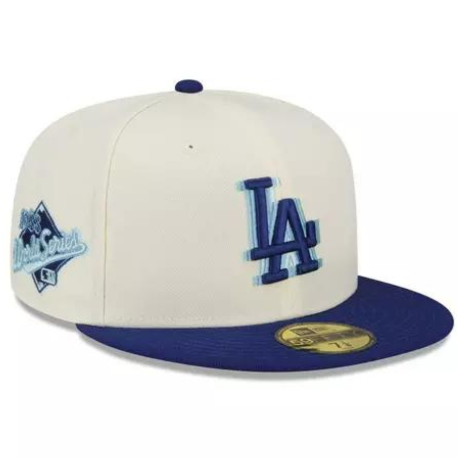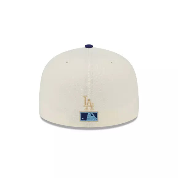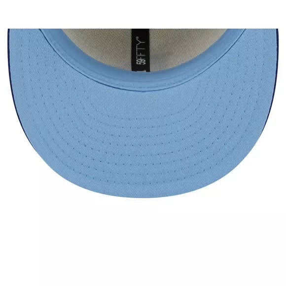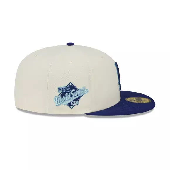This New Era Los Angeles Dodgers 59FIFTY fitted hat is a Hibbett exclusive. The six panel structured high crown and embroidered eyelets are chrome with a royal blue fabric squatchee button and flat bill. The fitted has a sky blue bottom undervisor and sweatband. The front panel includes the LA Dodgers logo embroidery and a side patch on the right-wear side.