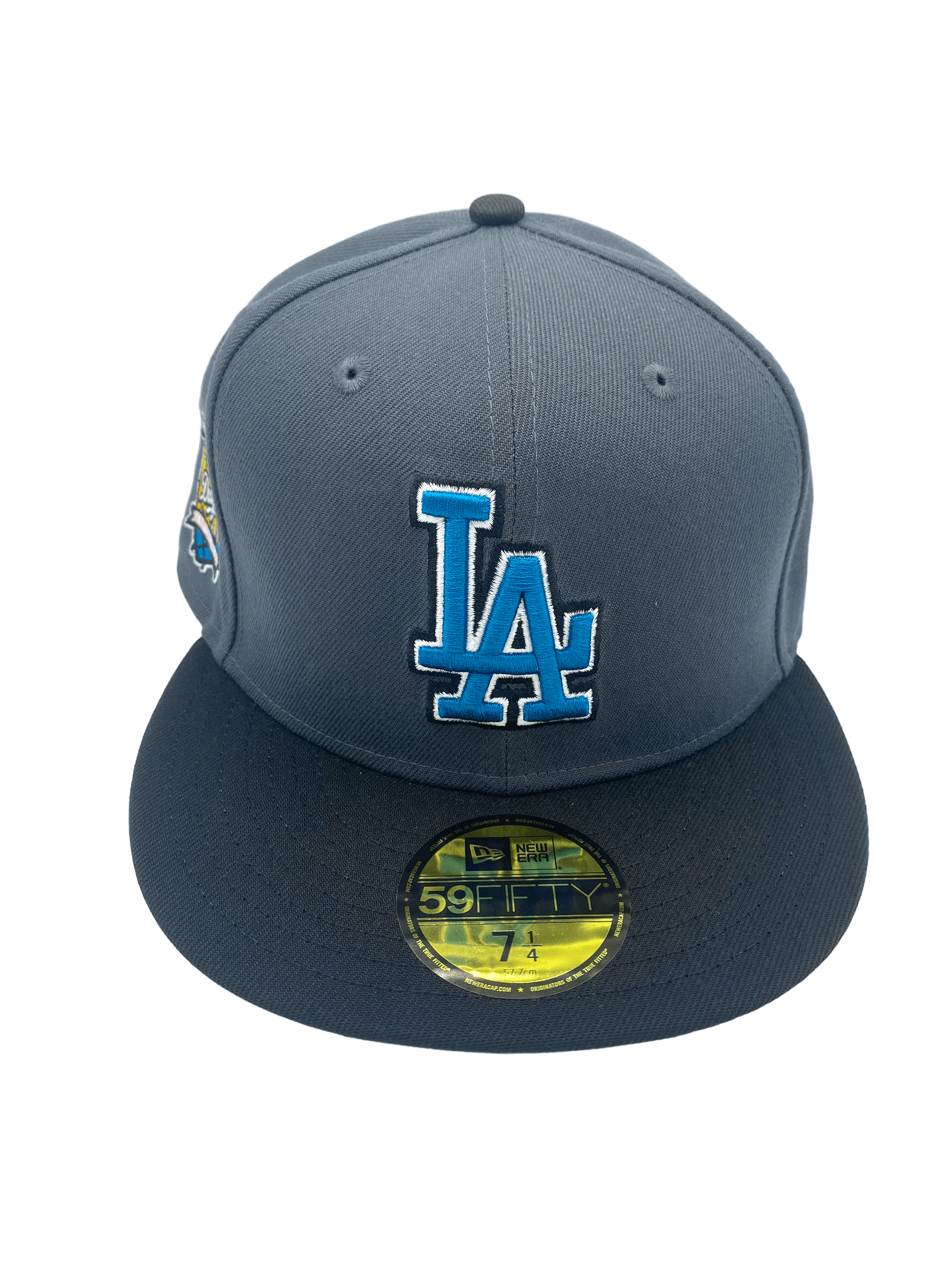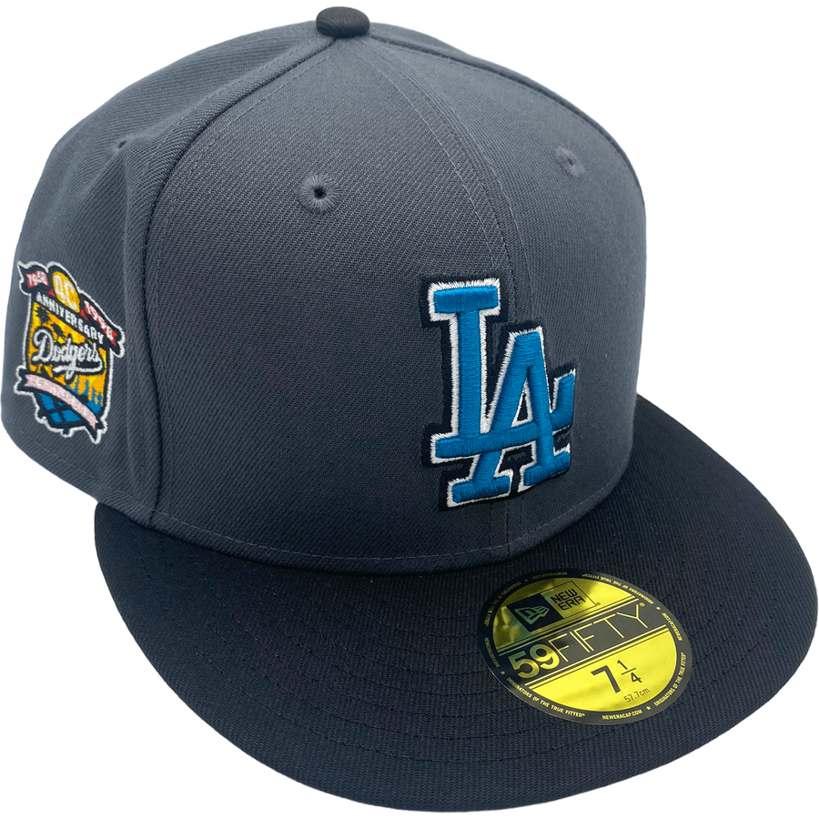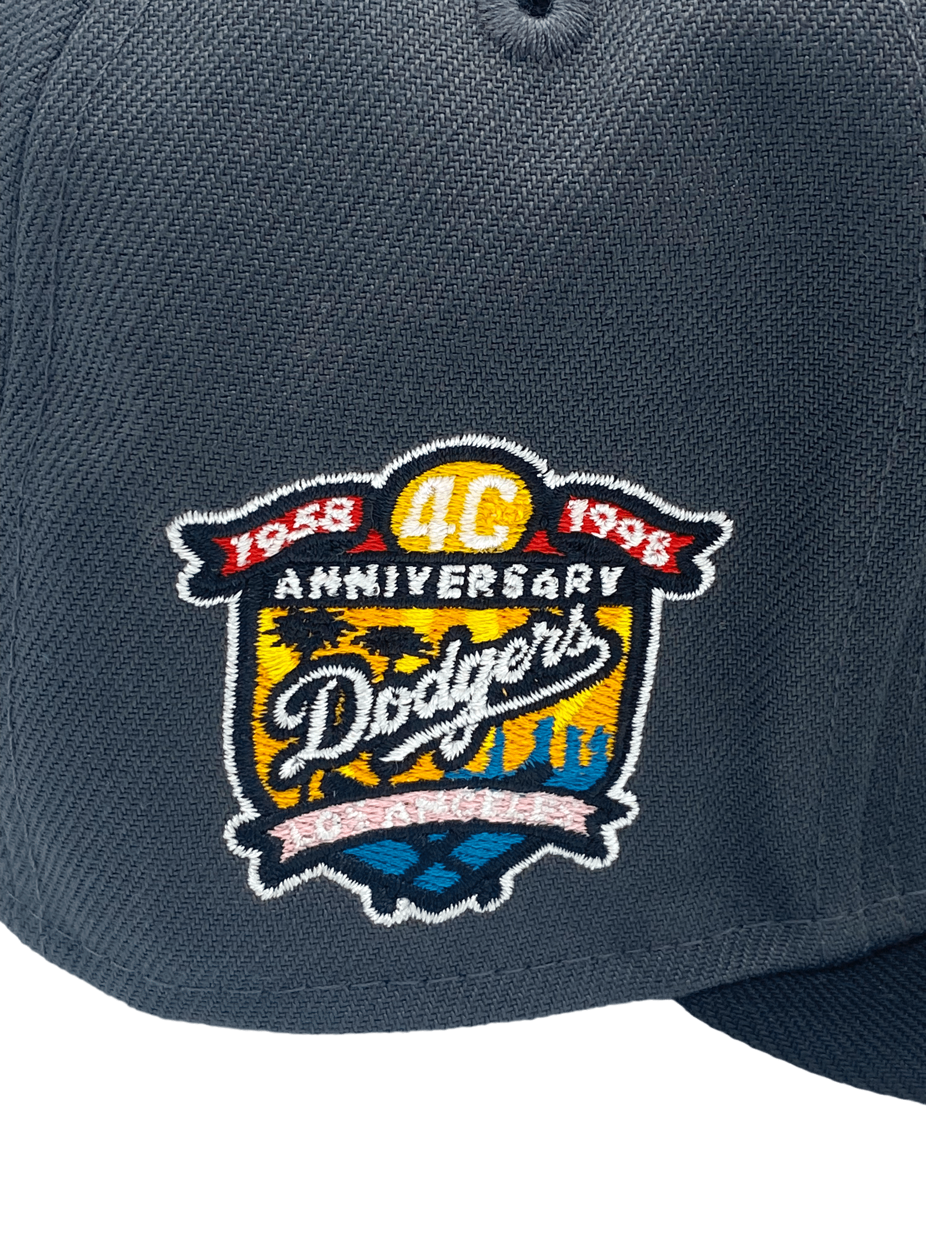This Los Angeles Dodgers 59FIFTY fitted hat was released by Pro Image Sports. The fitted has a graphite six panel structured high crown and embroidered eyelets with a black flat brim, fabric squatchee button and a grey undervisor. The front panel features a blue threaded Los Angeles Dodgers logo embroidery with a 40th Anniversary side patch on the right panel. The left panel of the fitted displays the New Era logo and the official MLB Batterman embroidery on the rear crown.