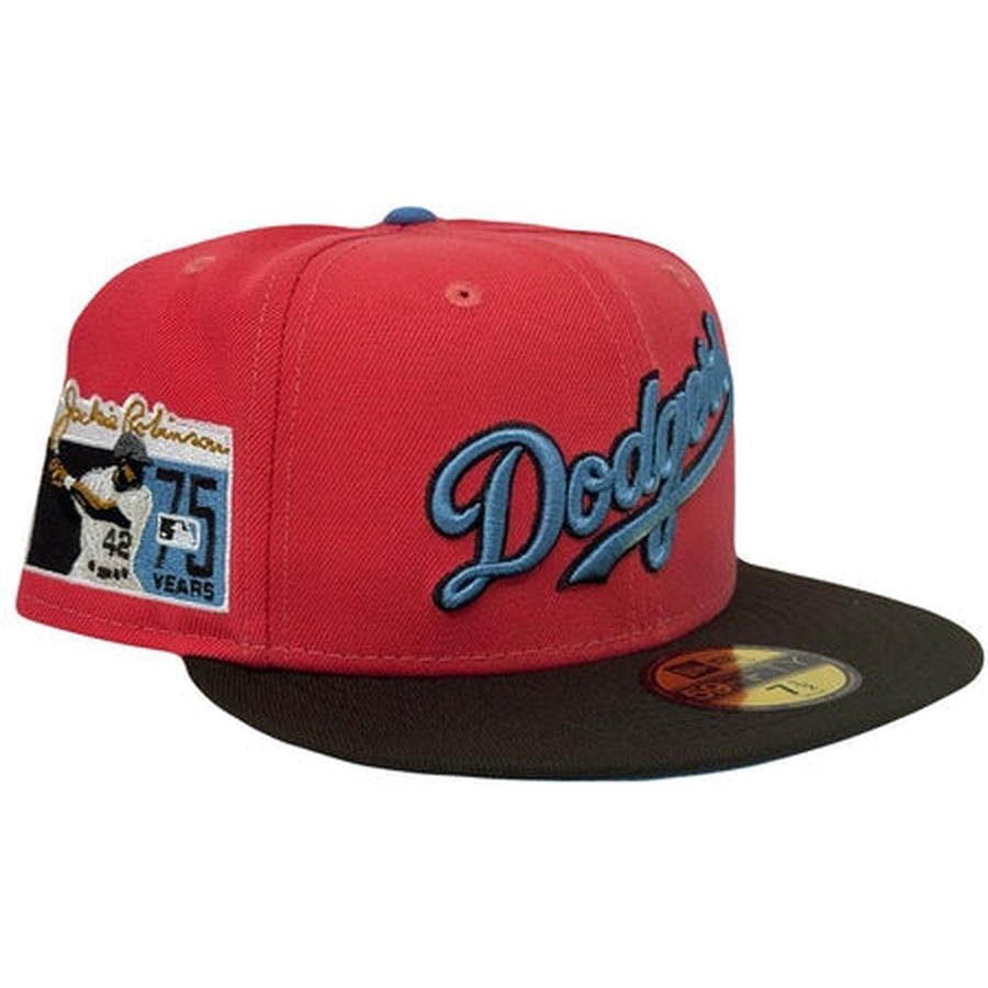 This Los Angeles Dodgers 59FIFTY fitted hat was released by Sports World 165. The fitted has a beetroot six panel structured high crown and embroidered eyelets with a sky blue fabric squatchee button. The fitted cap also has a brown flat bill with a sky blue undervisor and black sweatband. The front panel features a sky blue Los Angeles Dodgers script logo embroidery and a 75th Anniversary Jackie Robinson side patch embroidery on the right panel. The left panel of the fitted displays the New Era logo and the official MLB Batterman logo embroidery on the rear crown.