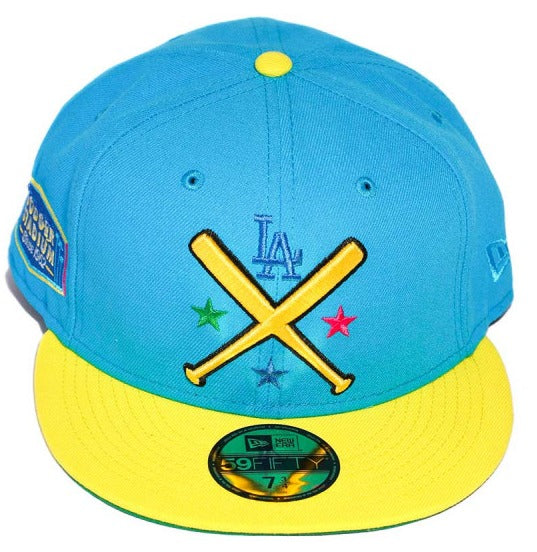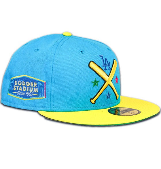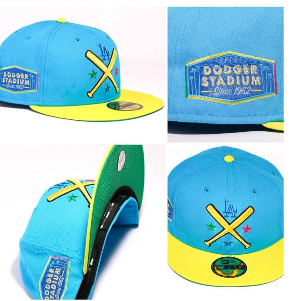 This Los Angeles Dodgers "Jaras" Dodger Stadium fitted hat has a sky blue six panel structured high crown and embroidered eyelets with a yellow fabric squatchee button. The fitted cap also has a yellow flat bill with a green undervisor and black sweatband. The front panel features the LA Dodgers logo embroidery and a Dodger Stadium side patch embroidery on the right panel. The left panel of the fitted displays the New Era logo and the official MLB logo embroidery on the rear crown.