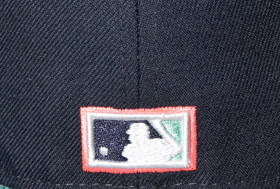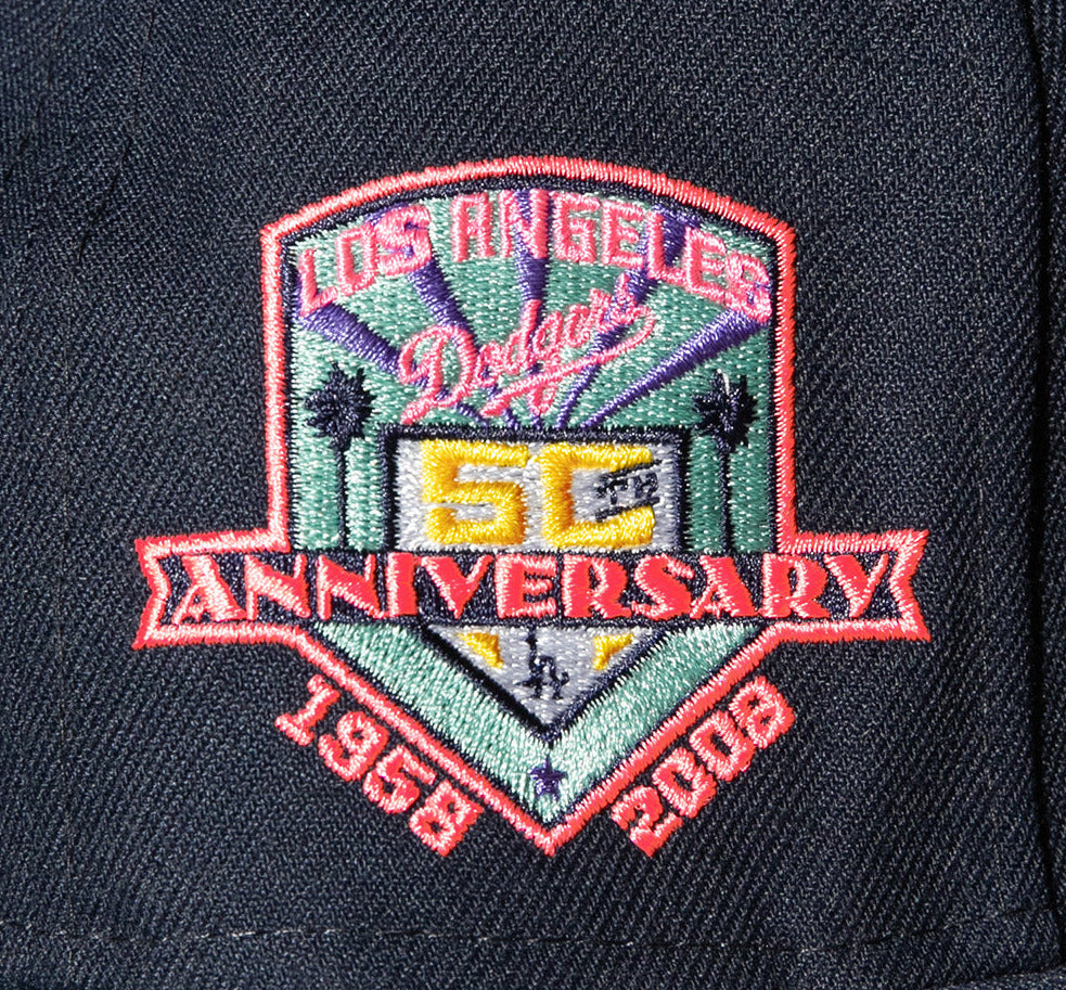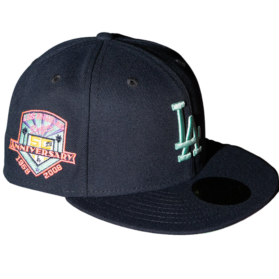 This New Era Los Angeles Dodgers Navy / Mint 50th Anniversary 59FIFTY Fitted Cap has a navy blue six panel structured high crown and embroidered eyelets with a navy blue fabric squatchee button. The fitted cap has a navy blue flat bill with a mint undervisor. The front panel features the Los Angeles Dodgers logo embroidery and a 50th Anniversary side patch embroidery on the right panel. The left panel of the fitted displays the New Era logo and the official MLB logo embroidery on the rear crown.