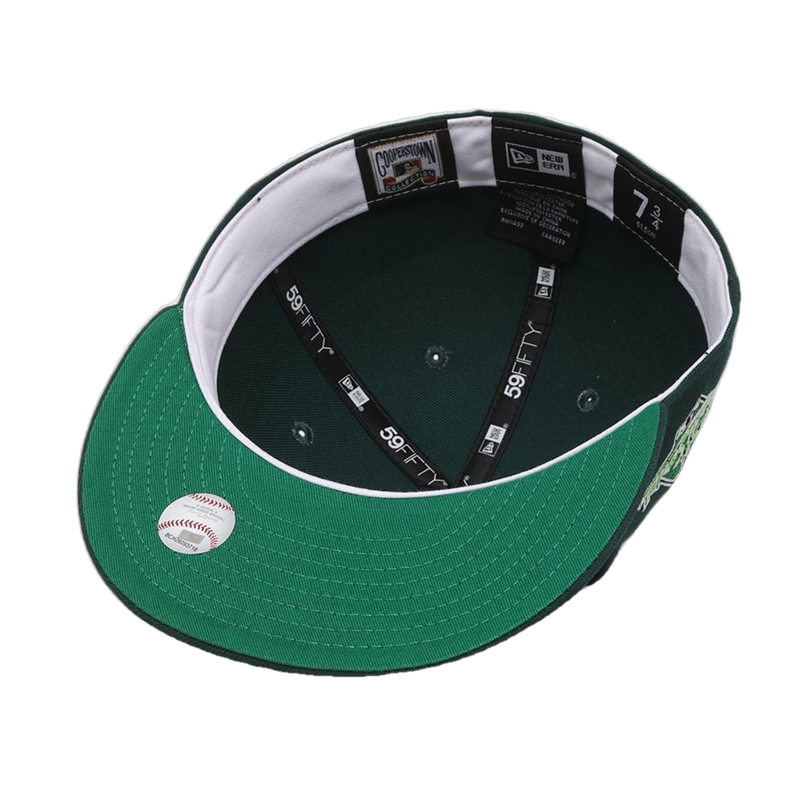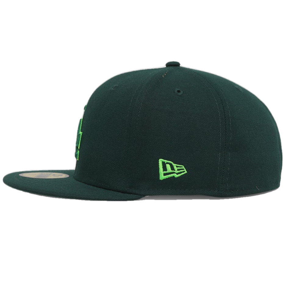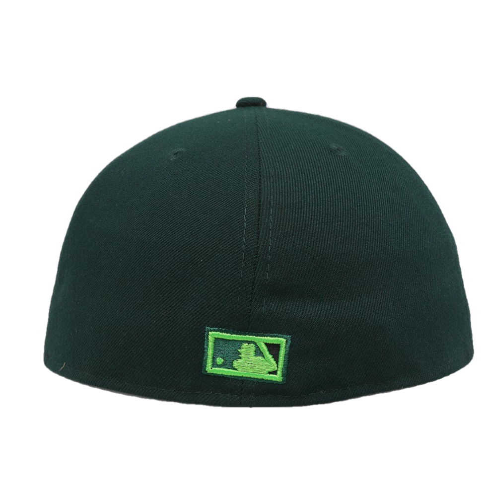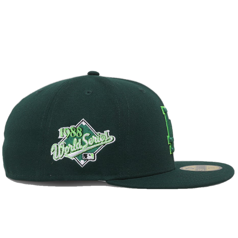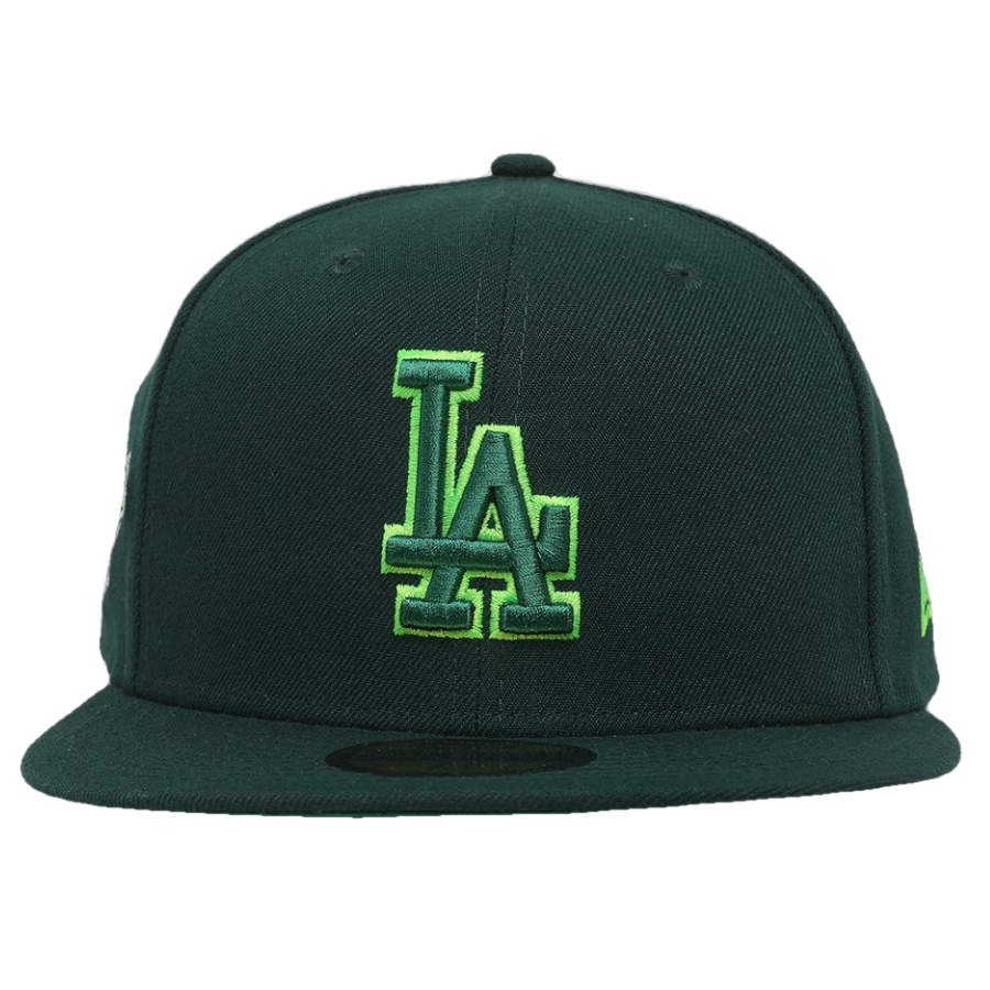 This New Era Los Angeles Dodgers 'Christmas Tree' Green 59FIFTY Fitted Hat was released by Culture Kings. The Christmas Tree fitted has a dark green six panel structured high crown, embroidered eyelets and fabric squatchee button. The fitted has a dark green flat visor with a kelly green undervisor. The front panel features the Los Angeles Dodgers logo embroidered in green stitching. The left panel of the fitted displays the New Era logo and the official MLB logo embroidery on the rear crown.