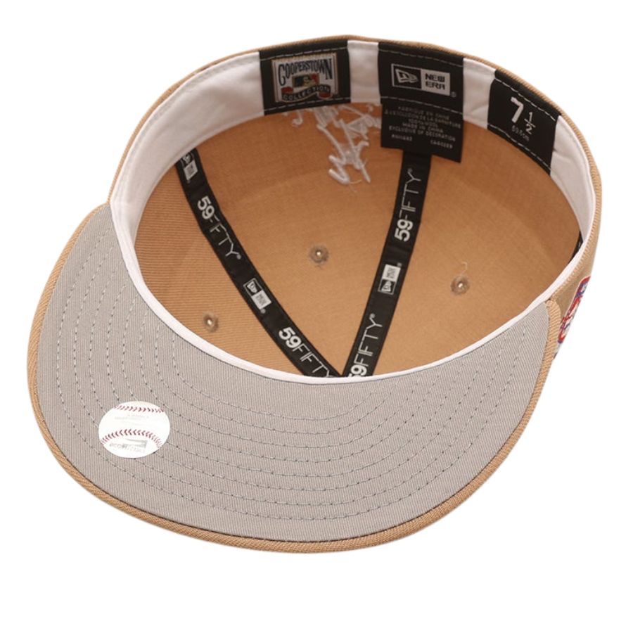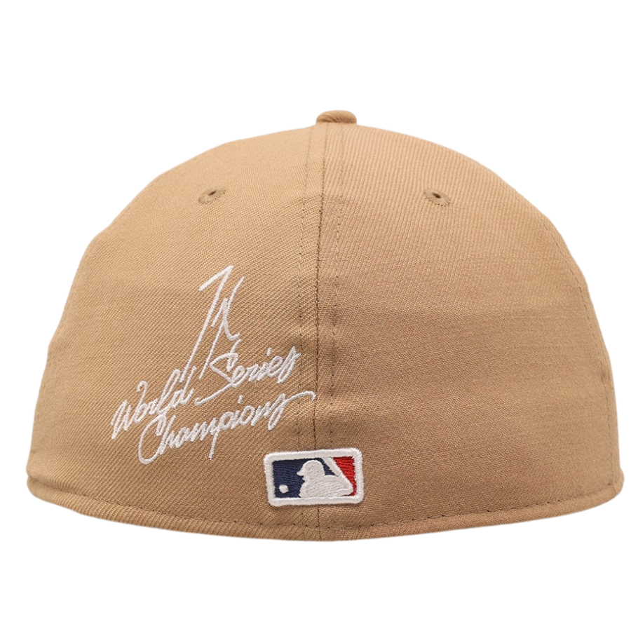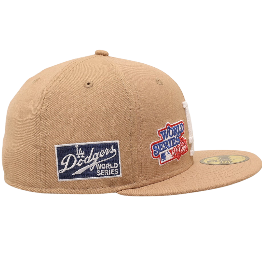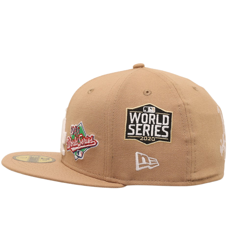 This New Era Los Angeles Dodgers 'World Series Multi Logo' Tumbleweed 2023 59FIFTY Fitted Hat was released by Culture Kings. The fitted has a tan six panel structured high crown and embroidered eyelets with a tan fabric squatchee button. The flat bill of the fitted cap is also tan with a gray undervisor and white sweatband. The front panel features the Los Angeles Dodgers logo embroidery and the New Era "Fly Your Own Flag" logo on the left panel. The rear crown has the official MLB logo on display.
