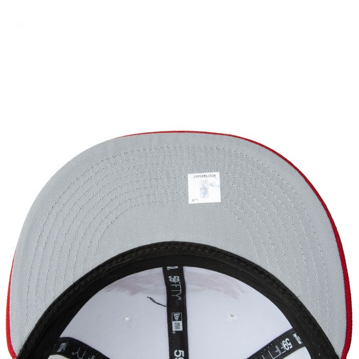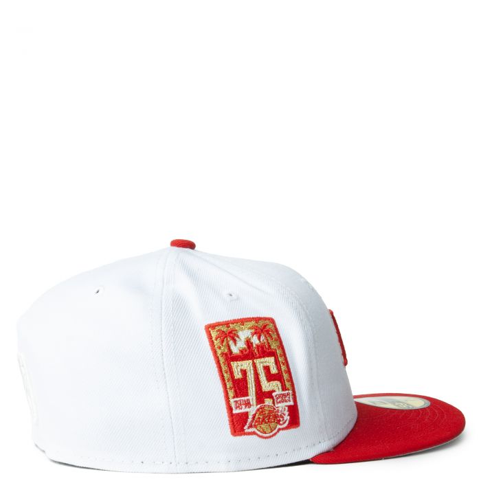 This New Era Los Angeles Lakers White/Red/Gold 75th Anniversary 59FIFTY Fitted Hat was released by Karma Loop. The fitted has a white six panel structured high crown and embroidered eyelets with a red fabric squatchee button. The fitted cap also has a red flat bill with a grey undervisor and black sweatband. The front panel features the Los Angeles Lakers logo embroidery and a 75th Anniversary side patch embroidery on the right panel. The left panel of the fitted displays the New Era logo and the official NBA logo embroidery on the rear crown.