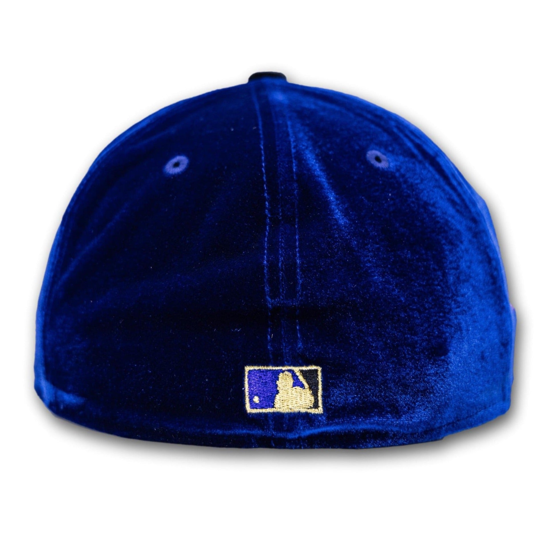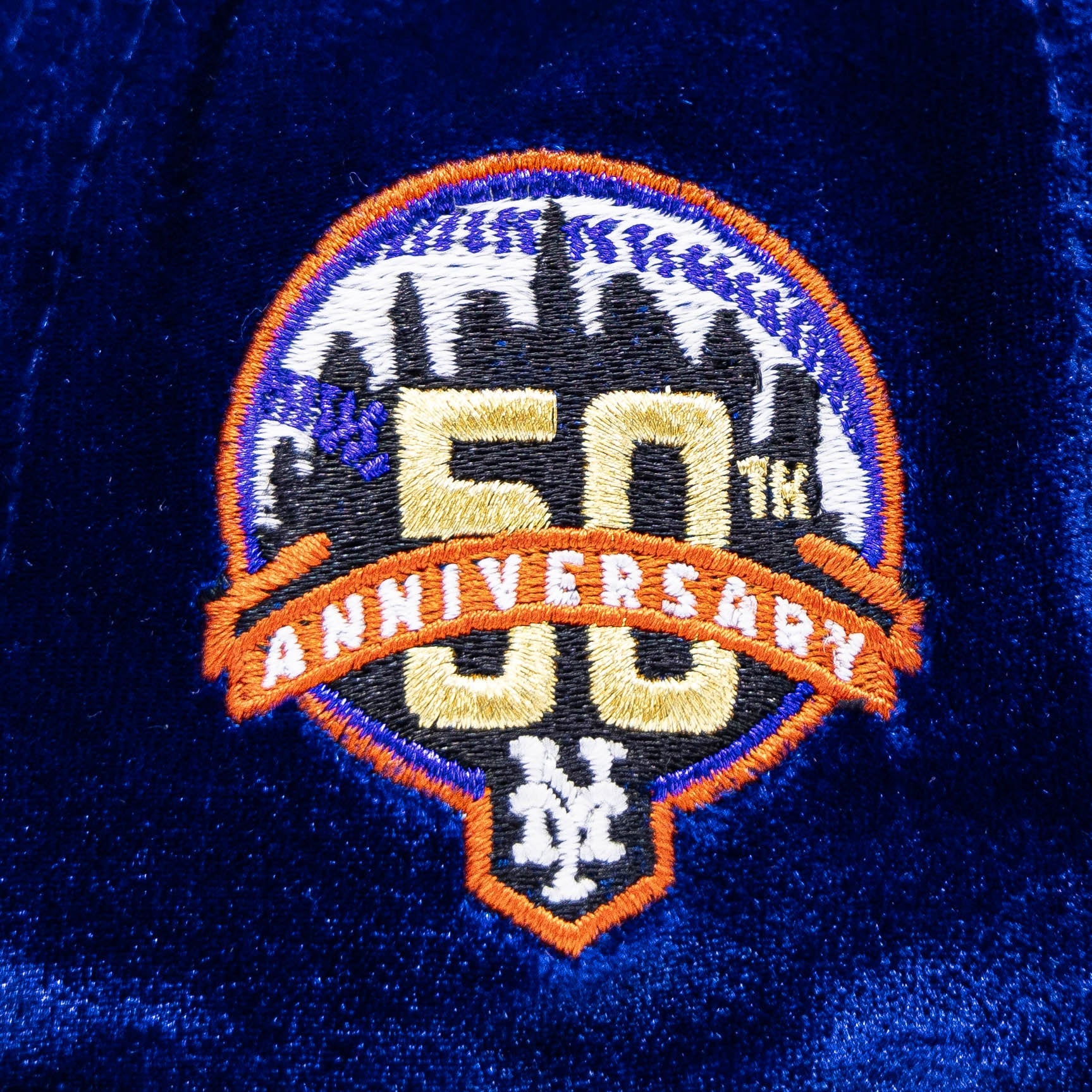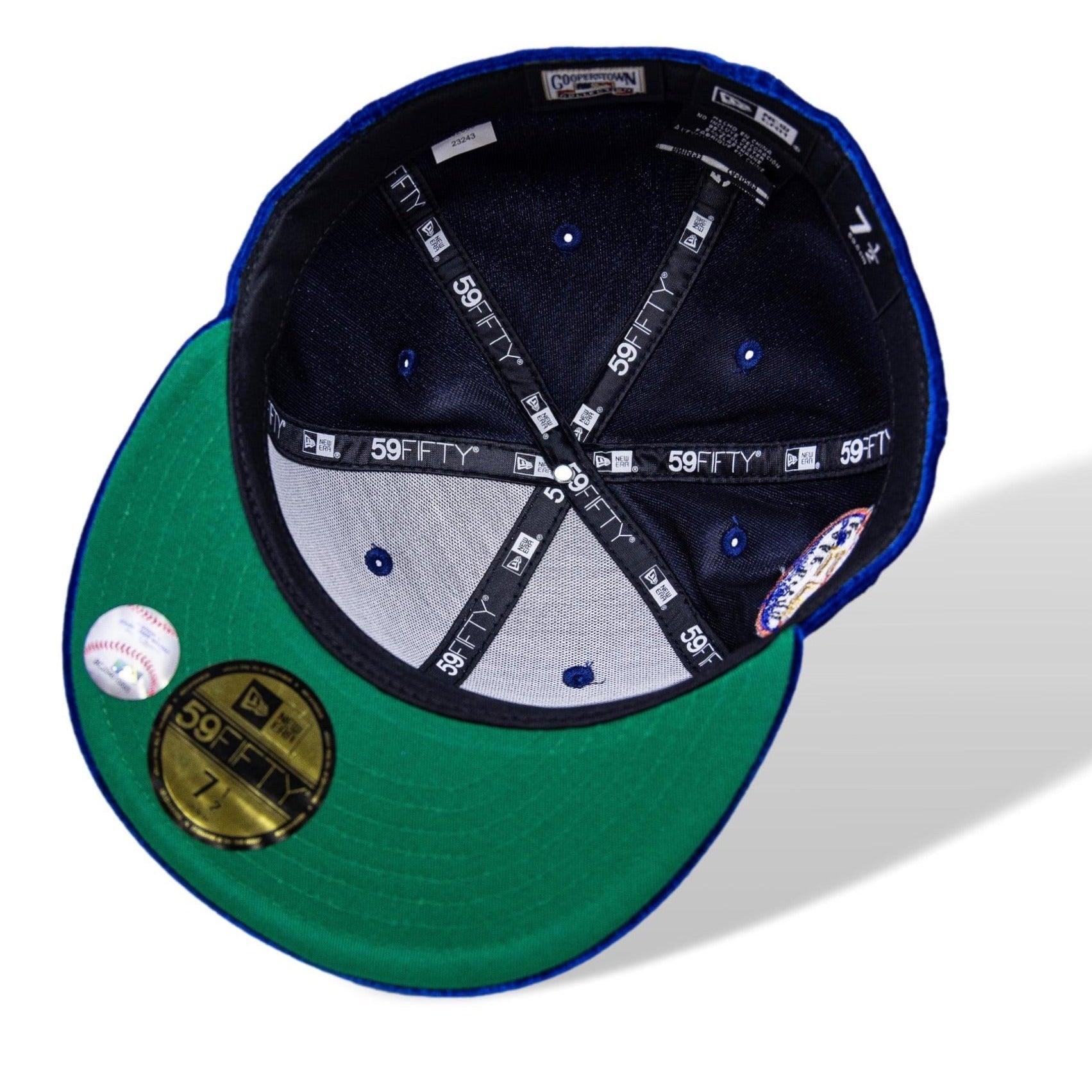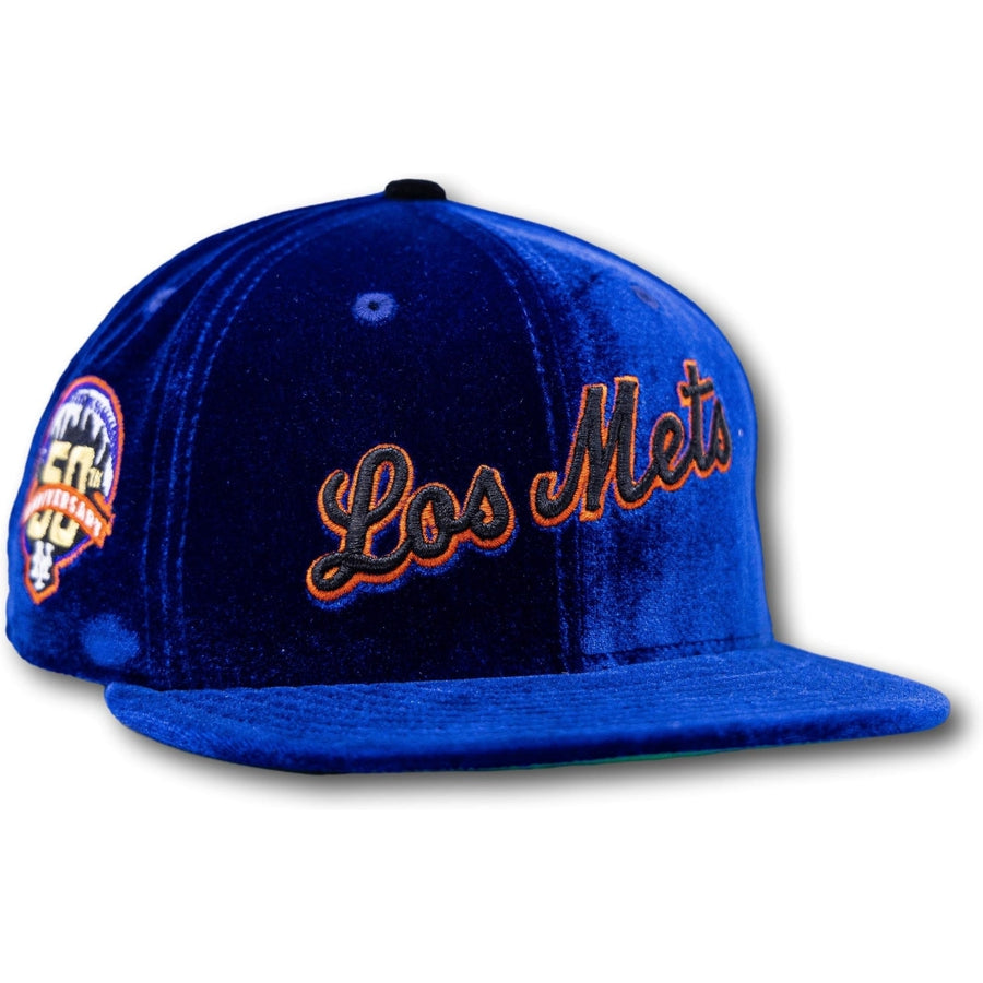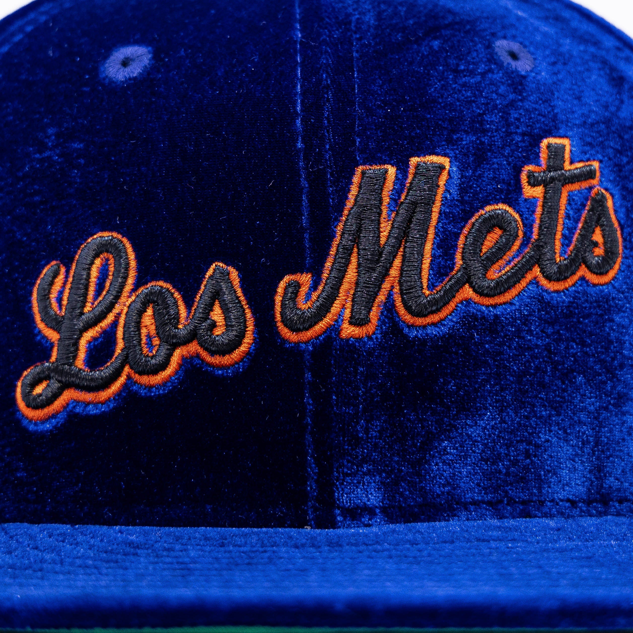 This Los Mets fitted hat was released by All The Right. The fitted has a blue velvet six panel structured high crown and embroidered eyelets with a blue velvet fabric squatchee button. The flat bill of the cap is also blue velvet with a green bottom undervisor and black sweatband. The front panel features the Los Mets script logo embroidery and a 50th Anniversary side patch embroidery on the right panel.