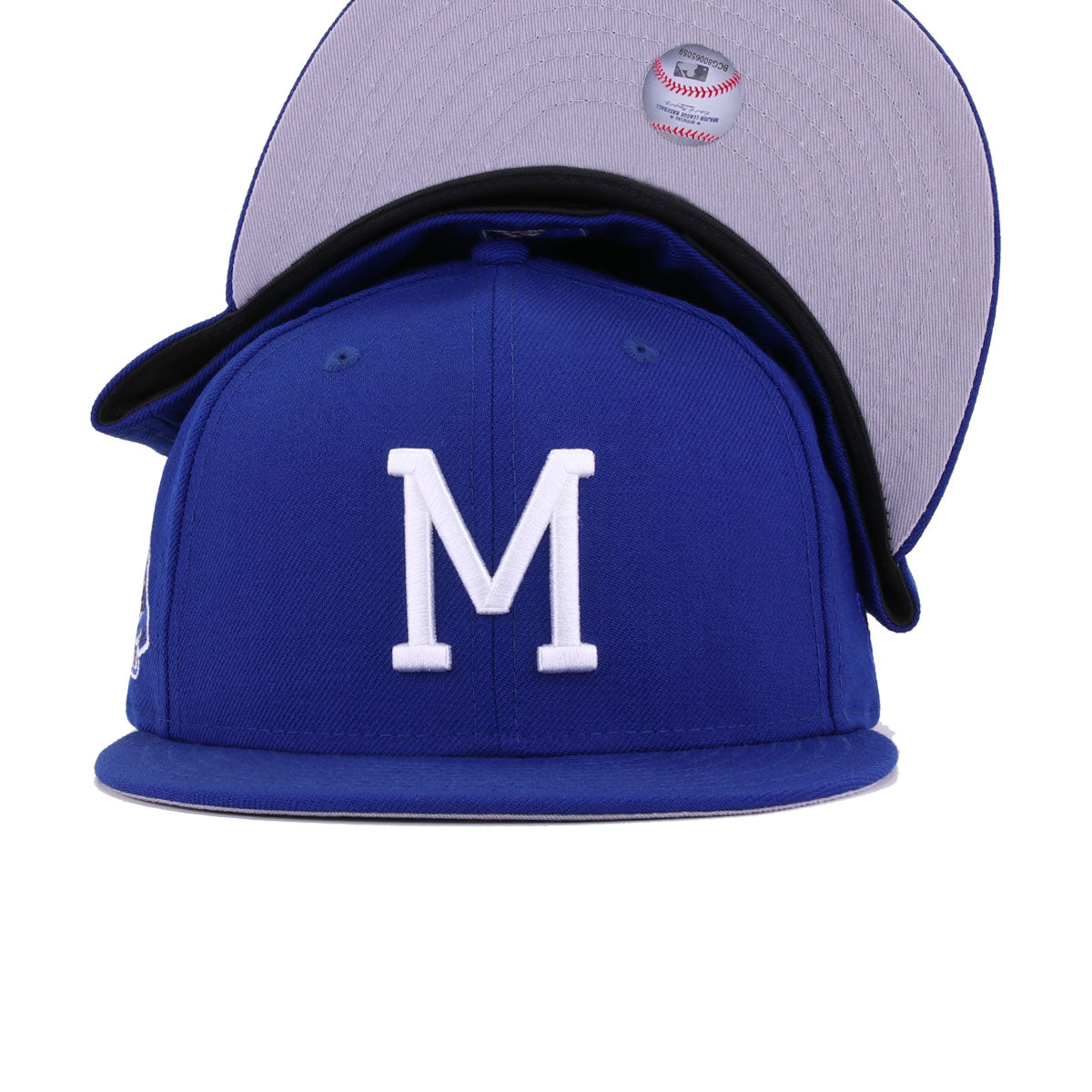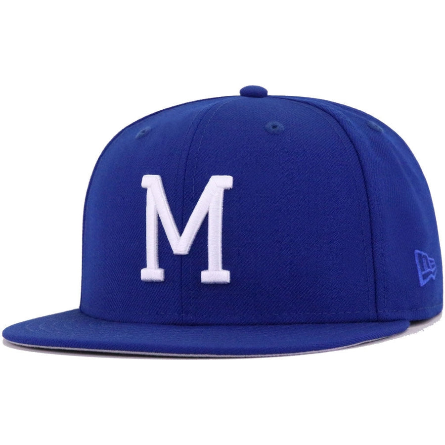 This New Era Milwaukee Braves Light Royal Blue 1957 World Series 59FIFTY Fitted Hat has a royal blue six panel structured high crown and embroidered eyelets with a royal blue fabric squatchee button. The fitted cap has a royal blue flat bill with a grey undervisor and black sweatband. The front panel features the Milwaukee Braves logo embroidery and a 1957 World Series side patch on the right panel. The left panel of the fitted displays the New Era logo and the official MLB logo embroidery on the rear crown.