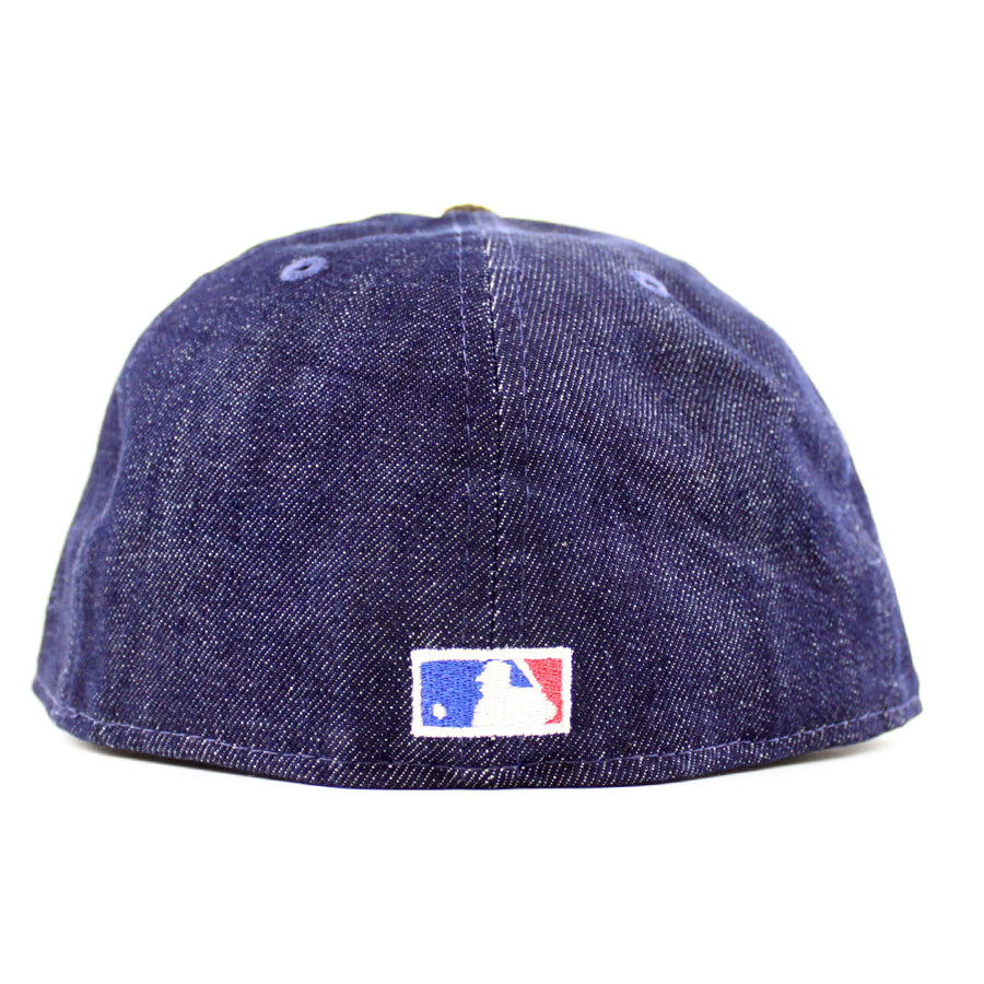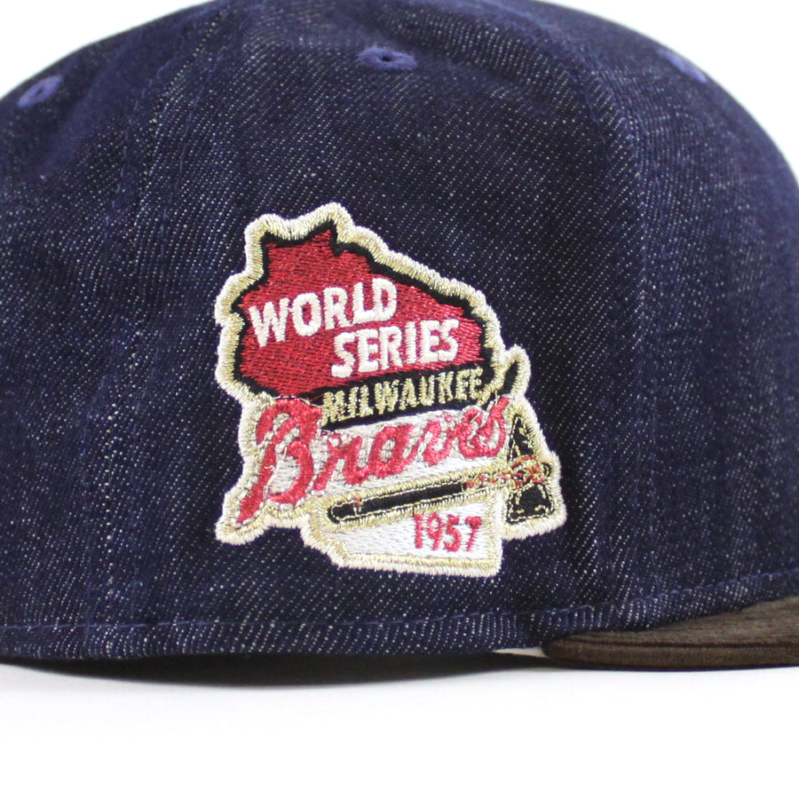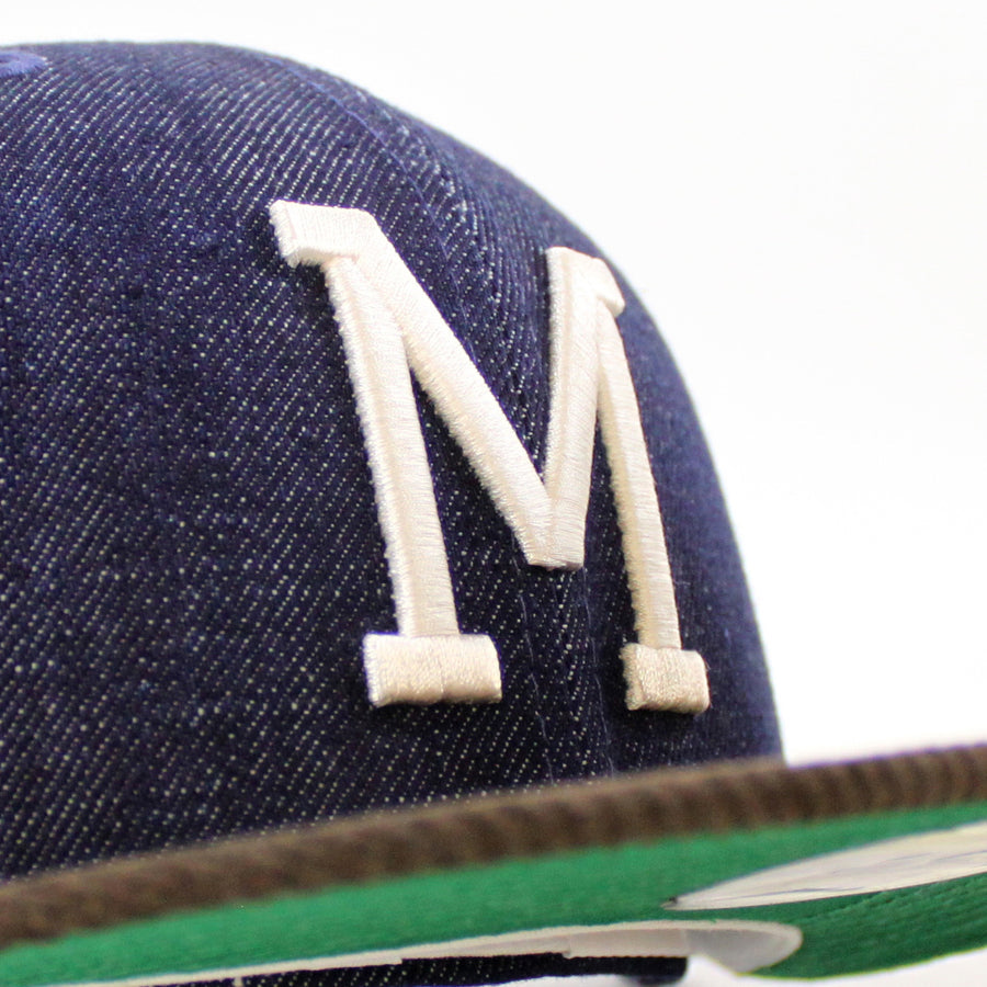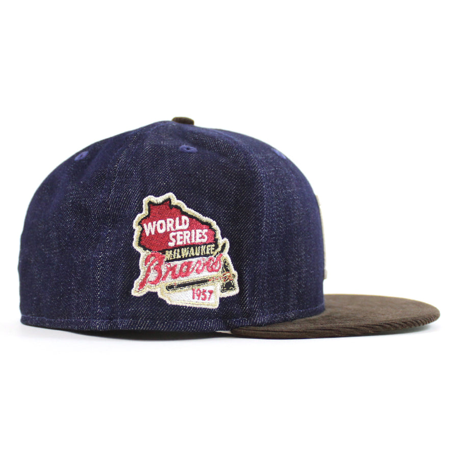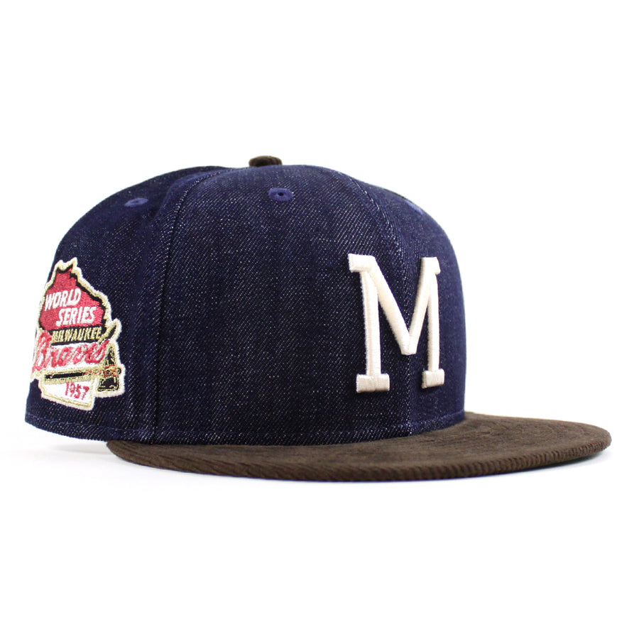 This New Era 59FIFTY Milwaukee Brewers fitted was released by Ecapcity. The fitted has a blue denim six panel structured high crown and embroidered eyelets with a walnut fabric squatchee button. The fitted has a walnut corduroy flat bill with a green bottom undervisor. The front panel features the Milwaukee Brewers logo embroidered in white threads with a 1957 World Series side patch on the right-wear side.