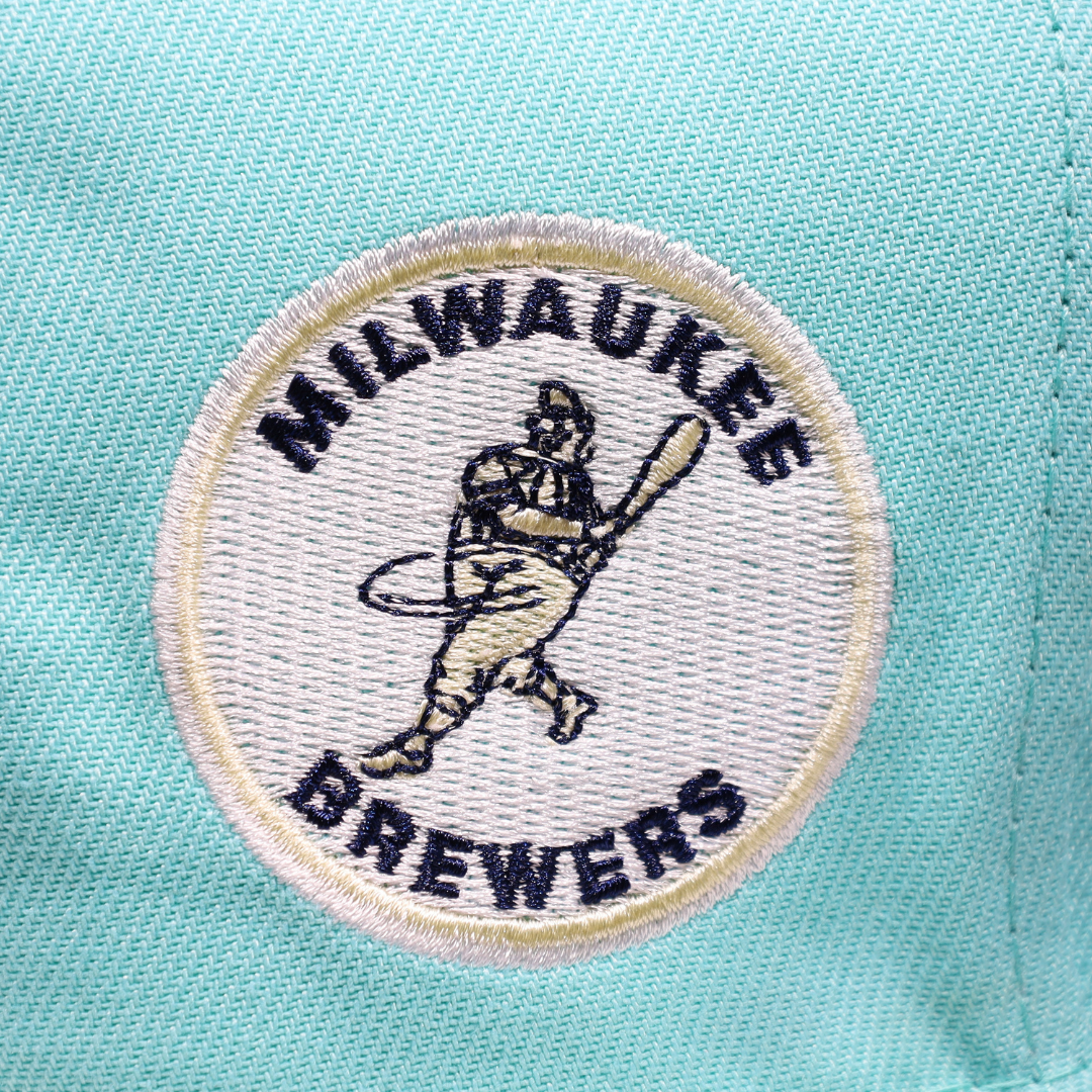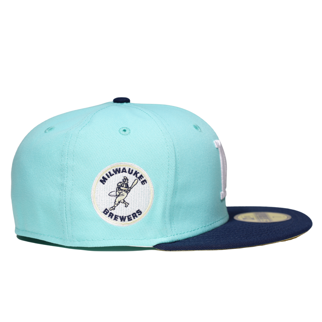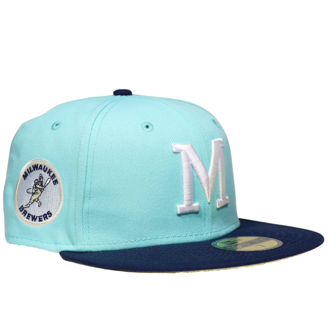 This New Era Milwaukee Brewers Classic 59FIFTY Fitted Hat has a six panel structured high crown and embroidered eyelets with a fabric squatchee button. The fitted cap has a flat bill with a sweatband. The front panel features the Milwaukee Brewers logo embroidery.