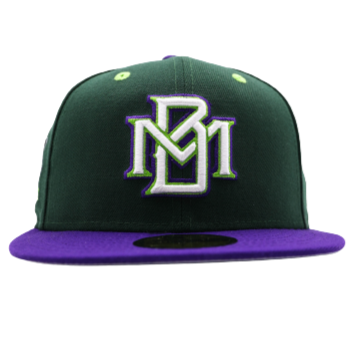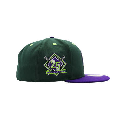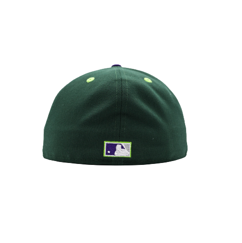 This New Era Milwaukee Brewers 59FIFTY fitted hat has a dark green six panel structured high crown, lime green embroidered eyelets and a purple fabric squatchee button. The fitted cap also has a purple flat bill. The front panel features the Milwaukee Brewers logo embroidery and a side patch embroidery on the right panel. The left panel of the fitted displays the New Era logo and the rear crown features the official MLB logo embroidery.