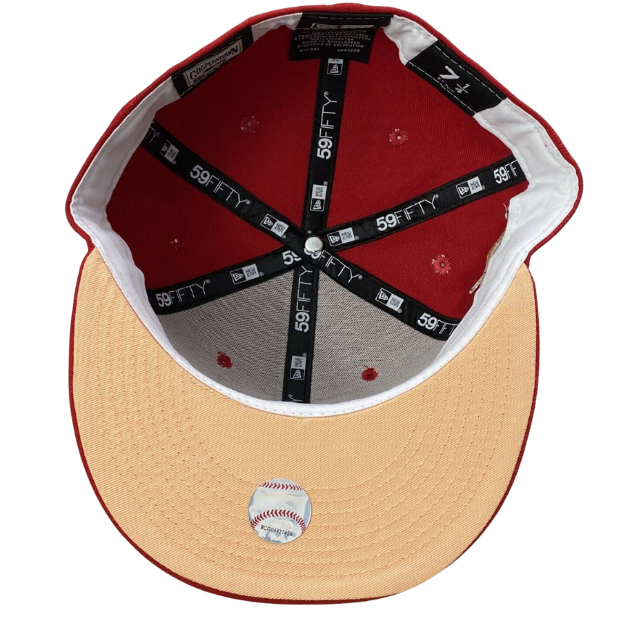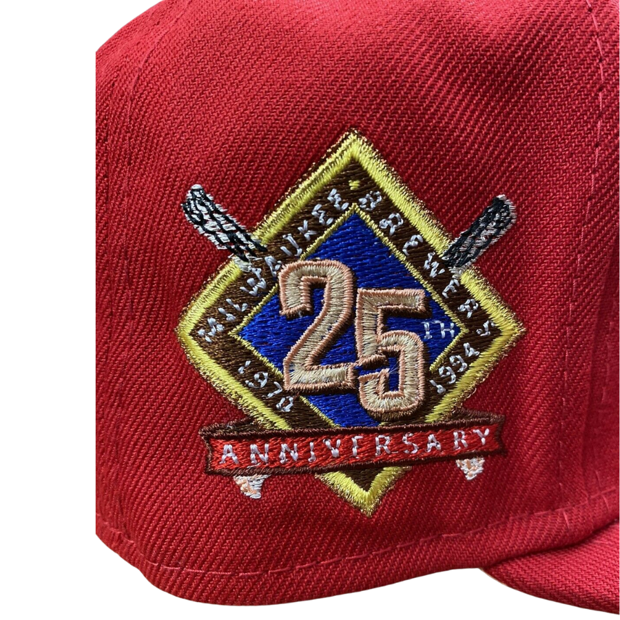 Super Mario Kart fitted hat is a My Fitteds exclusive drop. The 59FIFTY fitted cap has a red six panel structured high crown, embroidered eyelets and fabric squatchee button. The flat bill of the fitted is also red with a peach undervisor and white sweatband. The front panel features the Milwaukee Brewers "M" logo embroidered in white threads with a 25th Anniversary side patch embroidered on the right panel. This fitted cap colorway was inspired by Mario from the Super Mario Kart video game by