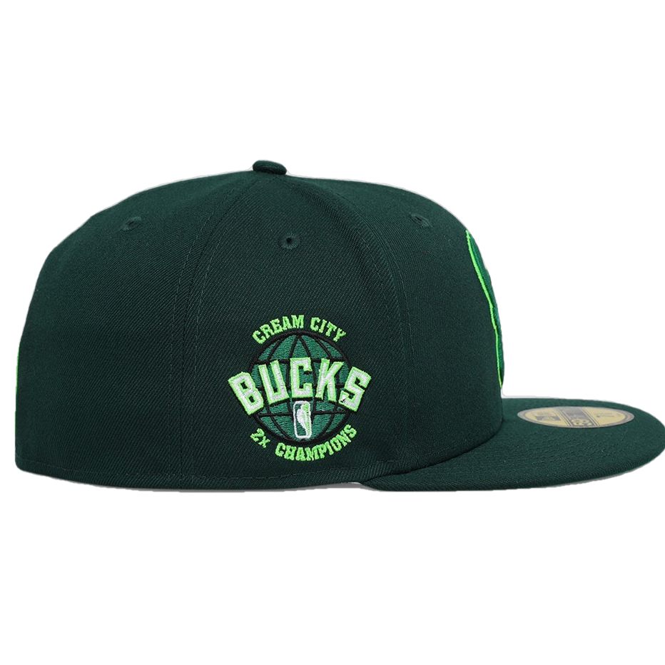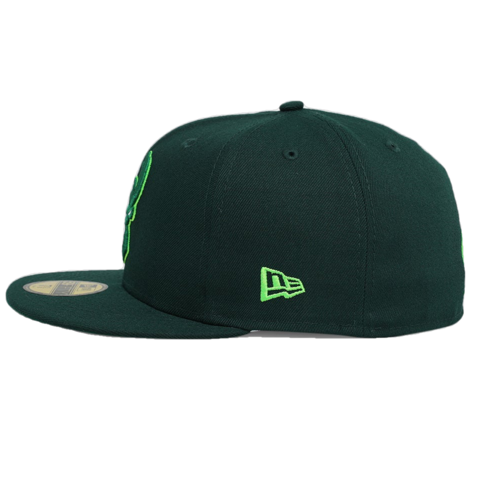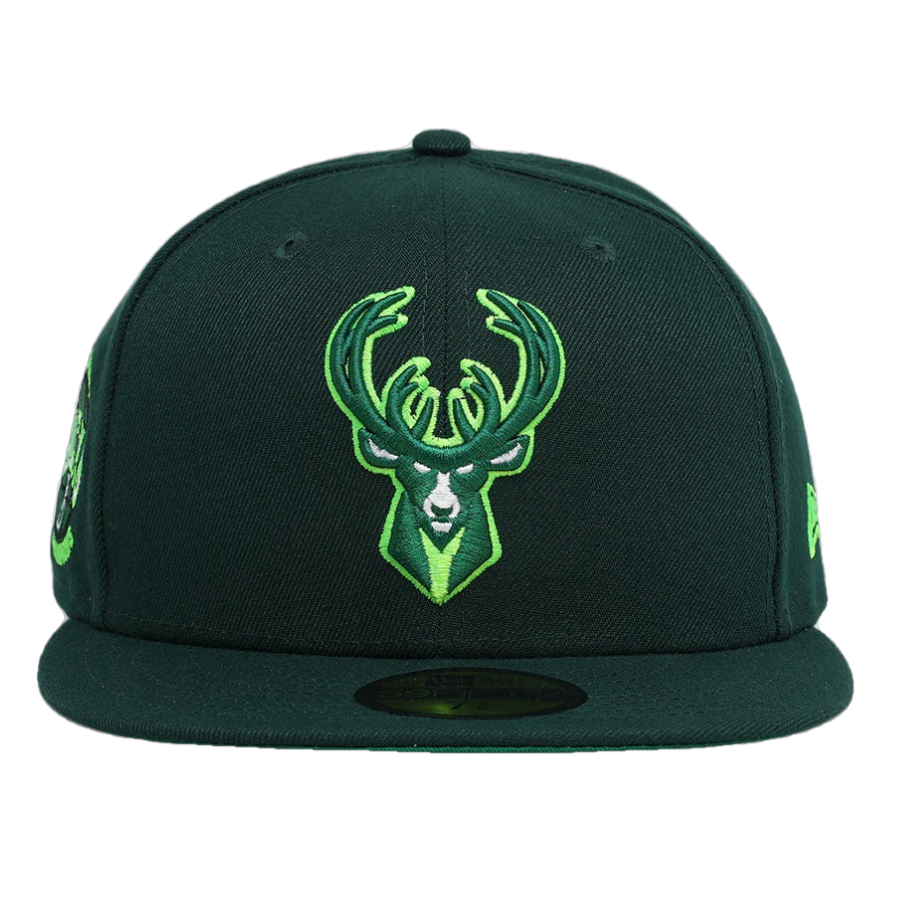 This New Era Milwaukee Bucks 'Christmas Tree' Green 59FIFTY Fitted Hat was released by Culture Kings. The Christmas Tree fitted has a dark green six panel structured high crown, embroidered eyelets and fabric squatchee button. The fitted has a dark green flat visor with a kelly green undervisor. The front panel features the Milwaukee Bucks logo embroidered in green stitching. The left panel of the fitted displays the New Era logo and the official NBA logo embroidery on the rear crown.