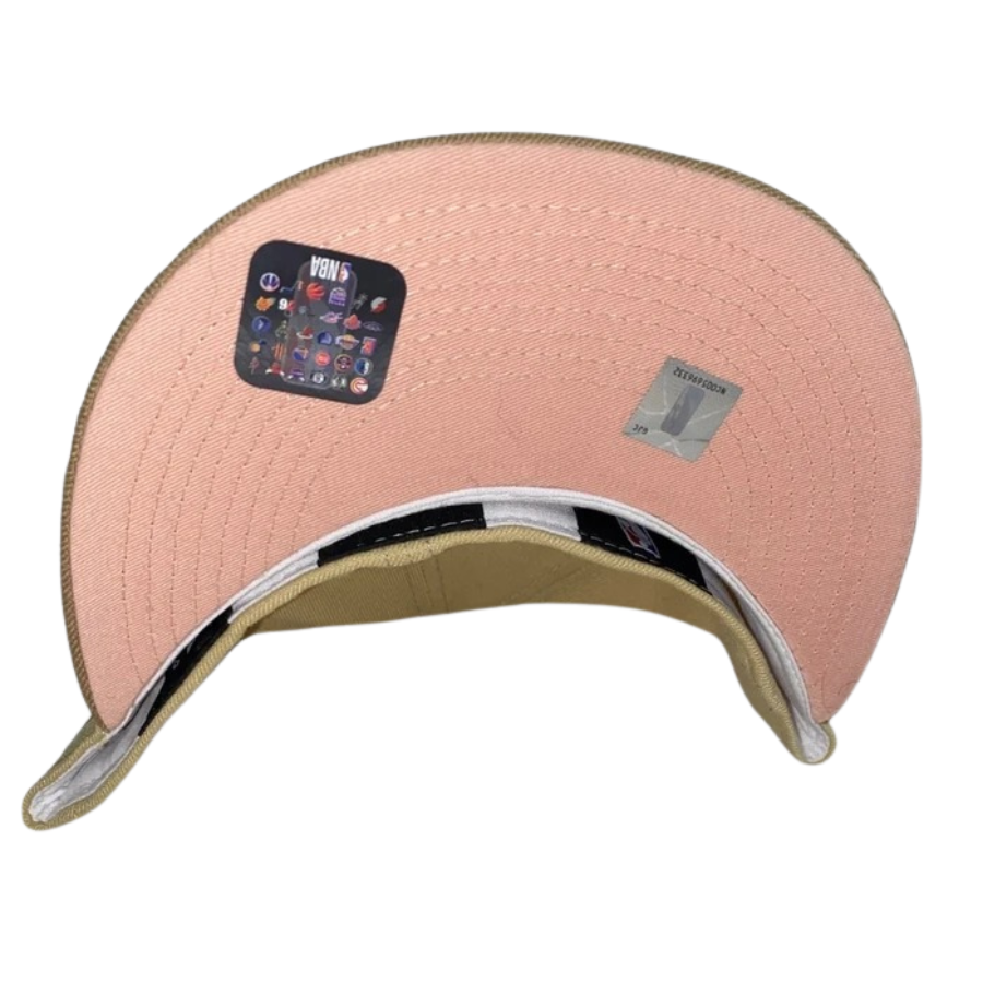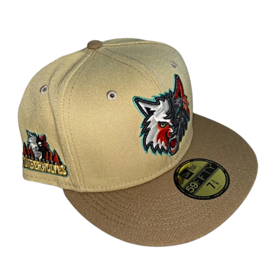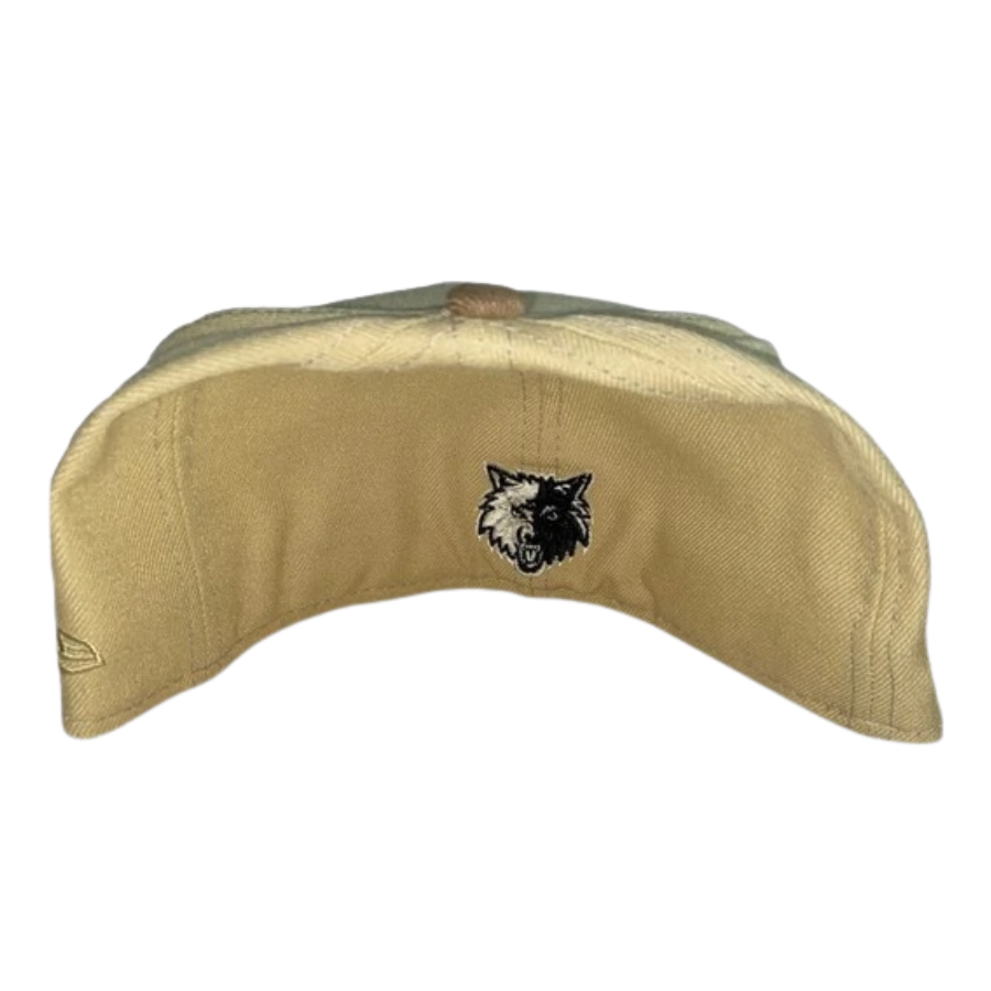 This New Era Minnesota Timberwolves 'Okami' 59FIFTY fitted hat has a tan six panel structured high crown, tan embroidered eyelets and a khaki fabric squatchee button. The fitted cap also has a khaki flat bill with a pink undervisor and white sweatband. The front panel features the Minnesota Timberwolves logo embroidery and a side patch embroidery on the right panel. The left panel of the fitted displays the New Era logo and the rear crown features the official NBA logo embroidery.