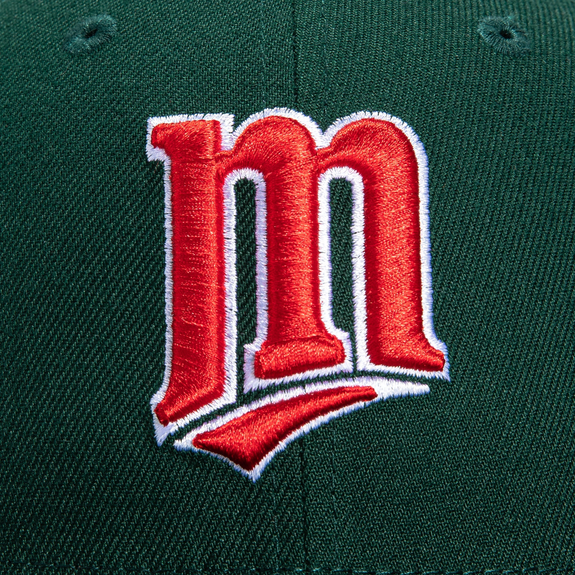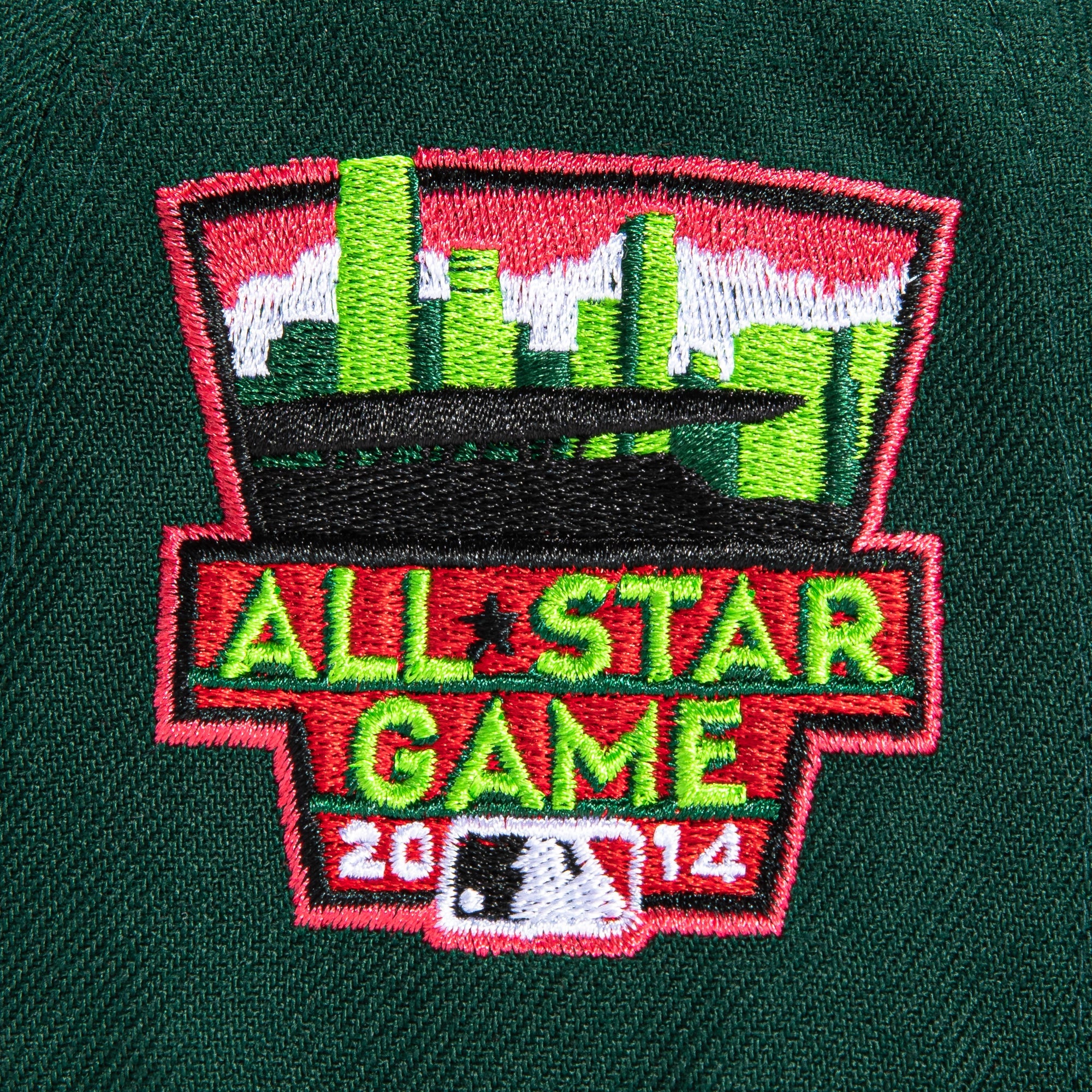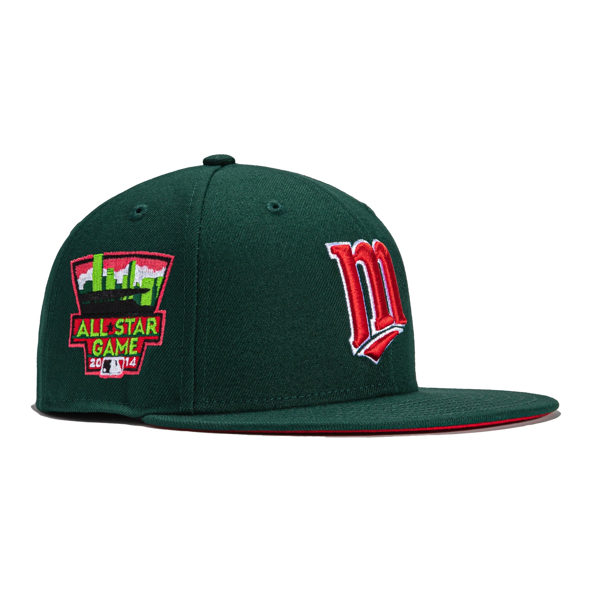 This New Era Minnesota Twins 2014 All-Star Game 'Watermelon' 59FIFTY Fitted Hat was originally released by Hat Club. The fitted has a dark green six panel structured high crown, embroidered eyelets and fabric squatchee button. The flat bill of the fitted cap is also dark green with a red bottom undervisor. The front panel features the Minnesota Twins logo embroidery and a side patch embroidered on the right panel. The left panel of the fitted displays the New Era logo and the official MLB insignia embroidered on the rear crown. The fitted hat colorway is inspired by the colors of a watermelon.