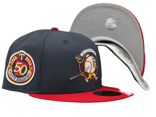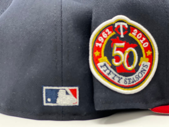This New Era Minnesota Twins 59FIFTY fitted hat was released by Sports World 165. The fitted has a navy blue six panel structured high crown and embroidered eyelets with a red fabric squatchee button and flat brim. The under brim of the fitted is grey with a white sweatband. The front panel features the Minnesota Twins bomb squad logo embroidery and a 50th Anniversary side patch on the right-wear side.