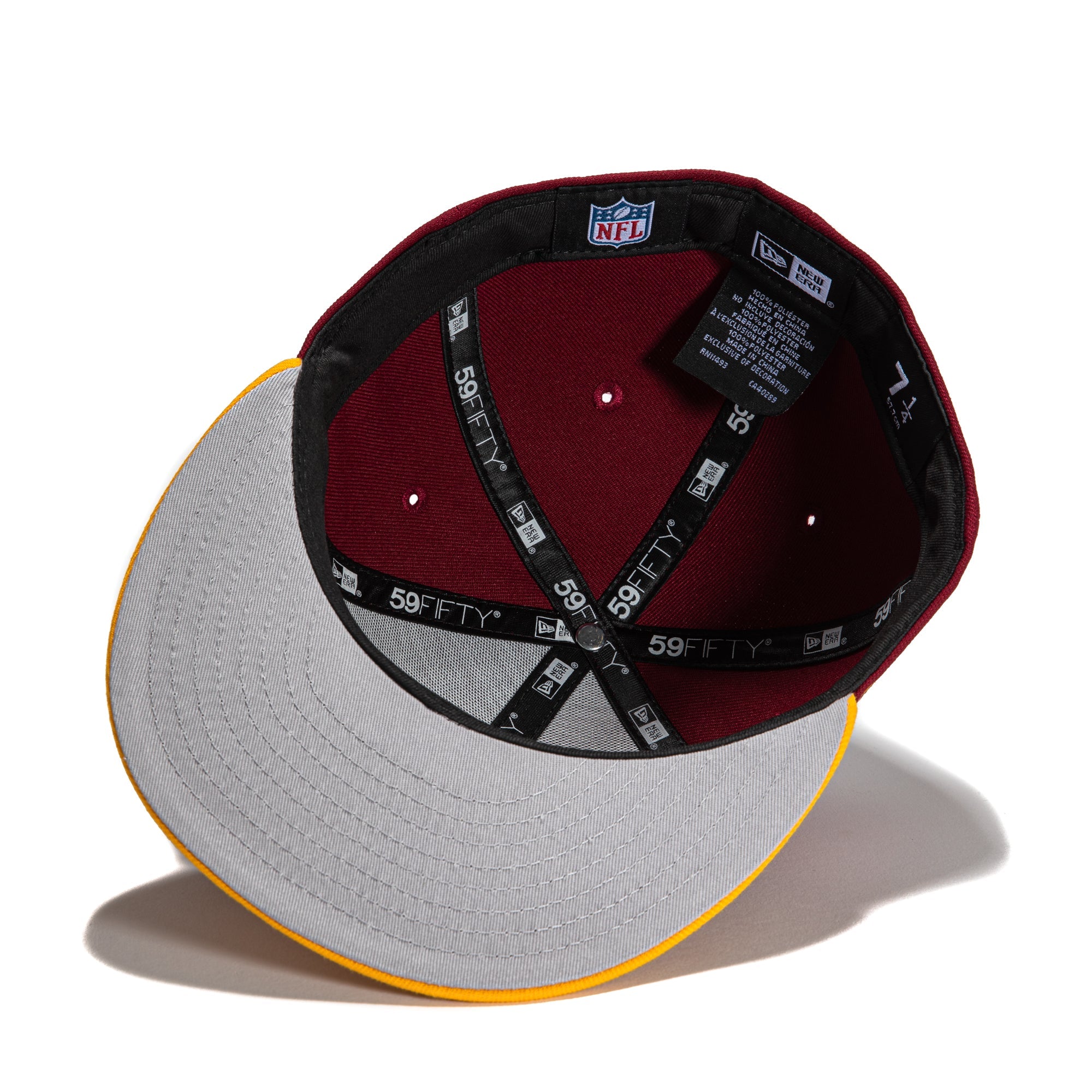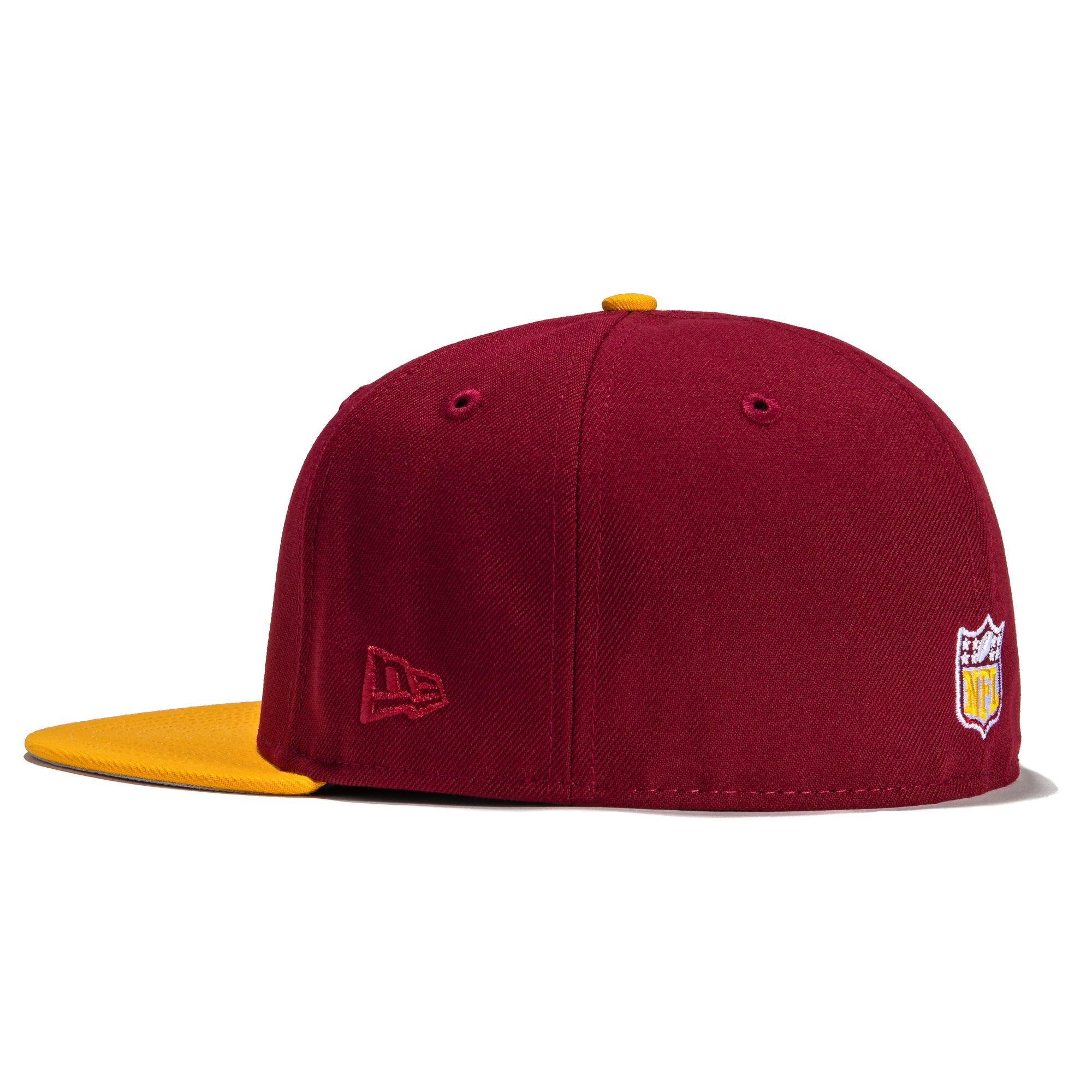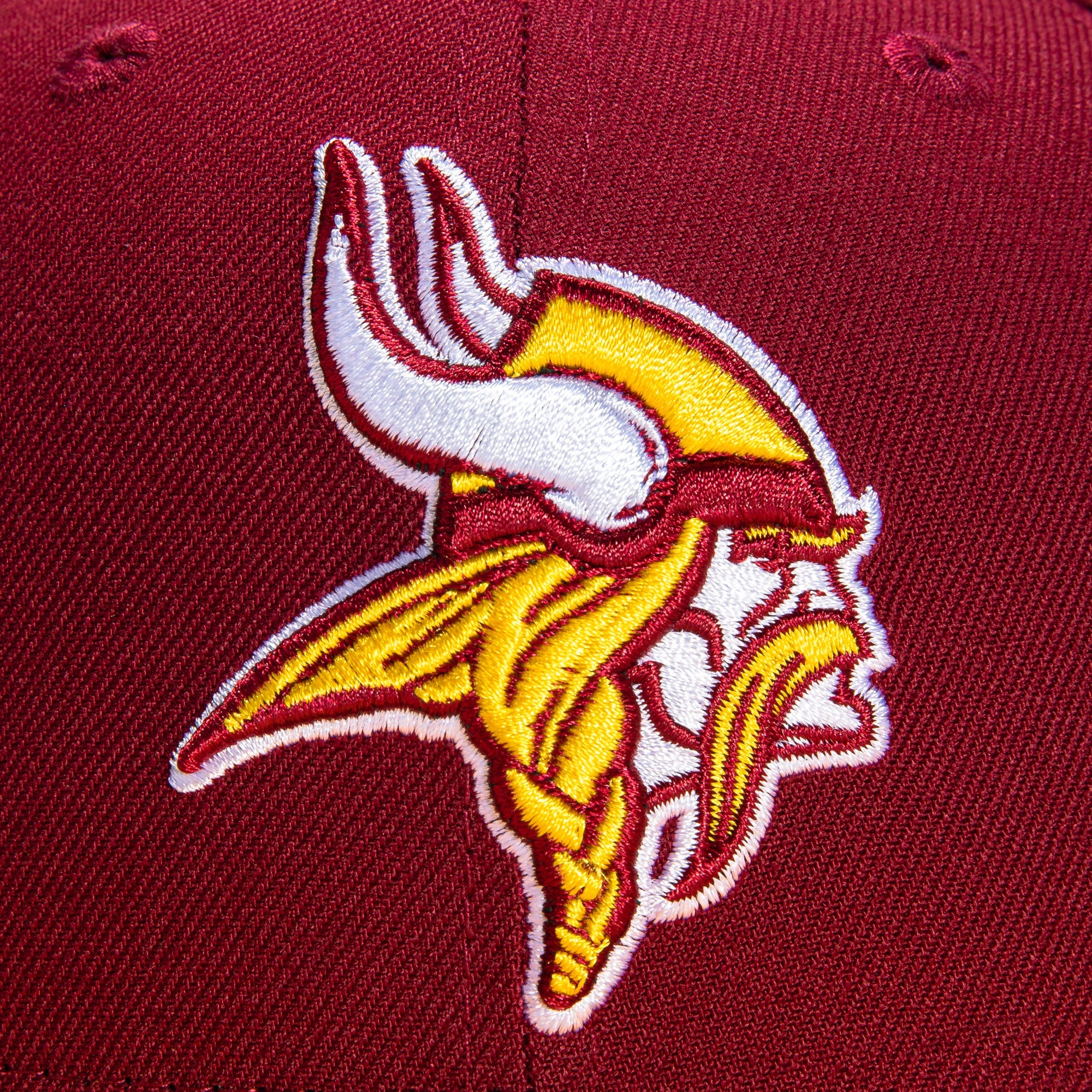 This New Era Minnesota Vikings Burgundy/Yellow 45th Anniversary 59FIFTY Fitted Hat is a Hat Club exclusive. The fitted has a cardinal red/burgundy six panel structured high crown and embroidered eyelets with a gold/yellow fabric squatchee button. The fitted cap has a gold/yellow flat bill with a grey undervisor and black sweatband. The front panel features the Minnesota Vikings logo embroidery and an Anniversary side patch embroidery on the right panel. The left panel of the fitted displays the New Era logo and the official NFL shield embroidery on the rear crown.