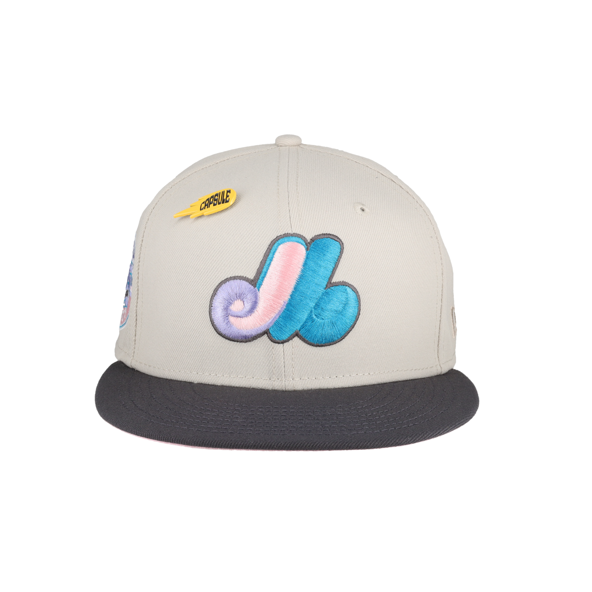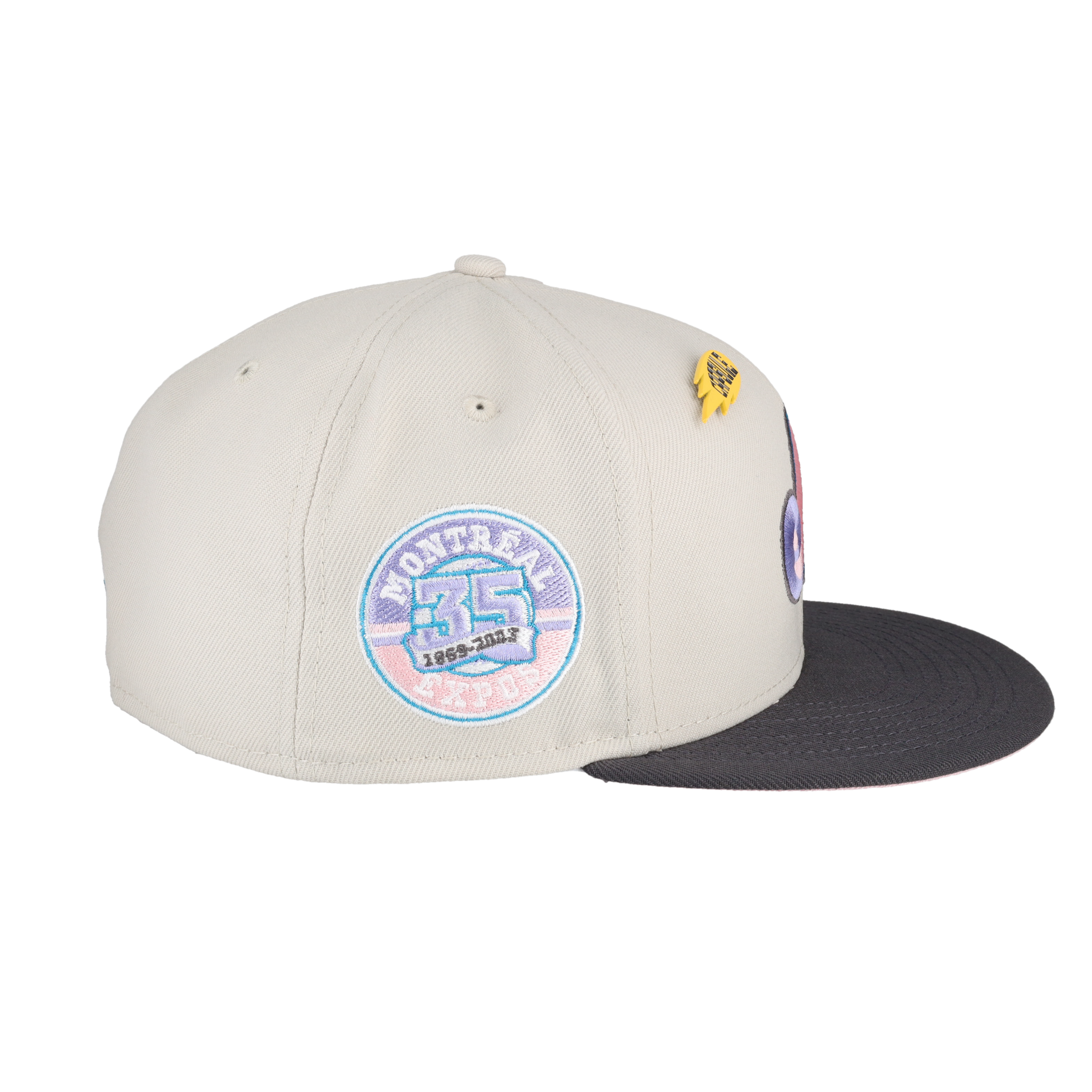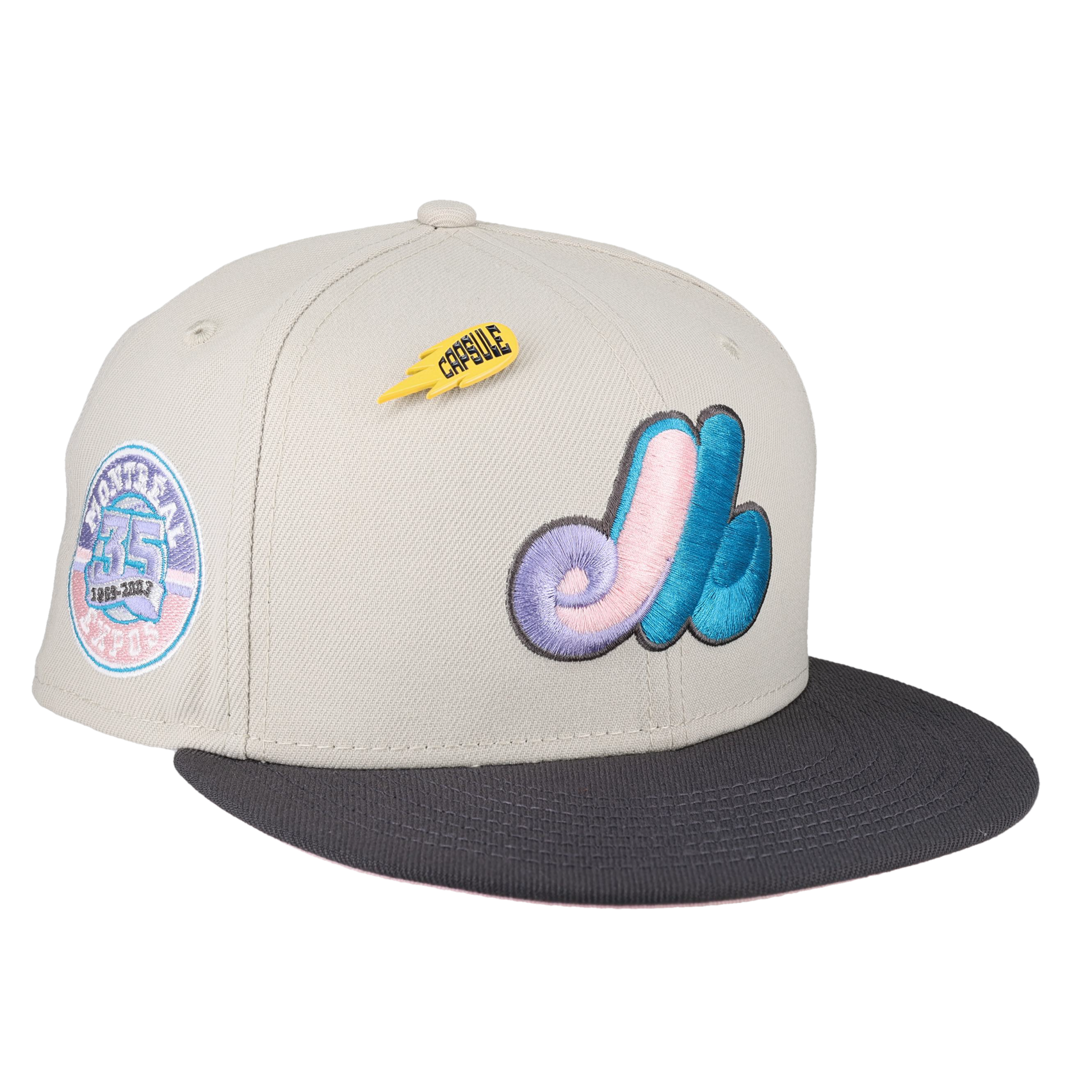 This New Era Montreal Expos 'Comet' 35 Years 2023 59FIFTY Fitted Hat was released by Capsule. The fitted has a chrome six panel structured high crown, embroidered eyelets and fabric squatchee button. The flat bill of the fitted cap is black with a pink bottom undervisor. The front panel features the Montreal Expos logo embroidery and a side patch embroidered on the right panel. The left panel of the fitted displays the New Era logo and the official MLB Batterman logo embroidered on the rear crown.